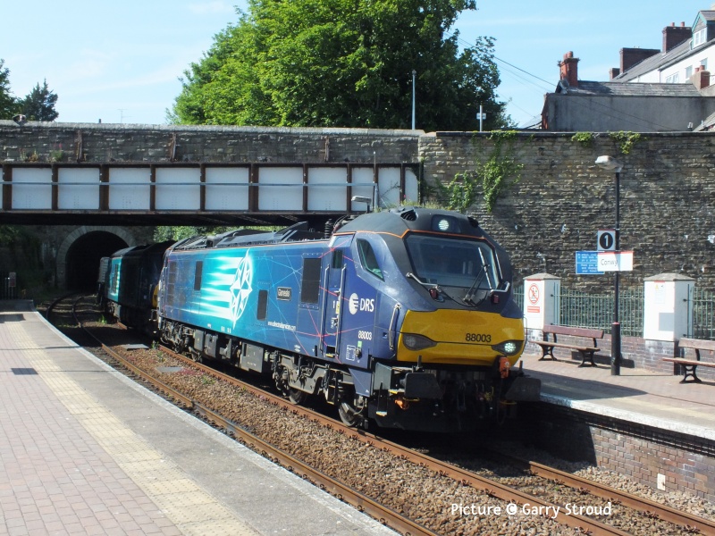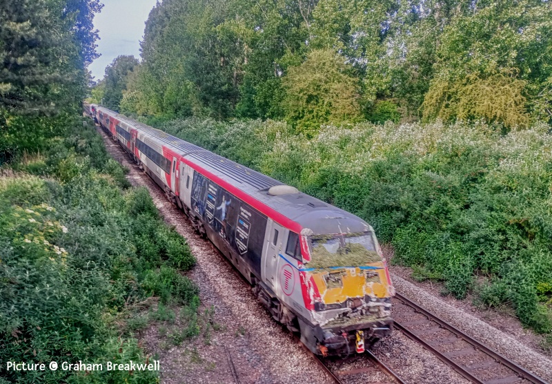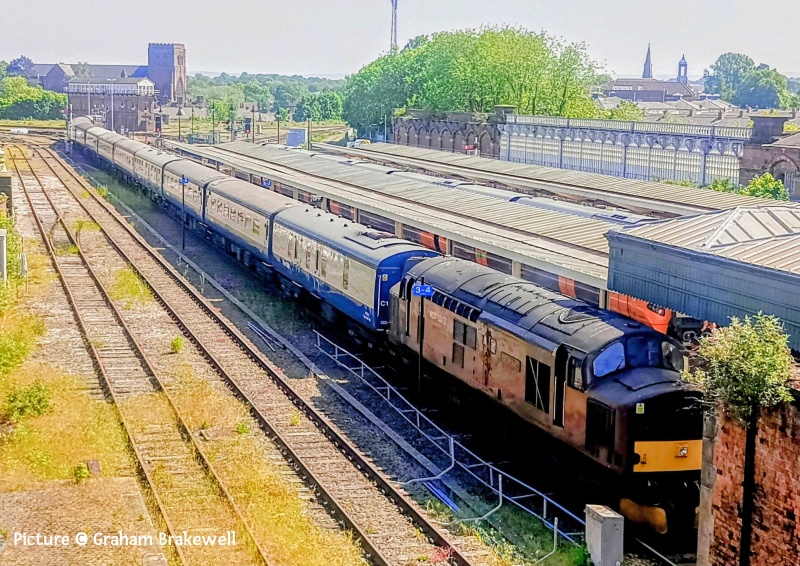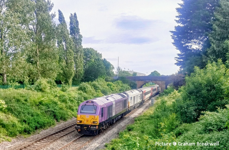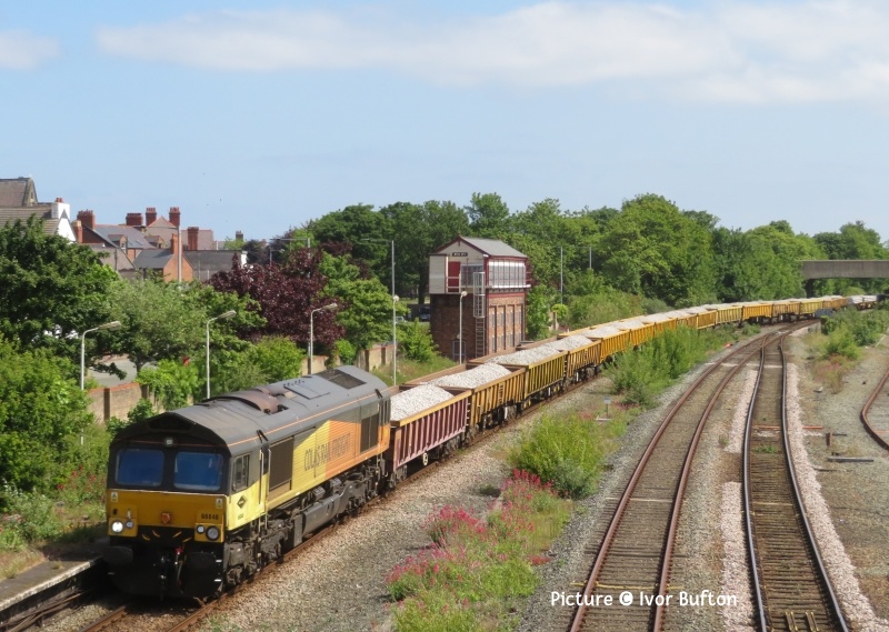 ![]() 22 May saw a load of stone dispatched from Penmaenmawr by DC Rail, not as we expected, to London, but north to Leyland on the West Coast line, with 60 055 Thomas Barnardo. Photograph by Logan Humphreys. News Pictures![]() 66 414 enters Llandudno Junction, with the 4D14 from Crewe Basford Hall yard with slate waste empties on 16 May (Garry Stroud). ![]() In the sidings (Logan Humphreys). ![]() 57 313 and 57 601 pass Conwy on a Northern Belle 'Spirit of Travel Lunch', 16 May (Logan Humphreys) ![]() 68 008 Avenger and 88 003 Genesis pass Cadnant cutting, Conwy on 19 May as the outward run 6D43 Crewe to Valley flasks ... ![]() ... The return run was not top-and-tailed as expected as was the outward run but double-headed with 88 003 pass through Conwy station with the 6K41 return Valley to Crewe flasks. These runs are made every few months to secure DRS's paths in case of any further work on the Coast line. (Garry Stroud) ![]() Entering Llandudno Junction on 21 May, DCRail 60 055 heads for Penmaenmawr, with the 6D90 13:13 Chaddesden sidings, Derby to Penmaenmawr quarry, empty for stone (Garry Stroud). ![]() UK Railtours ran an excursion on 24 May called 'The Soul Arranger' departing from London Euston at 07:26 to Aberystwyth as 1Z47. Above, 97 303 which had attached at Shrewsbury station with 37 685 inside, passing Meole Village with both locos on full power. The explanation for the excursion name is relevant to the optional trip on the Vale of Rheidol Railway to Devil’s Bridge where legend has it that the Devil constructed the bridge for a lady and her cow in exchange for her soul! ![]() On 25 May the New Measurement Train visited the Coast, seen here at Gypsy Corner near Bangor with 43 062 leading, with the driver apparently trying to clear the windscreen of dust and insects ... ![]() ... 43277 on the rear (Peter Basterfield). Little effort seems to made at present to clear trees from the lineside. Accident near LeominsterAround 10:40 on 22 May at a User Controlled Crossing near Nordan Farm, just north of Leominster train 1V37, the 08:30 from Manchester Piccadilly to Cardiff Central struck a loaded trailer being towed by a tractor. The driving trailer took the brunt of the collision, and the train came to rest with the rear coach straddling the crossing, suggesting that the train driver had seen the obstruction from a distance, on what was a straight section of track. Also, the train would have been slowing for the stop at Leominster. There was no derailment, and only a small number of serious injuries. The tractor was detached from the tractor and appears undamaged. Fortunately it was possible to stop a northbound train at Leominster. There were two people in the cab, a Trainee Driver and a Trainer, we understand that neither was seriously injured. The tractor driver has been arrested and released on bail, and the Rail Accident Investigation Branch will have been notified. Trains were terminated at Shrewsbury and Hereford with bus replacements in between with train services gradually restored late the following afternoon. The train was towed back to Crewe depot as 5Z02, the 16:15 from Woofferton, where there was once a station, closed in 1961, but the signalbox remains, controlling a loop and crossovers. Below are some images as it passed Shrewsbury Golf Course, taken by Graham Breakwell. ![]() 67 007 towing 67 029 Royal Diamond and its five coaches with DVT 82229 on the rear. 67 007 was recently purchased to act as a 'Thunderbird' to rescue stranded trains. It is not fitted for the equipment needed to work 'push-pull a normal passenger train. ![]() Damaged 82229. ![]() Coach roofs covered in grass from the trailer. Fortunately it was carrying grass for silage and not a more unpleasant material. The procedure with such crossings is that the gates on both sides must be kept closed when not in use, and if a person wishes to cross the with a vehicle, they must contact the signaller on the telephone provided for permission. When the signaller estimates that there is time between train movement this is granted, and the person in charge of the vehicle should promptly open both gates, then take the vehicle across, then close both gates. This procedure with the gates also applies to walkers, with no requirement to contact the signaller. A weak link in this procedure is that if for some reason a vehicle comes to a stand on the crossing, or moves too slowly, a collision or near-collision can occur. Another is that the signaller might wrongly estimate the time available. In the six miles between Leominster and Woofferton, there are nine user-worked crossings. An ORR document from 2019 is worth a look. ![]() At Crewe en route to the Electric depot (Lee Stanford). Miscellany![]() The view from Colwyn Bay's truncated pier, with 197 109 passing with the 12:52 Llandudno - Manchester Airport. Dominating the view up towards the well-known photo spot is the block of 29 apartments which replaced the Hotel Seven Degrees, so named because of the angles used in its construction. It made for an unusual concept, but from the builder's point of view, proved 'a terrible waste of material'. (Greg Mape). ![]() Bob Greenhalgh writes: 'On Saturday 24 May I had the honour of being Llanuwchllyn signalman at the Bala Lake railway. Here is a photo of Hunslet 779 Holy War, passing diesel Meirionnydd, as she steams into Llanuwchllyn station.' Weekend work - seen by Ivor BuftonWeekend engineering work often gives the opportunity for something different photographic wise, and the weekend of 17th / 18th May offered just that. Engineering work was taking place in the Llandulas - Colwyn Bay area which necessitated a line possession from Rhyl to Llandudno Junction, The works trains crossed from the Down to the Up at Rhyl and entered the possession working wrong line toward Colwyn Bay, Below I have tried to capture the scene at Rhyl on 17th May. ![]() 70 803 hauling 6C21 05:50 Basford Hall Yard to Rhyl slows on the approach 