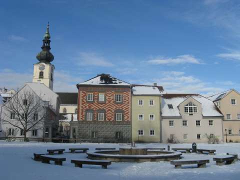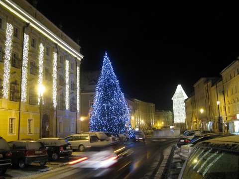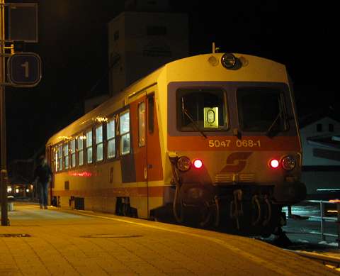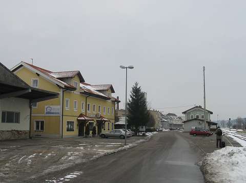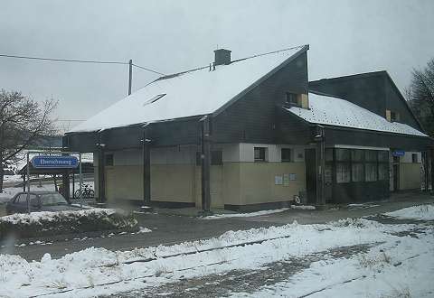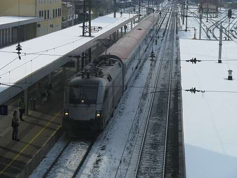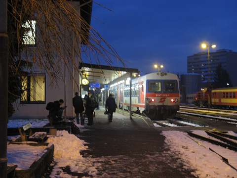 Upper Austrian rails in the snow, November 2008![]() Our Advent Austrian Adventure of November 2008 started in the old Roman capital of Wels (above.) We stayed for a couple of nights here, at the nice old Hotel Gösser Brau which was running its own Christmas Market in the back yard! ![]() Recent rebuilding of this busy station on the Westbahn includes an enclosed glass footbridge from which reasonable pictures can be obtained, although with a slight colour cast. This is 1016 034 in Railjet livery. ![]() Diesel loco-hauled local trains are getting hard to find, especially in daylight: we travelled west to Steindorf bei Straßwalchen to catch this one, the 15:05 to Braunau am Inn, with 2016 063. In the bay is 2068 021, the station shunter. ![]() This train is not well-loaded, being the return working of the 14:05 'school train' from Braunau, so I had chance to take some interior details of the Schlleren vehicles. Type Bp no. 50 81 29 35 005-6 which is one of the very first batch, bult in 1965 and still going. These early batches had basic-style furnishings, and were initially painted green: the upholstery was also green at that time. See our Schlieren coach page. ![]() The various colours of the interior. ![]() The same vehicle at Braunau. It has been repainted into simplified livery at some stage, but the exterior paintwork is in poor condition. ![]() On arrival at Braunau at 15:50, we found a freight train in the sidings, with 2016 073. ![]() Our coaches were removed to the sidings by Braunau pilot 2070 022. ![]() 5047s came and went as darkness fell. Extreme overcrowding could be noted on these evening peak workings. ![]() We stayed for a few nights at Obernberg - Altheim on the line from Braunau towards Ried, enabling a photo survey of the station and also access to the nearby thermal spa of Geinberg. This station is 10 km (!) from Obernberg, and 2 km from Altheim .... ![]() ... but adjacent to the station (left, above) was the Pension Gadermair, a very pleasant B & B, and evening meals can be taken at the friendly Gasthaus Rabler, just along the road. ![]() The station has some freight facilities, including this Lagerhaus : the pipe crossing the road is for loading grain wagons. ![]() Geinberg spa is served by the halt at Geinberg, about 10 minutes walk uphill to the village and spa, but well worth a visit. The water is lovely and warm, even in the open air pool. Above, the view from the village churchyard, with a 5047 passing. ![]() Night scene at Obernberg-Altheim. ![]() A snowy walk to the river Inn took us past this church at Kirchdorf am Inn, built from the rock known tuffstein, in English 'tufa' a rock created when carbonate minerals are precipitated out of spring water. ![]() An artistic view across the Inn flood plain near Kirchdorf. ![]() On to the crossroads station of Ried im Innkreis. 2016 070 is on a lunchtime local freight trip. ![]() 2016 073 engages in a little shunting. ![]() Station ambience. ![]() From Ried we travelled by 5047 over the hilly 'Hausruck' line to Attnang-Puchheim through a one-time coal mining area. This modern station building is at Eberschwang. ![]() Back at Wels for the overnight train, the first stage of our homeward journey. This 4024 is on a stopping service. ![]() Wels Christmas market. ![]() The Wasserturm illuminated. ![]() Our train was the legendary 'Orient Express', although we were travelling in the Amsterdam portion. Comments welcome at info@davenportstation.org.uk |