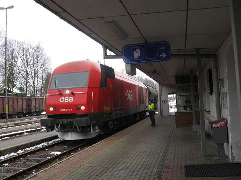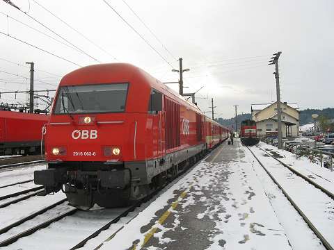 Passenger workings by Class 2016 locos of Wels depot, Mon-Fri, December 2008 Table 142: 3108 06:15 Linz Urfahr - Rottenegg 06:36 3111 07:07 Rottenegg - Linz Urfahr 07:29 in Summer 2009 an additional pair of trains operated as loco-hauled, to cater for cyclists: 3180 09:30 Linz Urfahr - Aigen Schlägl 11.01 3187 11:14 Aigen Schlägl - Linz Urfahr 12.59 Table 133: 6374 06:01 Grein Bad Kreuzen - Linz 07:05 6381 16:02 Linz - Grein Bad Kreuzen 17:13 Table 151: 5944 06:21 Wels - Simbach 07:45 966 06:53 Linz - München 09:55 5970 16:40 Linz - Braunau am Inn 18:23 963 17:48 München - Linz 21:09 5943 06:10 Braunau am Inn - Linz 07:55 Table 190: 5800 04:30 Braunau am Inn - Salzburg 05:50 5804 05:49 Braunau am Inn - Salzburg 07:06 5802 05:22 Braunau am Inn - Steindorf 06:11 5803 06:31 Steindorf - Braunau am Inn 07:22 5822 14:05 Braunau am Inn - Steindorf 14:50 5819 15:05 Steindorf - Braunau am Inn 15:50 5826 16:02 Braunau am Inn - Steindorf 16:52 5823 16:38 Salzburg - Braunau am Inn 17:53 |