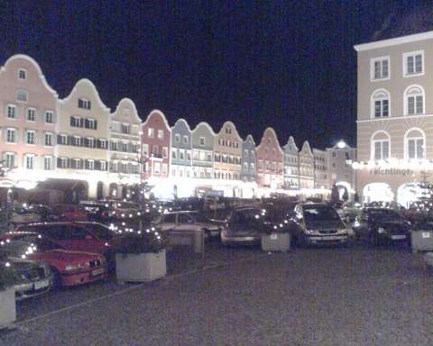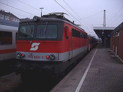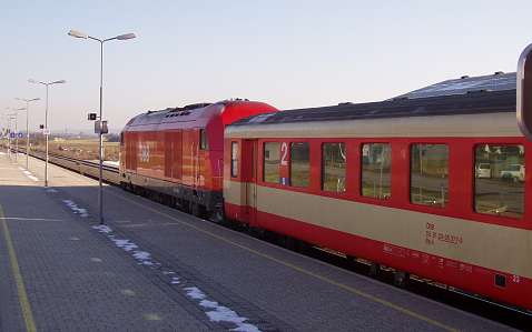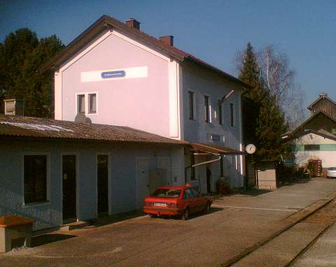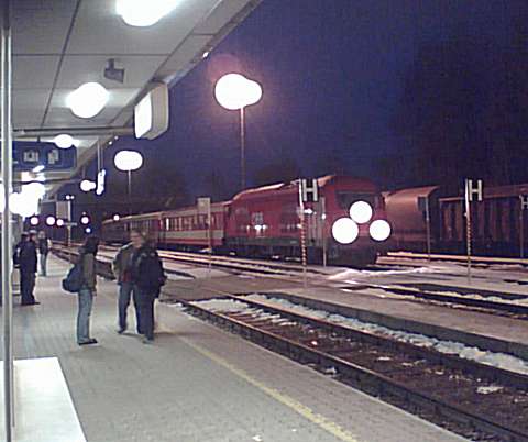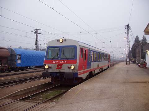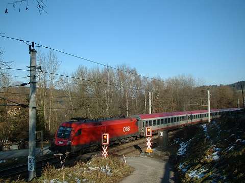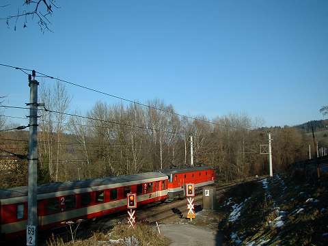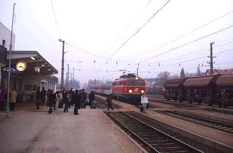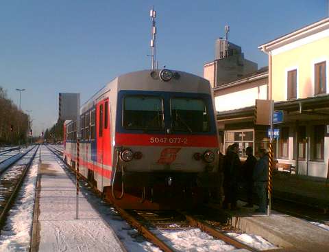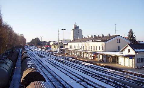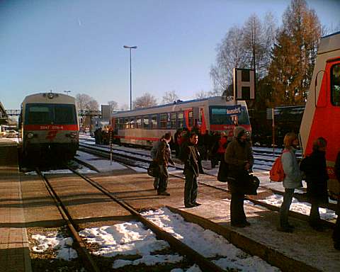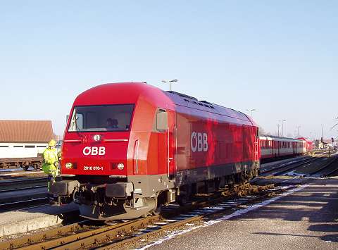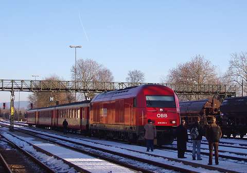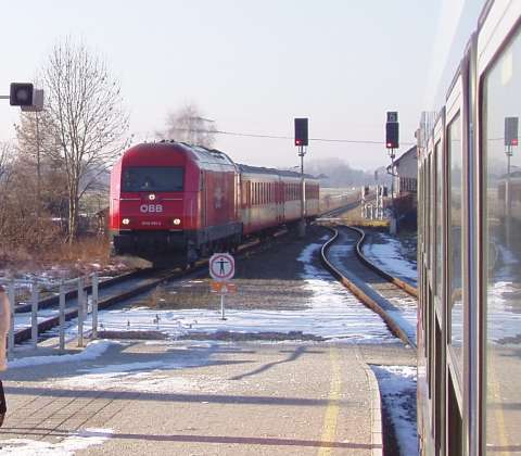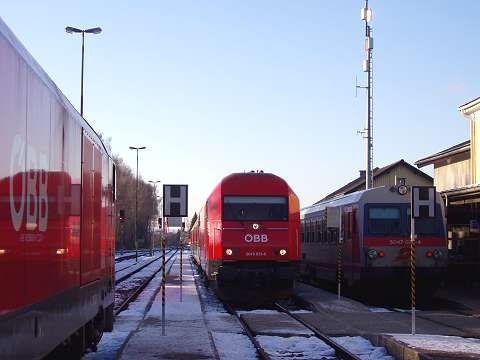 Around 1990 my wife and I made a number of journeys to Austria in the sleeping cars of Train 225, the Oostende - Wien Express, which is sadly no longer an option. It was a feature of this train that fresh bread rolls would be provided for breakfast, and these would be loaded on to the train during its early-morning call at Schärding, the first stop in Austria. That trivial fact was all I knew about Schärding until 2005, when it came to our attention that the branch lines in that area might still be a place to find short trains hauled by diesel locomotives, similar to the kind of thing I try to portray on my model railway. Further research revealed that the town itself was an attractive place with many well-kept old buildings, including the so-called 'Silberzeile' of baroque frontages in the main square, seen in my picture. So off we went, travelling by air this time, arriving on 9 December 2005 for a few days' stay. We'd like to thank all the people of the Innviertel, especially the railway staff, and the fine people at the marvellous Hotel Gugerbauer in Schärding who made us so welcome. Thanks also to Heinrich Seitner for his excellent report 'Das Rieder Kreuz' on the railways of the area on the Digitale Eisenbahn Fotoarchiv. As Mr Seitner says, little about these lines has been published on the web. |