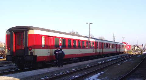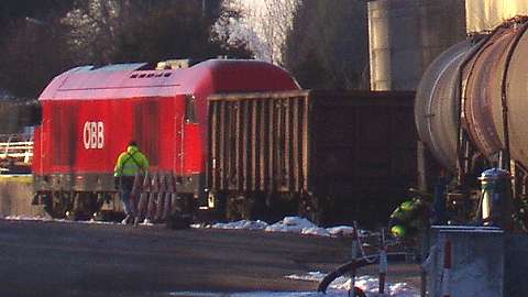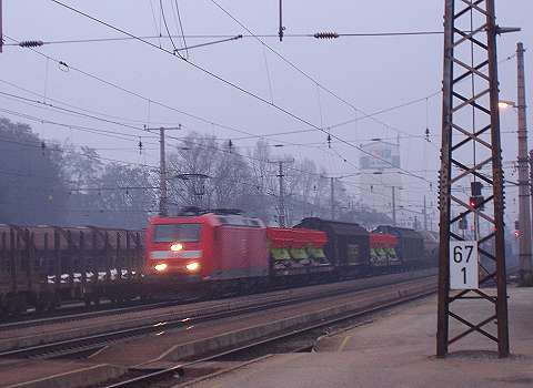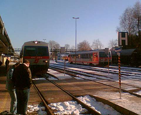 ![]() Innviertel locomotive Safari, December 2005. Above, the town square of Schärding. ![]() Here's Schärding station, with 5047 046-4, one of the railcars which are common on Austrian non-electrified branches. The station has a very traditional Austrian track layout, combined with a very well-built and well-kept modern station building. ![]() Here, on 14 December passengers head for Track 2 to board main line local train E 5913 08:07 Passau to Linz, formed of a 'City Shuttle' push-pull set powered by electric locomotive 1142 682-2. ![]() The same misty morning, A Germany-bound mixed freight passes, hauled by a German loco. This train included that staple of model railway manufacturers, a wagon loaded with wagon wheelsets. ![]() Although we saw no passenger trains worked by my favourite type of loco, the 2043 diesel-hydraulic, one did appear at Schärding each morning to deal with the local freight traffic. This is 2043 012-0 in the sidings at Schärding on 12 December.Threatened with extinction for some years now, it seems this class is making a small comeback. ![]() Schärding is a great place for railfans to watch operations; much freight loading and shunting takes place right opposite the platform, and if not much is happening there is always the station buffet! This bogie wagon has just been loaded with timber using a grab-fitted lorry, which has departed leaving the gentleman pictured here with the task of fastening the load using the straps which travel rolled-up on the side of the wagon. This involves partially unrolling each strap and then hurling it with as much force as can be mustered in the hope of clearing the load and getting it to the other side of the wagon ready to be fastened. ![]() This is the station building at Antiesenhofen befween Schärding and Ried: what a nice model it would make. ![]() So off we went in a 5047, working train R.3472 11:49, Schärding to Attnang -Puchheim, changing at Ried im Innkreis (above) - the 'Clapham Junction' of the area, where trains converge to make connections. ![]() Pasengers board R.5973 11:51 Simbach - Neumarkt (right) and we head for the Braunau-bound train R.5970, 12:11 from Neumakt on the far track; the unit on the left will start from here at 12:35 as R.3473 to Schärding. ![]() Sadly we saw no sign of any loco-hauled trains on the Schärding - Attnang-Puchheim branch, but we had great hopes of the Neumarkt-Kalham to Braunau am Inn line, which intersects it at Ried im Innkreis. ![]() At the station of Mining we wait to cross a train towards Ried, and Eureka! It's R.5975 12:55 Braunau - Neumarkt with 2016 093-3 in charge. ![]() Resisting the temptation to jump off and hurry across the platform, we contented ourselves with a couple of pictures. ![]() At Braunau, time for a very quick look around the town. Braunau is not a terminus: the line continues beyond the station, through the endge of the town and across a long steel truss bridge over the Inn river to the Bavarian town of Simbach am Inn, and beyond to Mühldorf and München with services operated by the Deutsche Bundesbahn. ![]() We returned to the station to find R.5991, the 13:55 to Neumarkt-Kalham, waiting with a 2016 at the head in track 2 (background) while 2016 070-1 (foreground) backed on to two coaches in track 1 to form the 14:02 to Steindorf bei Strasswalchen, on the Westbahn main line not far from Salzburg, Braunau's other line. Both trains were well-loaded, mostly with school students. ![]() We made our way to the Neumarkt train for the return journey to Ried in Innkreis. ![]() Alighting at Ried we encountered 2016 093-3 on its way back to Braunau with R.5974 14:11 Neumarkt to Braunau and Simbach. ![]() A quick trip across the icy platforms to take a picture of the train we'd ridden, with 2016 073-5. The Neumarkt - Simbach train waits on the left. ![]() Ried im Innkreis station features a tootbridge carrying a public right-of-way across the layout. Here's the general view from the bridge, with much freight traffic in evidence. In the distance a red speck.... ![]() ... Yes, another 2016 doing a spot of shunting in the goods depot. Oil tankers are the principal traffic. ![]() After a stroll round the town and a visit to a fine Cafe-Konitorei, we returned to the station for our railcar back to Schärding, in time to note another loco-hauled working, R.5990, 16:35 Neumarkt to Braunau, making its call. ![]() Finally a look at the main line north from Schärding to the border and Passau. These two pictures, taken by my wife Joanna on Sunday 11 December, are at a level crossing on the recommended walk along the Inn and back to Schärding. This is a Class 1016 electric hauling Eurocity EC 25, Dortmund to Budapest ... ![]() And this Class 1044 is at the head of E.5914, the 08:00 Wien - Passau 'Erlebniszug Donau'. Although a normal advertised service train, the consist of this train includes two coaches restored to original green livery, and on the rear a blue Wagons-Lits restaurant car. ![]() Across the border - not that there are any border guards or other formalities - Passau station: 1142 658-2 has just arrived with its City Shuttle set as R.5912, 09:17 Linz - Passau. ![]() The DB still uses some locos on local trains. This is RB.32164, 11:13 to Regensburg, with ex-East German loco 143 275-6 on the rear ready to depart. ![]() The Silberzeile by night - and a farewell (for now) to the Innviertel. Created December 2005. Update April 2011. |