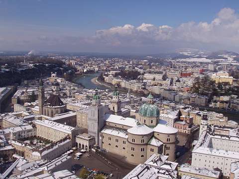 with Cathedral in the centre foreground and the Salzach river behind.