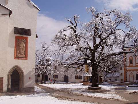 Old lime trees dominate the castle courtyard.
