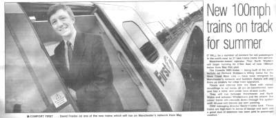 David Franks, Managing Director of First North Western, poses for a Manchester Metro News 'new approach' picture with one of his new trains. As usual the sub-editor reaches into his cliché drawer for a headline.