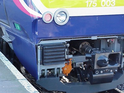 The front end of 175 003 showing the fairing removed, and the details of the Scharfenberg coupler, also used by Eurostar and Manchester Metrolink, but not by any other FNW trains ... the unit numbers are very hard to read, being white on yellow. Why not put them on the blue area below, or if this is removable and may get swapped around, why not just use black numbers instead of white? Picture by John Murray
