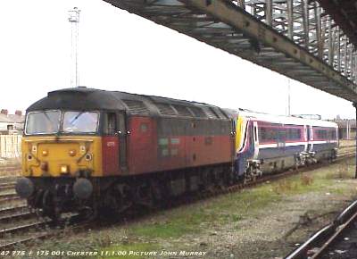 175 003 is believed to have suffered damage to its front fairing during test runs; it was seen being inspected outside Chester depot on 7 January. This was, according to Railtrack, caused by a 'bird strike.' Daytime test running was originally planned to start on 11 January, but Railtrack required a standby locomotive in case of problems, so a Fragonset Railways locomotive will be on standby as 'Thunderbird' at Stafford. It seems that the 175s cannot be allowed to rescue each other until after they have passed their tests!