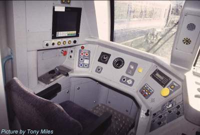 The view below shows the cab of 175 001: quite a difference from a Class 37! However, style and comfort of the driver has been achieved at the expense of a through corridor connection for use when units are coupled together. Another odd feature is the use of Scharfenberg couplers which will not allow multiple working with any of the company's other railcar types.