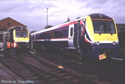 These views show two-car 175 001 (left) and three-car 175 101 (right.) The numbers are in white on the yellow front, so are very hard to discern. 175 101 has been at Kidderminster since August, fitted with test instrumentation, and has clocked up a few thousand miles of test running.