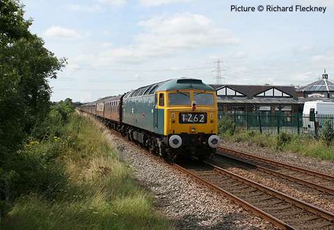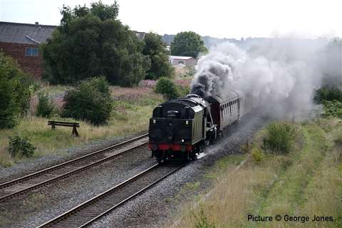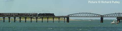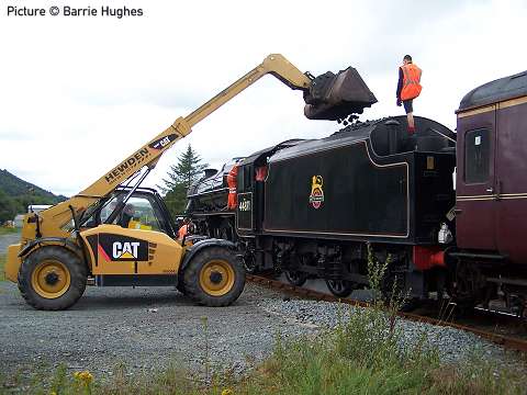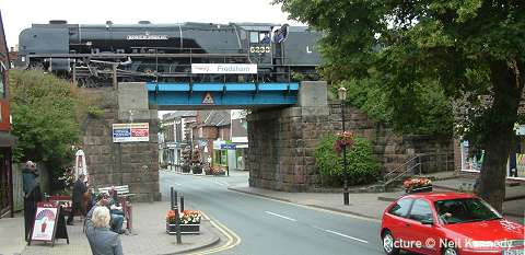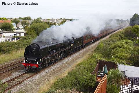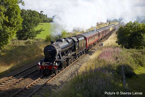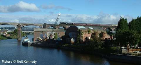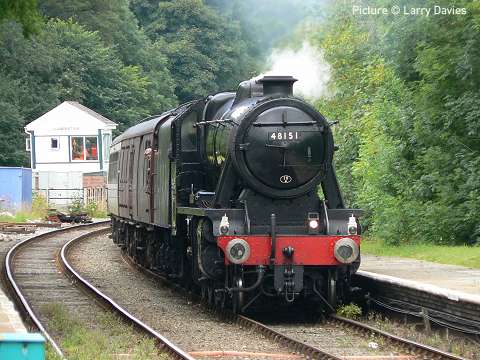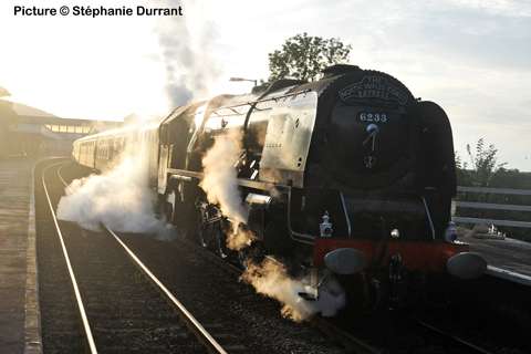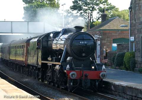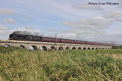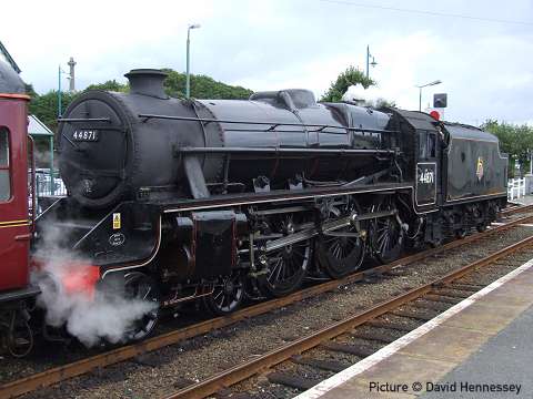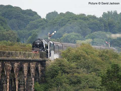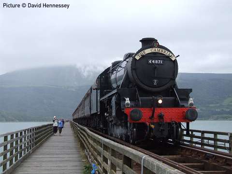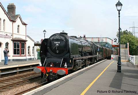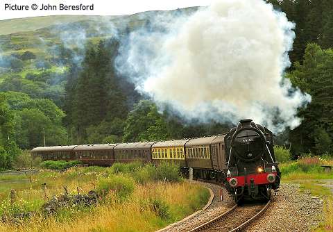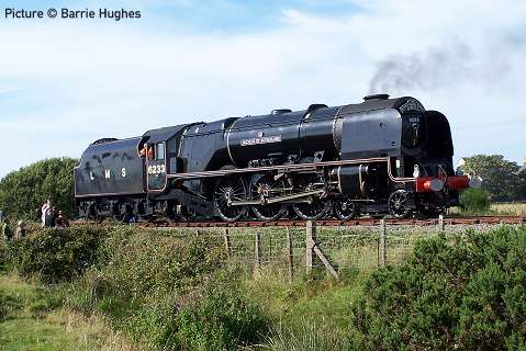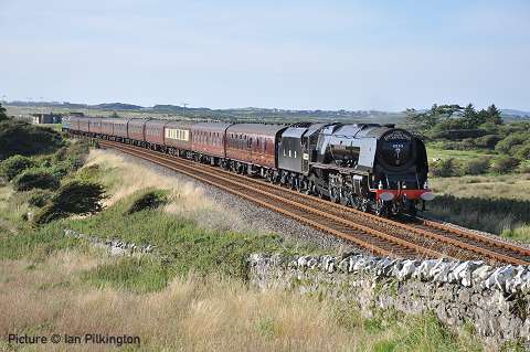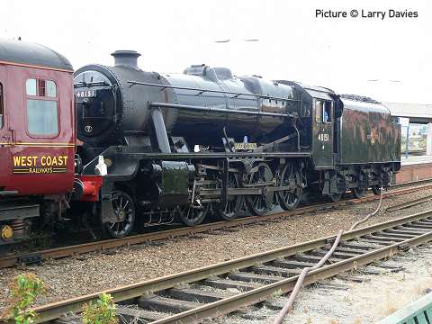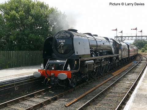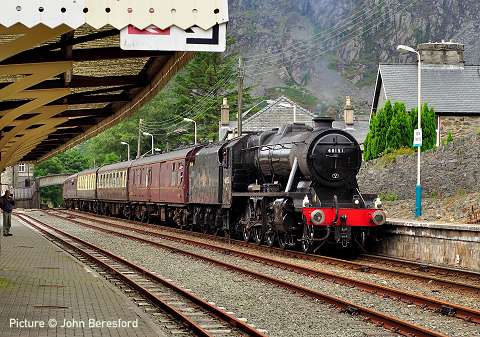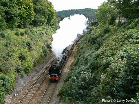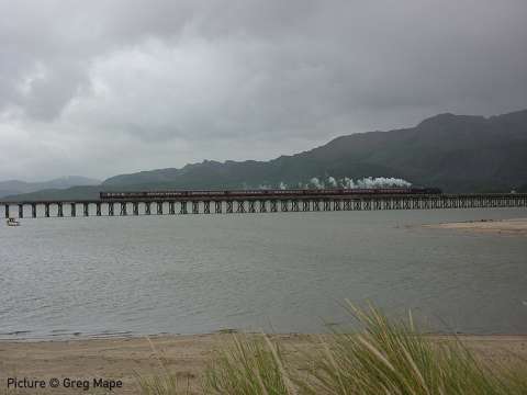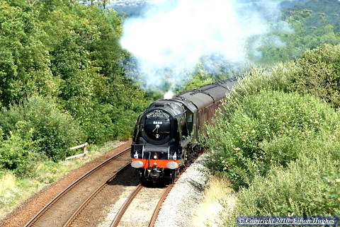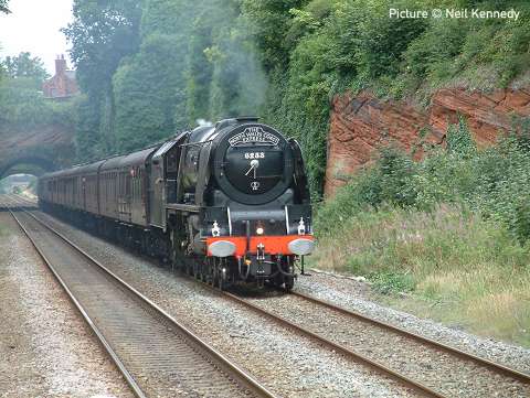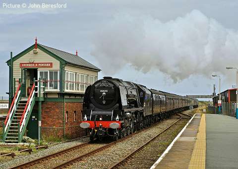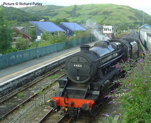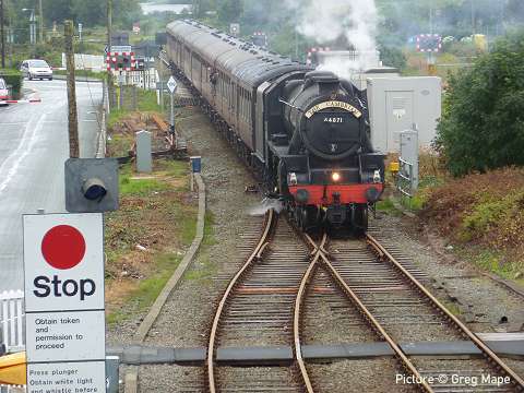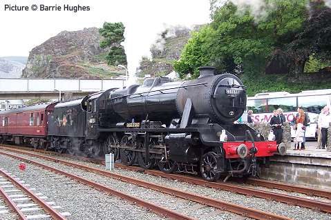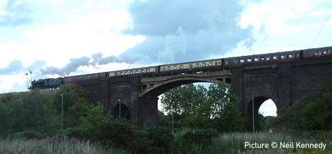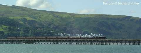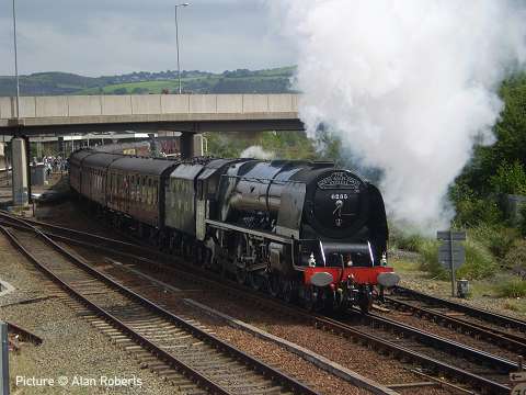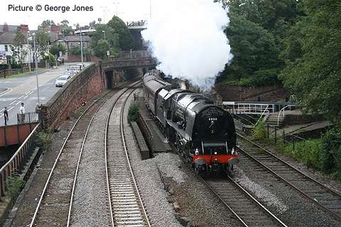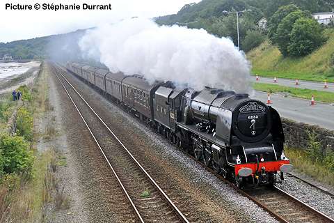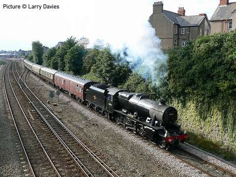 ![]() 6233 Duchess of Sutherland crosses Malltraeth viaduct, 8 August. (Ian Pilkington.) Many more steam views below. See the coming events column to the left for details of further runs of these excursions. BUMPER STEAM SPECIALThis summer is seeing a plethora of steam excursions in our area. This update is devoted entirely to our contributor's impressions of recent workings. We've had to ration the pictures a little - but there hopefully there is at least one from each person who who emailed. Note: a general issue, featuring some diesels (!) will appear later in the week. North Wales Coast Express![]() We begin with the Liverpool - Holyhead (and back) excursion of Sunday 8 August, featuring LMS Pacific 6233. We pick up the westbound train (above) Crossing the viaduct east of Frodsham (David Jackson) ![]() A little further, and the train emerges from the sandstone cutting into Frodsham station (Neil Kennedy.) ![]() The engine, built at Crewe Works in 1938, was named for Eileen Sutherland-Leveson-Gower, Duchess of Sutherland (1891 – 1943) daughter of the 7th Earl of Lanesborough. She had married the Marquess of Stafford in 1912, and became Duchess of Sutherland in 1913 when her husband became the 5th Duke (the family seat is Dunrobin castle on the Thurso line - the they also once owned the estate in Staffordshire which is now open to the public as Trentham Gardens) on the death of his father. From 1916 to 1921 she served as Mistress of the Robes, the senior lady of the Royal Household. The crown above the nameplate is of much more recent origin, being applied after its ground-breaking run along the North Wales line with the Royal Train on 11 June 2002, an honour which was repeated on 22 March 2005. ![]() Departure from Frodsham, with at least one website contributor among the Costa Coffee customers (Neil Kennedy) ![]() Passing Chester locks after departing from Chester (George Jones) ![]() Ffynnongroyw (Stéphanie Durrant) ![]() Prestatyn (Stavros Lainas) ![]() Abergele (John Beresford) ![]() Arriving at Llandudno (Larry Davies). After setting down passengers the train was 'dragged' back to Llandudno Junction by diesel 47 270 which was on the rear of the train. ![]() Departing Llandudno Junction for Holyhead, as seen by signalman Alan Roberts. ![]() Conwy (Larry Davies) ![]() Approaching Bangor (Eifion Hughes) ![]() Llanfair PG (Richard Fleckney) ![]() 47 270 Swift on the rear at Llanfair PG (Richard Fleckney) ![]() At Holyhead, the diesel ran round the train stabled while 6233 ran to Valley (above, picture by Barrie Hughes) to turn on the triangle ready for the return journey. Some of the photographers - not the people above who are by the triangle siding - were seen to be sitting on the side of the main line and setting up their tripods there, with the result that approaching service train had to be cautioned by the Valley signaller. The departure up the gradient from Holyhead was enthralling, with a minor slip as the loco crossed from Down to Up opposite the signalbox - with no help available from the 47 on the rear. ![]() We pick up the return journey at Rhosneigr (Ian Pilkington). Ian notes: 'Sadly I forgot about the speed restriction slack which applies to this particular loco between here and Ty Croes, so no "clag".' ![]() Gaerwen (Stavros Lainas). At Llandudno Junction the diesel-hauled move to Llandudno was repeated. ![]() Colwyn Bay (Stéphanie Durrant) ![]() Colwyn Bay (Darren Durrant) ![]() As ever, 6233 was in immaculate condition: the red headlamp carries a royal crown from the day when it was handled by Royalty. The Welsh Mountaineer, 11 August![]() The 'Welsh Mountaineer' of 11 August was the second run this year of a Railway Touring Company train from Preston to Blaenau Ffestiniog and return, also steam hauled all the way, this time by LMS 2-8-0 48151 Gauge O Guild. Above, the train enters our area, crossing the Weaver at Frodsham (Neil Kennedy) ![]() Passing through Helsby station, travelling 'at a fair rate of knots.' (David Jackson) ![]() Approaching Chester at Mickle Trafford (Stavros Lainas) ![]() Lots of 'clag' as the train passes Mold Junction (George Jones). The locomotive has been turned on the triangle of lines at Chester in order to be in the best position to attack the gradients of the Conwy Valley chimney-first after reversal at Llandudno Junction. ![]() Taking water by hose at Llandudno Junction (Larry Davies) ![]() Passing North Llanrwst (Larry Davies) This is the only passing loop on the branch, and even this is not used by the normal daily service which since around 2001 when the timetable was reorganised with Class 175s taking over Holyhead workings, is operated by just one diesel unit shuttling between Llandudno and Blaenau. Before that, two diagrams existed for Class 101 units, and included some Llandudno - Holyhead all-stations trains. ![]() Pounding round the curve approaching Roman Bridge (John Beresford) ![]() Arriving at Blaenau Ffestiniog (John Beresford) ![]() Preparing for the run-round at Blaenau Ffestiniog, as spare steam blows money out through the safety valves (Barrie Hughes) After running-round the train shunted to the loop to allow the regular train to arrive and depart. ![]() Departing Llandudno Junction after running round the train (Larry Davies). ![]() Heading for home, the train passes the junction signal for the line to Halton Junction. (Neil Kennedy) ![]() How things used to be: one of the few pictures a young Charlie managed to get of working steam before the 1968 extinction, showing a dirty 8F (48529 I think) doing what it was built for, rolling a train of 'covhops' loaded with lime through Chinley station. Today even the platform on which I was standing has vanished, although Chinley station still trades and limestone trains still pass through. The Cambrian![]() A look at The Cambrian coast steam operation which runs Mondays - Fridays between Machynlleth and Porthmadog or Pwllheli until the August Bank Holiday, this year with