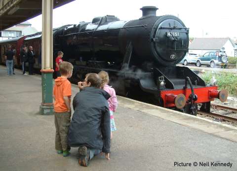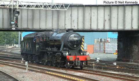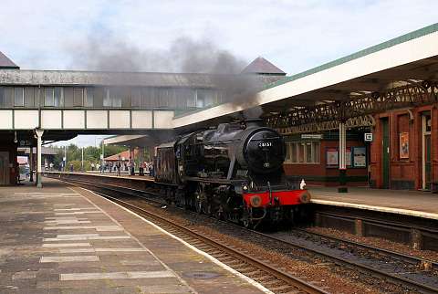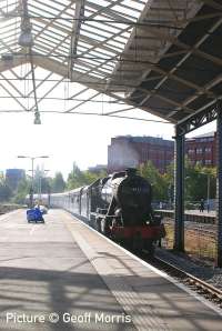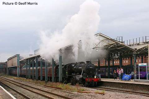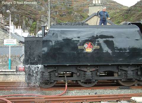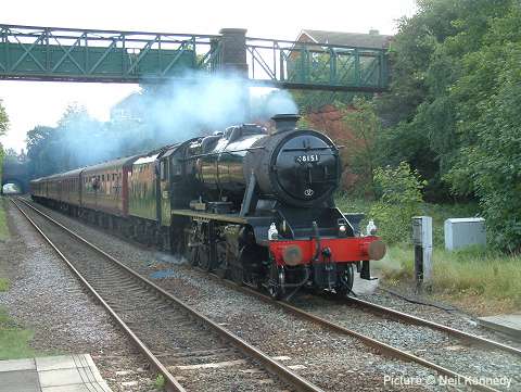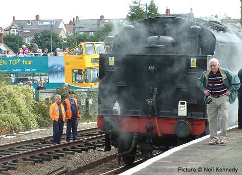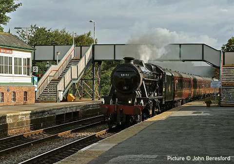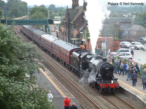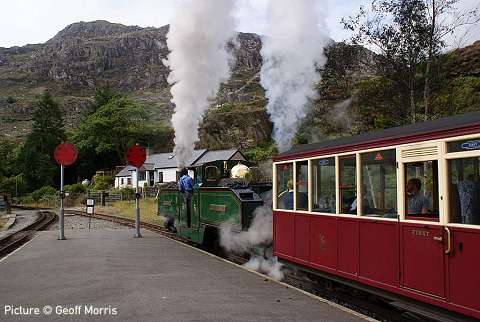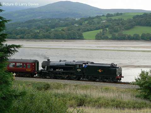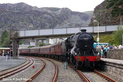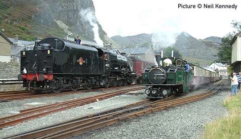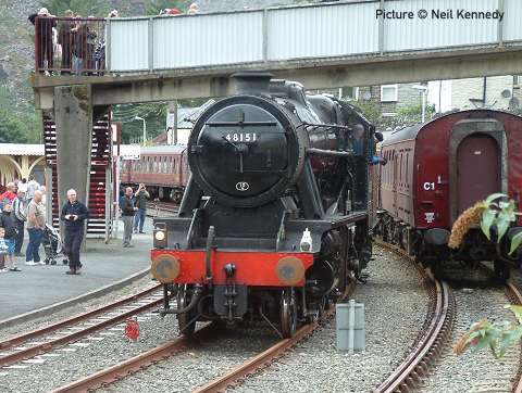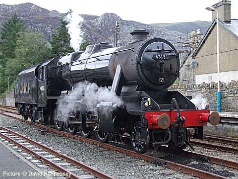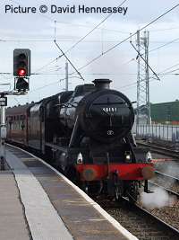 North Wales Assembly Member Mark Isherwood, interviewed by the Daily Post, welcomed the granting of an order. He said 'I urge the transport minister Ieuan Wyn Jones to listen and act. Llangollen Railway is not only a wonderful heritage tourism attraction and stimulus to the local economy, but also the biggest employer in Llangollen and the provider of an excellent apprenticeship scheme.' ![]() The picture shows the the view from the old road between Carrog to Corwen looking south across the valley. The route of the railway between the A5 road and the River Dee is marked by the old permanent way hut just east of where the line entered a shallow cutting and under an occupational bridge off to the right in the trees. The location does emphasise the closeness of the railway to the river which has been the cause of so much environmental concern in connection with this order. Imagine the views when Foxcote Manor hauls the first train west - there will be great shots from the nearby A5 road , although car parking on this stretch of road will be a problem and necessitate a walk from the car park at Corwen. An exhibition celebrating the 35th anniversary of the Llangollen Railway project 1975 - 2010, and illustrating the Corwen extension route, will open at Llangollen station on 28 August to help promote support for the Corwen Appeal Fund. The Welsh Mountaineer 25 August![]() The run of the Railway Touring Company's 'Welsh Mountaineer' to Blaenau Ffestiniog on 25 August saw several of our contributors in attendance, both aboard the train and on the lineside. There follows a combined report, beginning with the usual loco 48151 Gauge 0 Guild approaching the passenger and watering stop at Frodsham (Neil Kennedy) ![]() Frodsham (David Hennessey) ![]() Waiting patiently at Frodsham for the 'right away'. (Neil Kennedy) Note the star on the cabside which indicates an 8F loco whose wheels and motion have been specially balanced to allow smoother running at higher speeds. Neil Kennedy notes: 'The engine was amazing going up the gradient to Blaenau Ffestiniog. There was no jerking whatsoever, from 48151 it felt as finely tuned as a Formula 1 racing car, and The Railway Touring Company have definitely got the right engine for this trip.' ![]() Helsby (John Beresford) ![]() Heading for the triangle at Chester in order to go tender first to Llandudno Junction. (Neil Kennedy) ![]() Arriving at Llandudno Junction (Larry Davies) ![]() The Arriva open top touring bus at the junction where the passengers had a grandstand view of what was happening. (Neil Kennedy) [Editor's note: don't try using a PlusBus ticket on this bus, unless you want to give the driver a chance to practice his German] ![]() West Coast Railway Company driver Bill Andrew on the phone at Llandudno Junction checking what was happening. (Neil Kennedy) ![]() Running around the train at Llandudno Junction (Geoff Morris) ![]() Start their interest at an early age! (Neil Kennedy) Neil notes: 'Despite the fact that rain had been forecast for 4.00pm at Blaenau it didn't happen and it was a perfect day, with good weather and very good stewarding on the train. There was a little light-hearted discord during conversations when some passengers discovered that many of their fellow travellers had got a £30 promotional discount which they themselves hadn't heard about, but happily no fighting was involved!' ![]() On arrival at Blaenau Ffestiniog, seen from the foot crossing. (Geoff Morris) ![]() 48151 running round the train at Blaenau Ffestiniog. (Neil Kennedy) ![]() Preparing to shunt the stock to the loop to clear the platform for the service train (David Hennessey). ![]() The tender being filled at Blaenau ... "Turn it off, it's full." (Neil Kennedy) ![]() Earl of Merioneth leaving for Porthmadog. (Neil Kennedy) ![]() Geoff Morris writes: 'At Blaenau, the Ffestiniog Railway's timetable only allows a short return trip to Tan-y-Grisiau. Many people on the train were asking about the FR and it was unfortunate that their timetable could not be altered to allow passengers off the steam charter a better experience. Other than hanging around in Blaenau (and fortunately the weather was dry) the only viable option seemed to be a visit to Llechwedd Slate Caverns. Luckily I bumped into a friend who was holidaying in the area and he gave me a lift to Tan-y-Grisiau where I photographed the 2 FR services crossing.' Earl of Merioneth arriving at Tan-y-Grisiau (note that only the leading power bogie appears to be steaming). ![]() Above: Merddin Emrys arriving at Tan-y-Grisiau with the other train waiting in the loop (Geoff Morris) ![]() Earl of Merioneth departing Tan-y-Grisiau (note that now both power bogies are steaming). Picture by Geoff Morris, who notes: ' It was noticeable that probably 20 people got off the train from Blaenau to return there immediately. Normally the place sees little passenger traffic so I'm sure that every one of them was off the steam charter. So some income for the FR but really a lost opportunity (although their trains looked to be well-loaded).' ![]() A trainee engine driver at Blaenau Ffestiniog. (Neil Kennedy) ![]() Merddin Emrys leaving for Porthmadog. (Neil Kennedy) ![]() The Conwy Valley looking at its best as the train returns to Llandudno Junction (Larry Davies) ![]() Running round at Llandudno Junction, before working the return Welsh Mountaineer to Preston. (David Hennessey) ![]() Leaving Frodsham for Preston (Neil Kennedy) ![]() 48151 erupts out of Chester (with steam to spare) in the evening (Geoff Morris). This was the last of the four runs scheduled this summer. However in reality it was the only the third, because the previous week's run was cancelled due to low bookings. This may have been one reason for the newspaper promotion; as a result and the train was reasonably well loaded. Despite this, we understand that the trains will not be repeated in 2011. North Wales Coast home page 2010 Archive Previous Noticeboard |