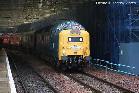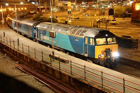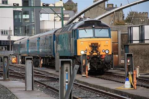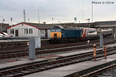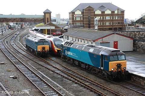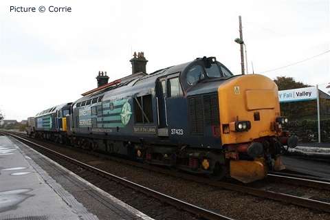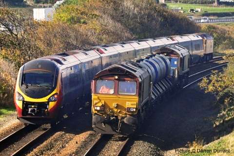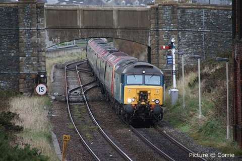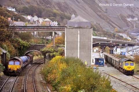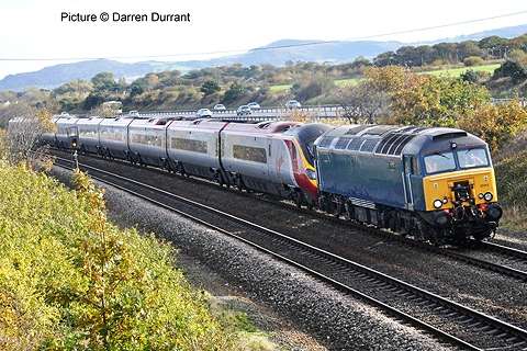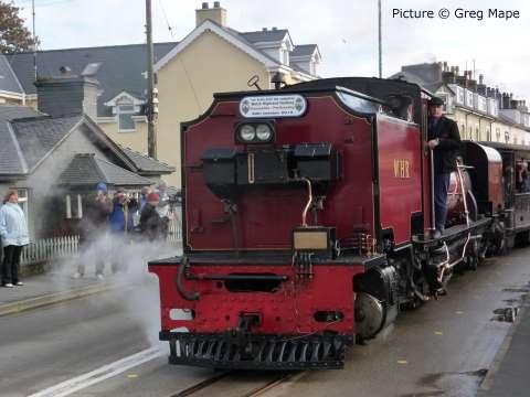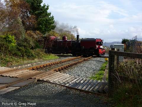 ![]() Varied line-up at Holyhead carriage sidings, Sunday morning 7 November. 57 315, 175 108 and 158 834 with an un-identified Virgin Class 221. Picture by Corrie. Welsh Highland through to Porthmadog![]() 30 October was a red-letter day for the Ffestiniog and Welsh Highland Railways as the first through passenger train, reserved for the WHR 'silver and gold supporters' ran from Caernarfon to the Ffestiniog Railway station and Porthmadog Harbour. The southbound train was delayed by a lorry parked on the level crossing at Pont Croesor by a man protesting that his company had not been paid for some demolition work carried out for the railway, causing the company to go into administration. The railway company says that the work was not finished before the administrators took over. Greg Mape's picture above shows the 11:00 train from Caernarfon, hauled by Garratt 138, on the flat crossing of the Cambrian Coast line near Porthmadog station. The train ran past Porthmadog Harbour station on to the FR's line on Cob embankment and reversed into the terminal platform; this will be the standard method until the Cob is widened to make room for a through platform. ![]() The return train enters the street-running section across the Britannia Bridge in Porthmadog (Greg Mape). The following day, the last WHR passenger train of 2010 ran: a Platelayers' Special ran from Harbour to Rhyd Ddu and back as a thank-you to the volunteers responsible for laying the track. Over 175 tracklayers, contractors, their families and a couple of dogs enjoyed a spirited ride up the 1 in 40 in a nine-car train double headed by Lyd and Taliesin. Train services re-start on 8 January, on the Caernarfon - Pont Croesor section only. However, due to work on the Porthmadog by-pass road, the Ffestiniog Railway will not be operating for much of February. A joint F&WHR service will run from Porthmadog Harbour Station to Caernarfon for one week only between 20 and 27 February, being the first chance for the general public to ride the Porthmadog town section. See the WHR timetable. Changes at CricciethAs reported previously, from 24 October the new ERTMS signalling system came into full use on the Harlech - Pwllheli section of line, the first part of an implementation which will cover the whole of the Cambrian lines. This includes the crossing loop at Porthmadog, and also the Welsh Highland Railway crossing mentioned above. Can anyone tell us how conflicting moves over this crossing are prevented? ![]() The most visible result of this changeover is that Merllyn level crossing, on a one-way road leading to the end of the promenade in Criccieth, which had gates and protecting semaphore signals worked by a level-crossing keeper on-site, now has full-width lifting barriers remotely-operated, with the aid of cameras, from the control centre at Machynlleth. These pictures showing the new arrangements were taken for us by Paul Lacey. ![]() Above, looking towards Black Rock and Porthmadog showing the signal which is now out of use - the signal being covered by what looks like a black bin bag. It's interesting to see that reminder signs for speed restrictions have been retained to complement the cab display: the speeds are in kilometres per hour, 80 for the regular railcars, 40 for loco-hauled trains. ![]() Looking towards Criccieth station, with the former gateman's hut, and the ground frame in the garden of what was once the crossing-keeper's cottage, and again the signal no longer in use. ![]() The 09:36 Pwllheli to Birmingham International, formed of 158 822, passing over the crossing on Saturday 6 November. Paul adds a few observations from experience of seeing one train pass by, and comparing the level crossing with the automatic half-barrier version at The Maes nearer to Criccieth station: 'The Maes crossing has an audible warning as well as the lights, so it seems strange to not hear an audible warning at Merllyn;t he floodlights at Merllyn stay on all evening, which adds a new feature to the town, whereas Maes has no such lights; and the barriers came down a long time before the train passed through. At The Maes, the train comes through fairly quickly after the barriers come down - it was a lot longer at Merllyn.' The way a level crossing works under ERTMS (as we understand it - please correct if wrong) relies on the fact that trains continually send, based on on-board sensor readings, their location to the computer in the control centre by a special version of the mobile phone network, and there are also axle-counters at strategic places on the track to report that a train is complete when passing them. When a train reaches a predetermined point the computer informs the controller that he must look at the crossing camera view and then operate the barrier controls when safe to do so. If the barriers are not lowered, the train will not receive a 'movement authority' for the section including the crossing and will be brought to a stop. The length of the section will determine how long the barrier has to stay down. Freight moves![]() The Flask train on 26 October featured the most unusual pairing of 37 423 Spirit of the Lakes and 57 010. Above, the train waits in Valley station before departing for the return journey to Crewe. Picture by Corrie. ![]() 66 953 has made several runs with the new flow of stone from Penmaenmawr Quarry to Guide Bridge: above, on 3 November, it brings the empty wagons across the crossover at Penmaenmawr and into the quarry sidings (Darren Durrant). ![]() Loading in progress as the Rail Head Treatment Train passes (Darren Durrant). Retrenchment at WrexhamWrexham & Shropshire released the following on 2 November: With effect from Sunday 12
