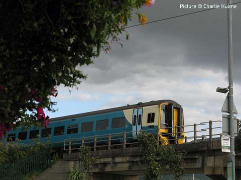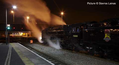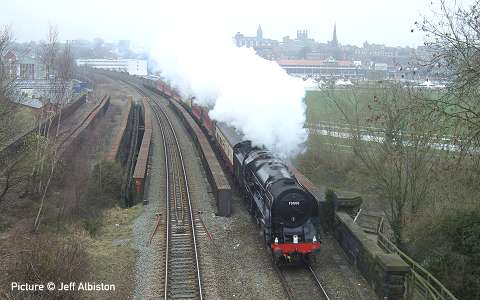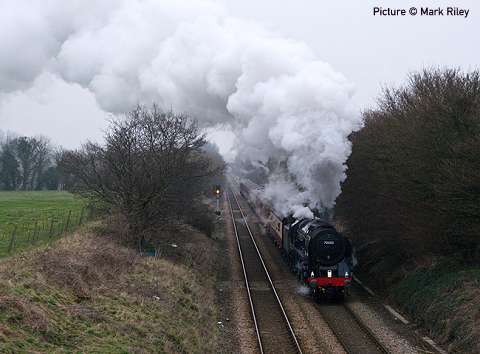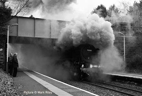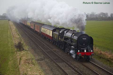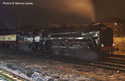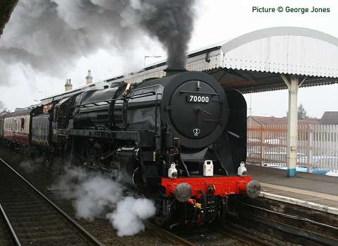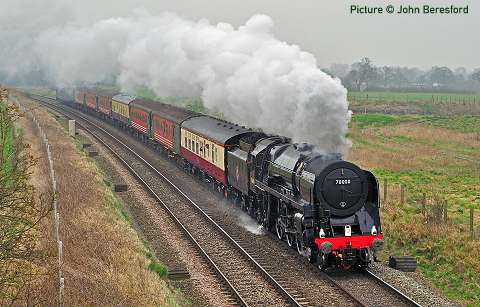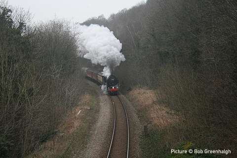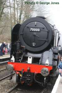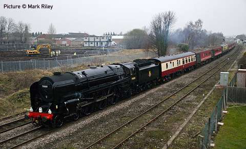 ![]() The flasks are back - 57 008 Telford International Railfreight Park 2009 and 57 009 pass Mostyn on 17 March. Picture by Tim Rogers. This issue is in the category of 'one I prepared earlier' as on normal publication day I'll be in a restaurant in Munich before catching the night train to Paris. Back to normal next week. - Charlie Black Britannia![]() British Railways pacific 70000 Britannia has completed its overhaul at Crewe; the owner has decided to paint it initially in black, which it apparently carried for a short while after being built (at nearby Crewe works) in 1951 before receiving the more familiar dark green. On the evening of 14 March made a return trip with a support coach (and a Class 67 on the back) from Crewe to Chester, where Stavros Lainas obtained these two pictures. ![]() The loco was turned round using the triangle of lines west of Chester station. Above, it returns to Chester station, now facing back towards Crewe. ![]() Two days later, on 18 March, Britannia (minus nameplates) embarked on a longer test run (without passengers) from Crewe to Bristol, hauling an assortment of Riviera Trains coaches and 67 006 Royal Sovereign which could rescue the train in case of problems. The train ran an hour late due to problems with the ground frame controlling the exit from the Crewe Heritage Centre. The weather was dull and misty but Britannia made a fine sight passing Wardle (above) on the way to Chester. The exhaust and whistle were audible long before the train came into range of John Beresford's camera. ![]() Above passing Hargrave on the way towards Chester (Stavros Lainas) ![]() After running through Chester, the train crossed the River Dee on Roodee viaduct heading for the Wrexham line at Saltney Junction (Jeff Albiston). ![]() Seen from the footbridge on the single-track climb of Gresford Bank, 70000 Britannia 'storms' past heading for Wrexham (Bob Greenalgh). Reportedly the loco managed to crest the steep bank at 50 mph. ![]() Passes Croes Newydd, south of Wrexham station. Seeing steam on the line from Wrexham to Shrewsbury was a rare treat, with a report in the Wrexham Leader newspaper announcing the event. In this picture, the exhaust has just shut off as 70000 slows for a signal check at Felin Puleston. In the background, and to the centre left of the photo, work is under way on preparing the land for a new Morrison's supermarket. Workers pause to witness the unusual sight of a steam locomotive (Mark Riley). ![]() Making an impressive sight, 70000 accelerates away from a standing start at Felin Puleston and passes Rhostyllen, next stop Chirk to take on water. ![]() A few more people than normal at the usually sleepy, tranquil, diminutive station of Chirk, to see Britannia taking on water, supplied from a fire tender in the station car park. The Kronospan plant, served by trainloads of timber, can be seen in the background (Mark Riley). ![]() A black and white impression of 71000 making an impressive departure from Chirk after its water stop. How many years it will be until we see steam on this stretch of line again? ![]() Passing Gobowen (George Jones). After a cautious approach to the level crossing the sound effects when leaving Gobowen were noteworthy as it hit the short gradient to the south. British Railways Chief Mechanical Engineer R.A. Riddles had, before it was merged with other companies in 1923, worked for the London and North Western Railway, which painted all its engines black, and clearly favoured the same colour for his new 'standard' designs. He largely got his way when the LNWR lined-black livery was chosen for all BR's 'mixed traffic' locomotives, and a simplified version for diesels and electrics. However, after trials with various colours it was decreed that express passenger locomotives, including the Britannia class (despite Riddles classifying it as mixed-traffic), should wear Great Western-style green. 54 other locos were built, and 70013 Oliver Cromwell is also preserved in working order. ![]() The driver on the test train was Pete Sheridan (Picture by George Jones) one time regular the Llangollen. Following the test run, 70000 proceeded to the West Somerset Railway to take part in a Spring Steam Gala on 19-20 and 24-27 March. Cutting the First Sod for Corwen - report by George Jones![]() The Deputy Minister for Housing and Regeneration, Jocelyn Davies AM, attended Llangollen station on 17 March when she visited the exhibition coach to see the displays for the Corwen Extension Project and the 'before and after' displays for the Railway’s initial years of restoration from 1975. Ms Davies was accompanied by Mr. Wyn Roberts, Programme Director North Wales Coast Regeneration and was meet at Llangollen station by Mr Jim Ritchie, chairman Llangollen Railway Trust and Cllr Hugh Evans, Leader Denbighshire County Council and members of the Llangollen Railway Trust Ltd. The party travelled by special steam train service to Glyndyfrdwy for onward road transport to Corwen where the Deputy Minister visited the site of the new temporary station for the Phase 1 of the Railway’s extension. In a short ceremony the Deputy Minister was invited by Mr. Jim Ritchie to initiate the project to bring the trains back to Corwen by digging the first sod, ably assisted by Vice-President of the Llangollen Railway Trust, Bill Shakespeare, MBE. The spade used for the occasion is to be suitably etched to commemorate the start of the Corwen project and will be displayed at Llangollen station. The Deputy Minister said: 'It is a pleasure to see the plans that the Trust has for the railway. Regeneration is all about making the most of what an area has to offer and the railway is certainly one of the jewels in Llangollen’s crown. The funding we have awarded will mean that the tourists who currently visit Llangollen will in future also be drawn to Corwen and the wider Dee Valley area will benefit from the railway. I’m delighted that the project is running ahead of s