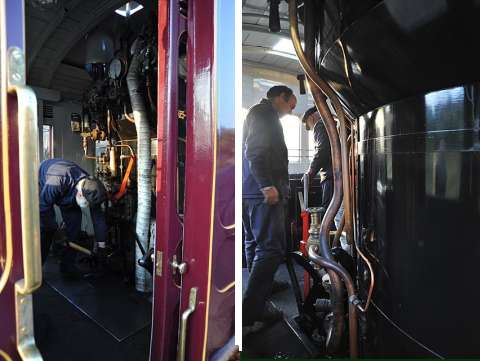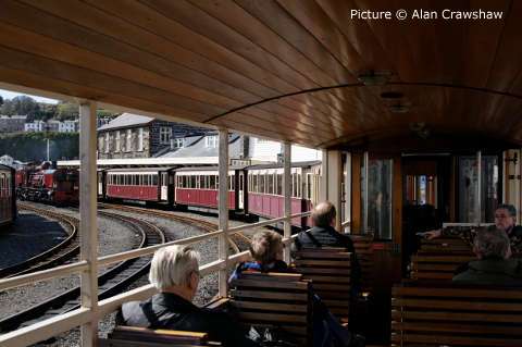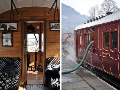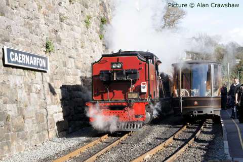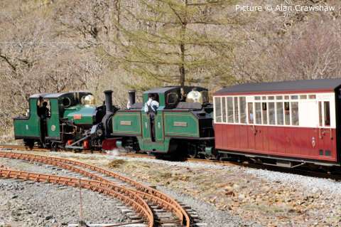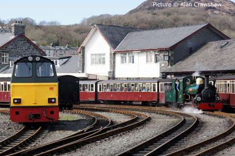 ![]() Memories of the pick up goods - a Pannier and half a dozen wagons, with 6430 in charge on 9 April (Larry Davies). ![]() Foxcote Manor arrived at Llangollen on 10 April (Katherine Vinten)... ![]() ... piloted by 0-6-2T 5643 (Katherine Vinten). ![]() 44806 stands at Llangollen (Katherine Vinten) ![]() After completing three days' service, Foxcote Manor rests at Llangollen shed on 10 April. A huge credit goes to Dave Owen & his team for completing the loco in time for the event. The Manor now takes a break from duties and will next be in action over the Easter period (Jeff Albiston). Railmotor restored - report by Geoff MorrisI was lucky enough to take part in a photo charter with the newly restored GWR Railmotor (no 93) on Wednesday 23 March. A few days later it was moved to The Didcot Railway Centre where it will remain for a couple of years. The vehicle ran with local destination boards (Wrexham & Carrog) at the appropriate ends, as can be seen in the two views above, taken at Carrog. Above, a further view of it in action is shown at Garth-y-Dwr. The interior of the vehicle has been finished to the same high standard as the exterior. The water tank is slung underneath the vehicle but there holes through which water is taken about halfway up the body side on both sides of the vehicle. The holes are covered by flaps - not unlike the filler cap on a car (above, right). The boiler sits on its own power bogie, so firing is typically confined to when the vehicle is stationary - as the power bogie moves independently of the footplate. This makes it difficult to aim accurately - the position of the fire-hole when you start to swing the shovel will not necessarily be the same when you finish your swing! ![]() This picture by George Jones from 4 April shows no.93 being winched on to road transport for its journey to Didcot. No. 93 was built by the Great Western railway in 1908, an early attempt to reduce the costs of branch-line working; 99 examples were built. The vehicle weighs in at around 45 tons and has seating for 70 passengers with a crew of 3 – driver, fireman and guard. No.93 was based at Wrexham’s Croes Newydd shed in 1921/22 and this type of vehicle once operated on the line between Wrexham, Ruabon and Bala in the early part of the 20th century. The Great Western Society and its supporters raised £750,000 which has not only allowed the power bogie to be built but also included our contribution towards the restoration of the coach and matching trailer coach No. 92 which has been mainly funded by a Heritage Lottery Fund grant of £768,500. ![]() A close-up of the the steam power bogie, cylinders and motion - inside the body is a vertical boiler (George Jones). The contract for the restoration work was awarded to the Llangollen Railway’s Engineering Department by the Great Western Society in 2008. The project as delivered to Llangollen provided a derelict wooden coach body which had survived in British Rail departmental use prior to acquisition and storage at the Didcot Railway Centre. The Llangollen Railway Carriage & Wagon Department converted it back to the Steam Railmotor configuration, rebuilding a large element of the original fabric, and installing appropriate features from the 1900s. Fortuitously, the traditional ‘walk-over’ seating was acquired from a scrapped tramcar in Australia. The engine unit comprises a vertical boiler mounted on a four wheel bogie which components were made by sub-contractors and delivered to Llangollen for assembly. This involved the manufacture of the motion parts and fitting to create a steam-power unit. The only non-original aspect is the use of electric lighting in place of gas, although the battery installation has been cleverly disguised within the original gas canister which remains in place and traditional style gas lights feature electric bulbs. The Steam Railmotor No.93 is due to be launched at a public occasion by the Great Western Society at Didcot on 28 May. Narrow gauge circuit (assisted by Arriva and a bus) - report by Alan Crawshaw![]() On 2 April Rowan and I undertook a circular tour from out home at Graianfryn Vegetarian Guest House, taking in the full length of the narrow gauge Ffestiniog and Welsh Highland Railways. Our timetable was as follows: 09:01 Padarn Bus 85 09:29 arr Bangor railway station 10:02 dep Bangor (Arriva Holyhead to Birmingham International service) 10:23 arr Llandudno Junction 10:34 dep Llandudno Jct (Arriva Conwy Valley line) 11:34 arr Blaenau Ffestiniog 11:50 dep Blaenau Ffestiniog (Ffestiniog) 13:00 arr Porthmadog 14:15 dep Porthmadog (Welsh Highland) 16:50 arr Caernarfon 17:10 Padarn bus 83 to take us home. Planning a circular trip requires careful attention to the timetables as the FR/WHR pattern is variable and many of the Welsh Highland trains don’t run all the way because of capacity constraints at Porthmadog Harbour station. These times were valid only until 11 April (apart from Sunday, when there’s no Conwy Valley service), then for a period in October. Round trips are possible starting from Porthmadog at certain other times. ![]() A short walk from home took us to the route of the Padarn service 85, the bus arrived punctually through the early gloom (above). ![]() We alighted at Bangor station where we had half an hour to survey the extensive works being undertaken and during which the sky cleared. The sidings area is being prepared for a larger car park, paving slabs on platform 1 are being lifted and levelled with broken ones being replaced and the station building is sheathed with scaffolding. The picture above shows passengers squeezing on and off the 09:23 Holyhead to Birmingham International, the platform having been temporarily reduced in width by the works. 158 824 was very busy on leaving Bangor. A class 37/4 with four coaches would have coped better with a popular Saturday morning service but then we'd have had difficulty leaving it at Llandudno Junction for the Conwy Valley l