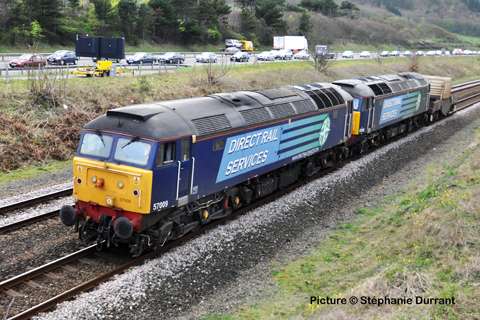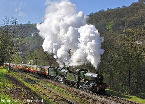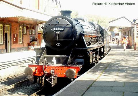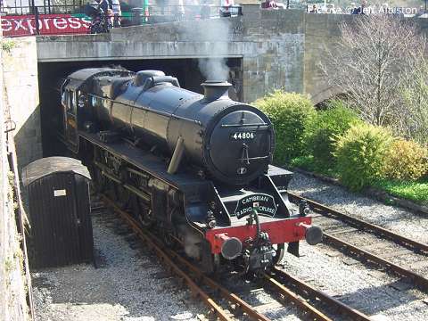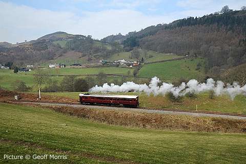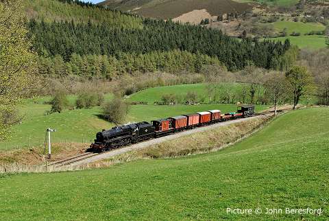 ![]() 44806 with the demonstration freight passes Garth-y-Dwr on 8 April (John Beresford). ![]()