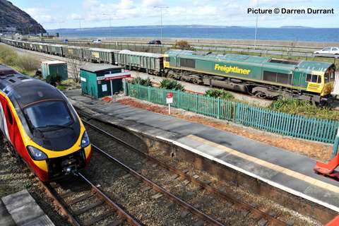 ![]() Three types of rolling stock in one train, as 1V63 the 16.39 Holyhead to Cardiff leaves Llandudno Junction on 9 April at 17:25, formed of 153 362, 150 236 and 158 819. Picture by Peter Lloyd. RCTS News - by Richard NealeThe Railway Correspondence and Travel Society meets for the final time this season at the Town Crier opposite Chester railway station on Monday 18th April at 7.30 p.m. Our speaker is Chester resident [and website contributor] Geoff Morris with his digital presentation entitled 'Another Australian Adventure.’ This features Geoff’s return visit to Australia last year featuring main line and preserved steam in Victoria, New South Wales and Queensland plus views of the modern scene and the occasional kangaroo. Visitors are more than welcome to attend this meeting but with a £2 voluntary donation. Such donations enable the Society to continue its regularity of such meetings. RCTS members and other local rail society groups are asked to note that as from this September the local RCTS branch will only be arranging Chester monthly meetings and will no longer be holding any meetings at Port Sunlight. Freight scenes![]() 60 013 Robert Boyle (above) passes Haughton, just south of Gobowen, on the Llanwern to Dee Marsh steel coil train, running an hour late in dwindling light (Stavros Lainas) ![]() 28 March, first of the light evenings and a chance for George Jones to see 'the logs' passing Wrexham General en route for Chirk. However it ran a little late and only just got through at 19:00 with the Holyhead-bound pair of 158 Units waiting the road to Chester. 66 845 was on the job hauling 21 wagons with the sun going down in the west after a delightful blue sky day. ![]() 18:55 on 5 April, and 66 845 is on duty again with the log train to Chirk, passing Wrexham station (George Jones). ![]() In the second picture the last of the wagons is approaching the end of platform 1, whilst the engine is up around the Croes Newydd crossing (George Jones). The train has been reported running on Saturdays passing Chester around 16:00, as well as weekday evenings. ![]() The Penmaenmawr - Gude Bridge stone train ran on Saturday 2 April, enabling Darren Durrant to get this view of 66 620 and its train being loaded as the Holyhead-bound Pendolino passed Penmaenmawr station. It appears that the stone train now runs on alternate days, on a full seven-day cycle, so it will be seen Saturday one week and Sunday the next. . ![]() No. 70 011 approaches Frodsham station with the morning inbound empty wagons for the Ellesmere Port - Fiddlers Ferry coal train on a drizzly 7 April (David Parry). ![]() 37 604 and 37 218 with 6K41 Valley - Crewe flask passing Llandudno Junction signal box at 14.57 on 8 April (Peter Lloyd). ![]() 11 April's flask train featured 57 009 and 57 008, seen at Llanddulas (Stéphanie Durrant) ![]() On 7 April a trial freight ran from the sand quarry at Middleton Towers in East Anglia to Ellesmere Port, carrying sand for the Quinn Glass factory. Stavros Lainas photographed the empty wagons returning to Crewe on 8 April behind 66 601 The Hope Valley, passing Daresbury. Miscellaneous notesFollowing the recent article about the lack of North Wales members on the Wales Assembly's Public Transport Users Committee, we hear that at least one person from North Wales was interviewed for the role. The person in question, from Llandudno, does not have a car and uses public transport a great deal, but was turned down, on the grounds that his 'knowledge of diversity and equalities was not of the required standard.' Regarding the complaints by Express Motors about unfair competition from the Conwy Valley trains, Leslie Fletcher writes 'The X1 service might have more passengers were the operator to see its role as complementing the Conwy Valley train service rather than competing with it. In the October 2010 X1 timetable, buses arrive in Dolwyddelan from Llandudno at 11.10, 14.20 and 17.10; trains arrive at 11.13, 14.12 and 17.13. The situation going down the valley is not quite so grotesque but were Express Motors to run its whole timetable 30 minutes earlier then the service to the public would be significantly enhanced.' On the subject of freight traffic, we gather that the refuse tip at Llanddulas quarry is getting close to being full, and there is a plan to run 'bin liner' trains of domestic refuse from Llandudno Junction to some remote disposal location. Does anyone know more? A strange result of the late-lamented Wrexham & Shropshire operation is that the Department for Transport mandarins have decided to fine Chiltern Railways half a million pounds. Among other crimes, we read that 'It came to light that Chiltern [made] unapproved changes to the timetable, which were actually to accommodate services offered by the open access operator, Wrexham, Shropshire and Marylebone Railway Company Limited (WSMR). This contravention of Chiltern’s contractual obligations was only identified from a WSMR press release and subsequent investigation by the Department’s franchise management team. The effect on passengers may be considered minor but, in the context of favouring WSMR commercial improvements over Chiltern Railways' own services, the effect on the Department could have been significant.' Read the full horror story in this PDF file. Spring Gala at Llangollen![]() The Llangollen Railway steam gala on 8-10 April was a huge success, with more families attending than enthusiasts. Passenger numbers were excellent during all three days, and of course the weather played a big part. 7822 Foxcote Manor leads 2-8-0 3802 out of Llangollen in the morning of 8 April, before the warm sunny weather reduced the steam effects; of course, the sunshine will have attracted people to travel on the trains and helped the railway's fund-raising efforts, which after all is the main point of the gala (John Beresford). ![]() GWR Pannier 6430