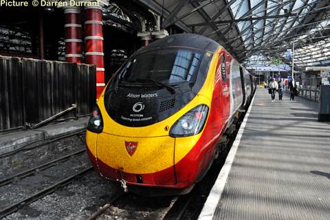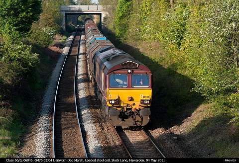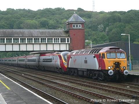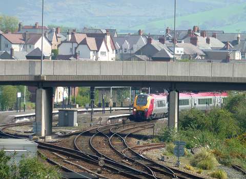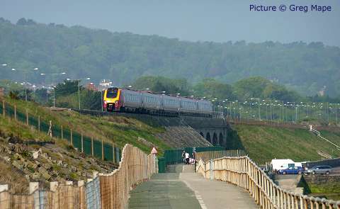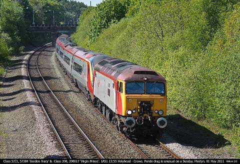 A new passenger line and station are also a possibility, created from rail sidings which would initially be used to transport equipment needed to carry out the multi-million pound development. West Midlands-based developers Bersham (Glenside) Ltd plan to remove the huge slag heap at the site, which has been designated as 'amenity land', and prepare it for development in the future. The company is yet to begin work to remove six million tons of burned shale, which could take between seven and nine years, but is positive it is only a matter of time before operations begin. A spokesman says: 'We have to meet a number of 'pre-start' planning conditions and there are quite detailed surveys and contracts which have to be considered. We had hoped to start work in March, but approval in some areas such as ecology and landscaping are still outstanding. We still aim to begin work as soon as possible, hopefully before the end of the year. BGL’s plans were initially challenged by Welsh historic monuments agency Cadw, which asked for the spoil heap to be preserved as one of the few remaining of its kind. Wrexham Council also blocked the move. Lawrence Isted, the council’s head of community wellbeing and development, said: 'Wrexham Council originally objected to this application because the loss of the tip would compromise the setting of the colliery buildings, which are listed, on the site. The Assembly Government overturned this decision on appeal, subject to a number of planning conditions and a legal agreement which requires a financial contribution for the repair of the winding gear engine house and towards a museum and part of its running costs. We are now working with the company to discharge those planning conditions. The company has renewed its pledge to abide by these conditions.' Let us hope the company is aware of the hurdlers to be overcome these days in the simple task of creating a 'new passenger line and station are also a possibility, created from rail sidings which would initially be used to transport equipment needed to carry out the multi-million pound development.' Curiously, they do not seem to say that rail will be used to move the six million tonnes of shale, which is really quite a large quantity. One train could move perhaps 1500 tonnes, meaning 4000 trains would be needed. On your Bike![]() The North Wales Coast Cycleway offers a healthy way to observe trains along the Coast - Greg Mape took these Voyager pictures on Good Friday at Old Colwyn (above) and Llandudno Junction (below). ![]() Conwy Valley in the Press (twice)![]() Separate feature articles about the Conwy Valley line appear in the June 2011 issues of two magazines The Railway Magazine (on sale now) and Todays Railways UK (published 9 May). It's good to see the line getting such publicity, on top of the sterling efforts of the line's Community Rail Officer Larry Davies. Our picture, by Gary Thomas: 150 241 at Betws-y-Coed with a Llandudno service on Good Friday, 22 April. Pendolino events![]() Out and about on test runs recently has been the first of the newly-built 11-car Pendolinos, 390 054, pictured above at Crewe by Mark Riley on one of several runs on 21 April. ![]() It also made two stops at platform 12 (Mark Riley) Bright red trains can cause quirks in the JPEG image compression system we use to make the pictures load quickly... ![]() Although the train is painted in Virgin's basic colours, it is not at present part of Virgin's fleet, these extra units were ordered from Alstom by the Department for Transport for use by whoever takes on the West Coast Main Line Franchise when it is re-let in 2012. Virgin have won the contract to do the testing, based at Edge Hill depot, Liverpool. Short-listed bidders for the franchise are Abellio (trading name of Netherlands state railway NS), First Group, Keolis with French state Railway SNCF, and Virgin. Deutsche Bundesbahn (Arriva) wanted to bid but have not been short-listed. ![]() Virgin Trains, supported by Alstom, are supporting British Athletes with funds enabling a number of sportsmen and women to attend training camps, key competitions and championships up and down the country in the run-up to the 2012 Olympics. Some athletes have been chosen to have their name on the front of Pendolinos; the first, at a launch on 24 March, is Alison Waters, the British National Squash Champion 2010 and ranked number five in the world. Darren Durrant took these pictures at Liverpool Lime Street. ![]() The chosen train is 390 052, which some reports say has also retained its Virgin Knight nameplates. Can anyone confirm? Alison told the press 'I am so excited to be launching a train named after me! This normally happens to Royalty!' She might be surprised to hear that it is rather rare for a loco or train (other than preserved machines) to be directly named after a royal personage since the railways were privatised. ![]() Pendolinos are normally only seen in North Wales on Saturdays, but most unusually, a 'pendo drag' ran on Sunday 1 May, featuring 57 304 Gordon Tracy and 390 017 Virgin Prince, seen above near Mostyn heading for London (Tim Rogers) ![]() The Saturday train is often used, very sensibly, on the London service to change over the locomotive at Holyhead for the weekday Arriva Trains Wales Holyhead Cardiff train, despite reported objections from within the Virgin management to the use of a 'wrong-coloured' loco. Above, 57 315 passes Llanfair PG on 16 April (Richard Fleckney). Virgin-liveried locos on the Cardiff train are much rarer. ![]() Bank Holiday weather as 57 304 Gordon Tracy heads east through Dwygyfylchi on Saturday 23 April (Gary Thomas) ![]() Bangor, 7 May with 57 302 Virgil Tracy (Rowan Crawshaw) Busy Time at Wrexham - report by George Jones![]() I called in at Wrexham General station just as the 18:38 Arriva train departed south, so decided to wait for the log train to appear. The following sequence then occurred: At 18:48 the Class 150 unit ran through p
