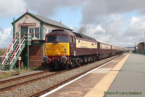 Sunday 5 August Steam in North Wales Railway Touring Company 'North Wales Coast Express' Crewe, Wilmslow, Stockport, Manchester Piccadilly, Frodsham and Chester to Llandudno, Llandudno Junction, Bangor and Holyhead (arr 15:10 dep 17:45). Sunday 12 August Steam in North Wales Railway Touring Company 'North Wales Coast Express' Crewe, Wilmslow, Stockport, Manchester Piccadilly, Frodsham and Chester to Llandudno, Llandudno Junction, Bangor and Holyhead (arr 15:10 dep 17:45). Tuesday 14 August Steam in North Wales Railway Touring Company 'The Welsh Mountaineer' Preston, Warrington Frodsham, Chester to Llandudno Junction and Blaenau Ffestiniog (arr. 13:15 dep 16:10) Saturday 18 August Steam in North Wales Vintage Trains 'The Welsh Dragon' Tyseley - Blaenau Ffestiniog (Steam loco 5043 as far as Llandudno Junction; Class 47 diesel to Blaenau) Sunday 19 August Steam in North Wales Railway Touring Company 'North Wales Coast Express' Liverpool Lime Street, Broad Green, Warrington Bank Quay, Frodsham and Chester to Llandudno, Llandudno Junction, Bangor and Holyhead (arr 14:30 dep 16:30). Sat / Sun 25 - 26 August Llangollen Railway Classic Transport weekend Sunday 26 August Steam in North Wales Railway Touring Company 'North Wales Coast Express' Liverpool Lime Street, Broad Green, Warrington Bank Quay, Frodsham and Chester to Llandudno, Llandudno Junction, Bangor and Holyhead (arr 14:30 dep 16:30). Tuesday 28 August Steam in North Wales Railway Touring Company 'The Welsh Mountaineer' Preston, Warrington Frodsham, Chester to Llandudno Junction and Blaenau Ffestiniog (arr. 13:15 dep 16:10) Saturday 31 August - 2 September Llangollen Railway Autumn Steam Gala September 2012 Sun / Mon 1 - 2 September Llangollen Railway Autumn Steam Gala (continued) Saturday 15 September Excursion Cheshire Cat Tours Aberystwyth - and stations to Crewe - to Carlisle. Saturday 22 September Llangollen Railway Diesel Day October 2012 |