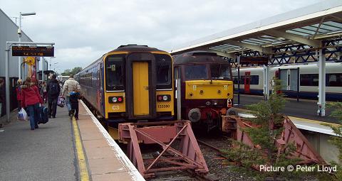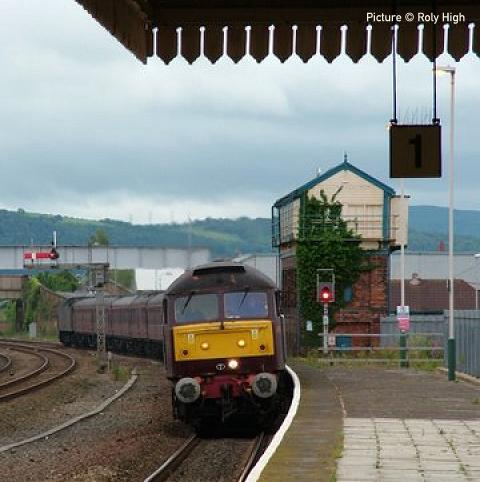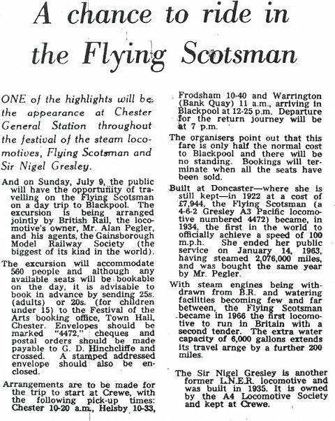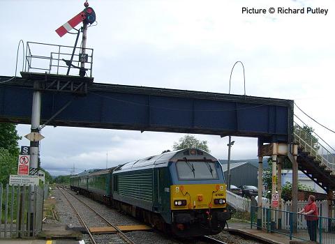 ![]() 67 002 passes Conwy at 19:57 on 28 May with the 16:15 Cardiff to Holyhead service, From September, this loco-hauled train runs two hours later, and shots like this will not be possible even in the height of summer. News of the Arriva express![]() Above, 67 002 at Abergavenny with the northbound express from Cardiff to Holyhead, 26 June. Picture by Richard Putley. The three blue 67s, 67 001 - 003 continue to ply their Monday-Friday trade, as we await the changes proposed for September. ![]() Test runs have been taking place with Driving Van Trailer 82308, now fitted for use with Class 67s, and 67 001. Martin Evans photographed the pair on 28 June passing the futuristic footbridge at Newport (above)... ![]() ... and at Cardiff. A thought arises regarding the plan to run this train two hours later from Cardiff at 18:18, while still starting from Holyhead very early at 05:32. The staff of the restaurant car, currently work out and back from Holyhead, with a rest during the day, we understand in a room reserved for them at Newport. In the new arrangement it would seem they are going to have a very long day indeed, getting back to Holyhead very late in the evening. ![]() Rear view at Abergavenny (Richard Putley) Chester Festival 1967 - by Robert Meredith![]() It is 45 years ago, in the 'Summer of Love' when as part of the Chester Festival of the Arts, a Locomotive Exhibition was held at Chester Station from 2 - 16 July 1967. LNER locomotives 4498 Sir Nigel Gresley and 4472 Flying Scotsman, along with an electric loco were on display in the old platform 2. ![]() On Sunday 9 July 1967, 4472 Flying Scotsman worked a return excursion to Blackpool, the cost being 25 shillings (£1.25 for adults) and 20 shillings (£1 for children under 15). ![]() The pictures show of the locomotive exhibition admission ticket (the cost being 6 old pence), an article from the Chester Chronicle of 30 June 1967 about the details of the railtour to Blackpool, and from Dave Giddins' collection, a newspaper cutting from the Cheshire Observer of 7 July. We wonder if this young Stewart Pace is still interested in railways? Or perhaps Beverley? If anyone reading this visited the event, we'd be pleased to hear from them, especially if they took pictures. Valley signalbox - the facts![]() Readers may recall the question we posted in the 4 June issue asking whether the signalbox windows at Valley (Anglesey) had been replaced in a different style before or after it was made a Grade 2 Listed Structure in January 1998. With much help from North Wales signalling expert Alan Roberts we can answer the question: the windows were replaced in 2003, on what is described as a 'like for like' basis as the wooden frames were rotten. The picture above by Darren Durrant from 2009 shows the current state of the building. However, in the original windows each of the four large windows was in two sliding sections, each with four panes, not the current four. It appears, however, that Network Rail did not know that it was listed: it's status is not listed in their 'Hazard Directory' covering the Chester & Holyhead line which does record that the boxes at Ty Croes, Abergele, Rhyl No.2 (Closed 1990 but still standing), Rhyl No.1, Mostyn and Holywell Junction. Any modifications to have to be minimal, and renewals near enough to the original London and North Western Railway (LNWR) construction such as windows, door and stairway. Any modification using PVC is not allowed. At Abergele, for example, when the original wooden door was due for renewal, they replaced it by a PVC door but were told later to replace it again with a replacement wooden door. The box at Valley has always looked different to what might be considered the typical LNWR box: opened in 1904 to replace an earlier one, it was the first example of what signalling historians call an 'LNWR Type 5' box with windows 6 feet high compared with the earlier design using 4-foot-6 inch-high windows. ![]() The box at Deganwy - pictured above by Garry Stroud in 2009 - is also a Type 5, and has also had its windows replaced with a simpler version, but does not appear to have been Listed. The main station building at Valley, is also a Grade 2 listed building, deservedly so is it is one of the original station buildings designed for the Chester and Holyhead Railway and built in 1849; it was symmetrical until a toilet block was added in the 1880s. The station, like some other smaller stations on the line, was closed to passengers by British Rail in 1966, with permission from the then Minister of Transport, Barbara Castle. Years later, thanks to pressure from the community and the authorities of Valley RAF station, it was re-opened in 1981. Since 1962 the signaller has had responsibility for trains entering the siding serving Valley Power Station, and since the 1980s for the turning of steam locomotives on the triangle of lines. Picture assortment![]() Rhyl engineer's siding, with Rhyl No.1 signalbox and 'Stone blower'. (Darren Durrant). The stone blower is for 'packing' the track to keep it supported at the correct level. This is done by measuring the void under each sleeper and then inserting a suitable amount of small stones into the void. The measuring run is done first and then the machine uses hollow tynes which are inserted down the side of the sleeper and the stone is then blown into the void. Hence the name. ![]() Cambrian Coast idyll as one of the remaining silver 158s crosses the Dysynni river bridge near Tywyn, 28 June (Ian Wright). ![]() A moment of the past: when on a BR trip to Crewe Works in the early 1960s, Richard Fleckney captured this scene of 6233 Duchess of Sutherland. The Duchess was withdrawn in 1964 and sold to Butlin's Holiday Camp at Heads of Ayr, Scotland, which fortuitously saved her for restoration to running order some years later, eventually leading to regular appearances in North Wales. It is known that she was prepared for the sale at Crewe works: could this be wha