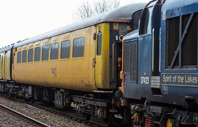 ![]() 57 307 Lady Penelope has emerged from Eastleigh works in the livery of its new operator. So far, it is the only ex-Virgin Class 57/3 to retain its original nameplate. Well done to DRS, although it does look 'at odds' with the serious message carried on the body side. Maybe Lady P. now works for the BTP? Photomontage at Crewe by Mark Riley. Unusual departure from Llangollen - report by George Jones![]() When Class 8F 2-8-0 48518 which had been received from Barry scrapyard, was dismantled at Llangollen a while back, the cab remained in store as the remaining relic of this loco, unusual as being one of the LNER built examples (Doncaster 1944). On Friday 8 February the cab was retrieved from store and loaded up to be taken back to Barry where it is to be incorporated in an 8F rebuild project. The cab is seen above being loaded up prior to departure. The cabside lettering shows evidence of previous ambitions for rescue and restoration which were not achieved and the engine became part of the remaining 'Barry Ten', a collection of locomotives that were removed from Woodham Brothers scrapyard in Barry in 1990 when owner Dai Woodham retired; basically, they were the only ones which were left unsold after many others had been saved by preservationists. Note by Charlie Hulme: the lettering on the cab side reminds us of the steam centre established by Peak Rail on the old Midland Railway station site at Buxton in the 1970s, and sadly closed again in the late 1980s when the society decided to concentrate on the Matlock - Rowsley line. (Possibly it was only the cab side that the Buxton people hoped to use.) An 8F from Barry, 48624, was taken to Buxton in the 1981 to be restored. It was moved to the new site when Buxton closed, and after many years of work was returned to steam in 2009; currently it works on the Great Central Railway, wearing an incongruous maroon livery. Speaking of Peak Rail Buxton, someone has put on YouTube a half-hour BBC 'open access' programme made by the volunteers there in 1985, which is very well worth watching. Little did they know that all their hard work was to come to nothing, even after a new bridge span had been installed with a grant from the Greater Manchester Council. A bottling plant for Buxton Mineral Water was built over much of the site, although leaving the platform and space for a possible small station. Recently the bottling has been re-located to a new site outside the town; Tesco had their corporate eyes on the site, but their plan seems to have been blocked. Test train ... in testing weather![]() An Ultrasonic Test Train powered by 37 423 Spirit of the Lakes covered our area from 4 - 6 February, and our hardy contributors went out to photograph it despite the wintry weather. Above, on 4 February, Martin Evans captured 37 423 on an Ironbridge Power Station via Shrewsbury to Chester then back to Shrewsbury track recording train at Rhosymedre (near Ruabon) taken just as hail was falling. ![]() Next morning, 5 February Martin Evans found the train tucked into the siding at Shrewsbury before departing as train 3Q04. The schedule for the day was Shrewsbury 11:54, Abbey Foregate 12:00 - 12:05 (reverse), Wrexham General 12:43 - 12:51, Bidston siding 13:52 - 14:58 (reverse) Croes Newydd loop 15:37 - 16:37 (reverse), Chester 17:05 - 17:18, Helsby 18:51 - 19:06, Runcorn East 19:15 - 19:21 (reverse), Hooton 19:48 - 19:59 (reverse), Chester 20:22, Crewe 20:29. Wrexham General (Karl Latham). ![]() Buckley in a snowstorm (Mark Riley). ![]() Driving Trailer 9714 in the rear at Buckley (Mark Riley). ![]() Hope (Tim Rogers). ![]() Coach 72630 (Tim Rogers). This vehicle, which is usually seen in such trains to provide additional brake force for the short train, is numbered in the electric multiple unit series; originally Mk2F loco-hauled coach 6094 it was one of the coaches converted in 1983-4 to run with Class 73 locos in the Gatwick Express 'Class 488' sets. These were replaced in the 2000s by newly-built EMU sets. ![]() 999606 is an Ultrasonic test coach which uses high-frequency sound waves to detect flaws in the rails. Note the unusual bogies: before conversion it was 62356, the Motor Brake Standard vehicle from Southern Region 4-CIG unit 1850. The nearest bogie in the picture carries extra fittings for the ultrasonic equipment. ![]() Heswall (Andrew Vinten) ![]() The train stabled in Bidston siding, which was re-laid some years ago. The siding stands on part of the formation which once went to Seacombe Junction from Bidston (Andrew Vinten). ![]() Pouring rain at Buckley station as 3Q04 heads for Wrexham at 15:42. 37 423 is pushing. (Bob Greenhalgh). ![]() Next day, 6 February, a simpler itinerary covered Crewe - Llandudno Junction - Blaenau Ffestiniog - Llandudno Junction - Crewe. Above, 9714 leads through Hargrave, with Beeston Castle on its hill in the distance (Stavros Lainas). ![]() 37 423 on the rear (Stavros Lainas) ![]() Two pictures by Jack Bowley taken at Llandudno Junction on the evening of 6 February of 3Q04 Crewe - Crewe via Blaenau Ffestiniog test train reversing on the way back to Crewe. 9714 is the driving trailer that brought it in... ![]() ... and 37423 leading for Crewe. Past Times at Rockcliffe Hall - with John Hobbs![]() The area around Rockcliffe Hall Signal Box, near Connahs Quay, has changed considerably since these pictures were taken in 1964; having disappeared under the approach roads to the Flintshire Bridge, the current box is some sort of portable cabin in a new location and is soon to be abolished, the coal-fired power station is also a thing of the past as are is the rolling stock and locomotives among other things. Above: LMS Class 5 4-6-0 45493 is going well as it passes Rockcliffe Hall with the 12 noon Manchester (Exchange) to Holyhead also conveying a Buffet Car on 28 April 1964. The Power Station forms a nice backdrop and seemed such a permanent structure at the time. ![]() The view in the opposite direction is somewhat featur