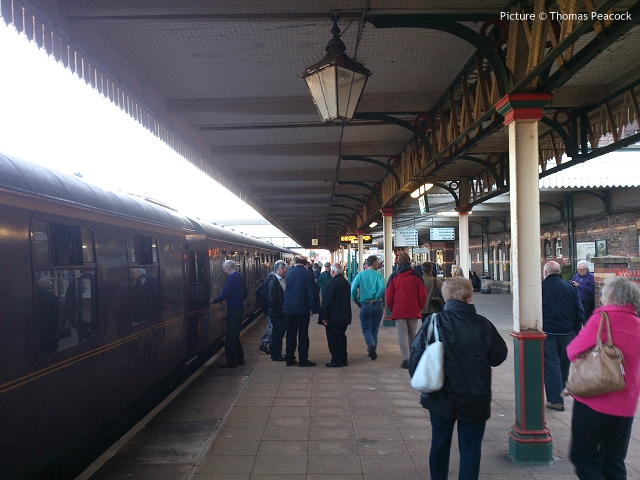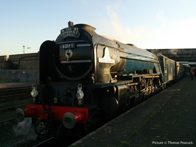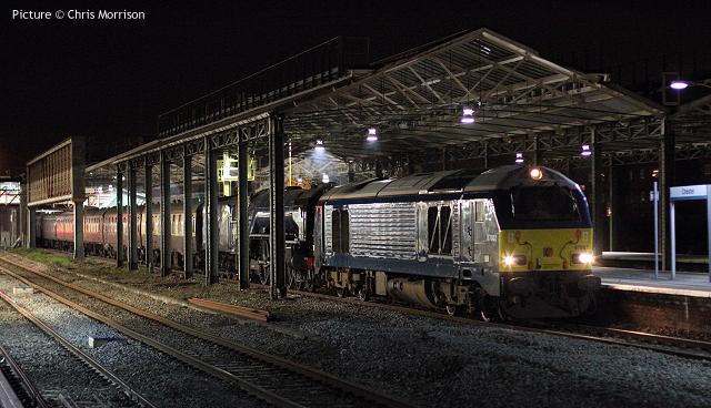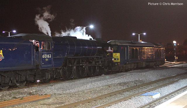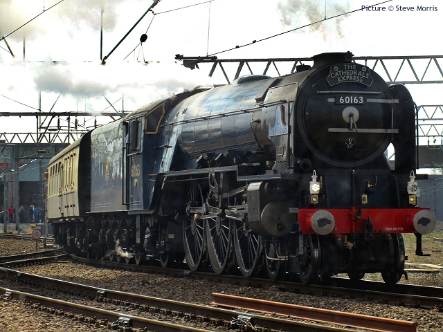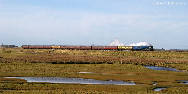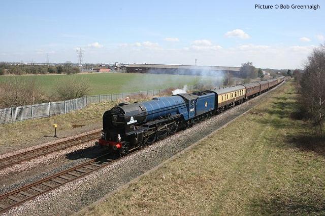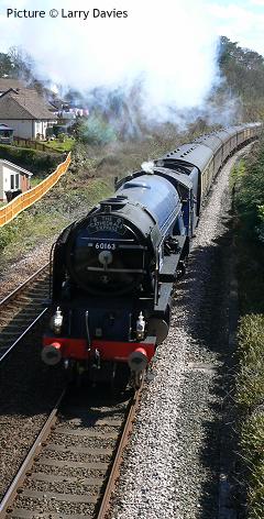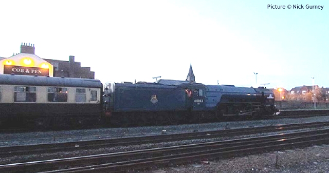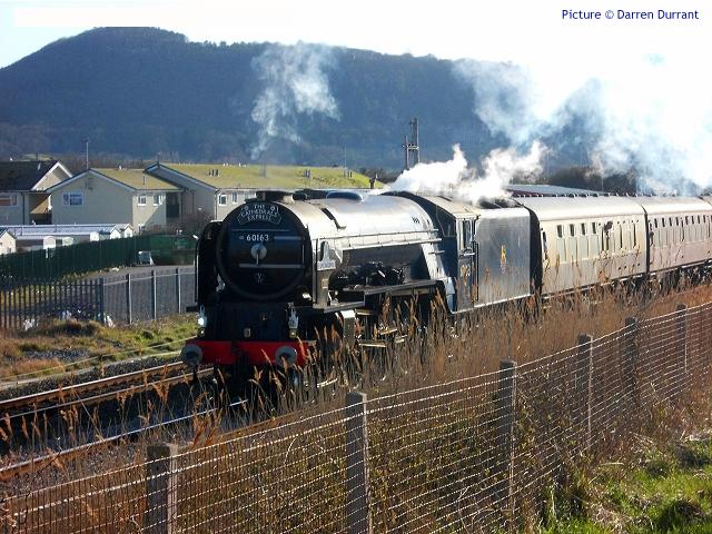 ![]() The London - Holyhead 'Cathedrals Express' charter of 20 April passes near Puffin Roundabout, Penmaenmawr, 20 April, hauled by 60163 Tornado; Picture by M.Lloyd Davies. Large number of pictures received this weekend! This page concentrates on the two special trains which served Holyhead on 20 April; I've tried to include as many people's pictures as I can. (If I've missed you it's probably a mistake!) Some other topics will follow in an extra issue later in the week, hopefully. Thanks to all for your support. - Charlie Cathedrals Express ... comes to grief![]() Departing from Crewe, as seen from the Heritage Centre (Steve Morris). This was the first appearance of the newly-built pacific on the North Wales line. ![]() Mold Junction (Bob Greenhalgh). No. 60163 has been running since last year in the British Railways express-loco blue that it might have worn had it been built in 1948-9 with the original fleet of Class A1 locomotives. British Railways abandoned this colour scheme, in favour of dark green, after a short time, supposedly because the blue paint did not weather well. The same livery recently appeared on Great Western Railway 'King' 4-6-0 No. 6023 King Edward II and is soon to adorn 4-6-0 Foxcote Manor at the Llangollen Railway. ![]() Abergele station (Larry Goddard). 20 April was a sunny spring day, which brought out the photographers in considerable numbers. Several of our contributors were present, including some new ones and some we had not hear from for a while - our thanks to all of them. ![]() Abergele station (Larry Goddard). ![]() Abergele (Alan Roberts) ![]() Llandudno Junction (Denis Oliver). The train, like other 'Cathedrals Express' charters, was organised by 'Steam Dreams', a firm which regularly makes use of Tornado - not surprisingly since Graeme Bunker, Managing Director of Bryherley Ltd , trading as Steam Dreams, is also the Operations Director of the owners of the loco, the A1 Steam Locomotive Trust, and was one of the first to drive it. Readers may also remember him as Managing Director of Arriva Trains Wales from 2004 to 2006. ![]() Departing Llandudno Junction with the line to Llandudno in the foreground (Greg Mape). ![]() Crossing Conwy Cob (Chris Taylor). ![]() One man concentrates on his bowls while everyone else admires the train passing Conwy Castle (Chris Morrison). ![]() The view from the hill of Conwy Castle (Garry Stroud). ![]() Picture by Chris Taylor. See also Chris's Flickr site. ![]() Conwy station (Darren Durrant) ![]() From the train, near Penmaenmawr. Picture by Thomas Peacock, who writes: 'I joined the tour at Chester, where it arrived on time, to find a sea of photographers and the like trying to get a glimpse of this famous locomotive. Tornado departed Chester 'bang-on' 12:08 and travelled on time and without incident all the way to Holyhead. The views and the weather were fantastic from start to finish.' ![]() Maelltraeth (Digitally edited image by Jack Bowley). ![]() Holyhead (Ken Robinson). Thomas's report continues: 'Once we had arrived at Holyhead, the support crew wasted no time in uncoupling Tornado from the stock and having her sent off to Valley for turning and re-fuelling, briefly pausing for a few photographs.' ![]() 'Arriva Trains Wales loco 67 002 was on hand to shunt the stock in and out of the station.' Picture by Jack Bowley. ![]() Tornado backs on to the train for the return journey (Stavros Lainas). ![]() Rhosneigr (Jack Bowley). ![]() Rhosneigr (Chris Morrison). ![]() Pont Myfyrian, near Gaerwen (Ken Robinson). 'Once re-fuelled and the stock had been put shunted back into the station, we departed Holyhead on time at 17:02 and proceeded through the Anglesey countryside to the Britannia Tubular Bridge and into Bangor five minutes early (17:38). Again, departing on time we had a good run back to Conwy, passing Penmaenmawr at some speed. Crossing the Conwy Tubular Bridge, we continued our early streak by passing Llandudno Junction at 18:04, again 3 minutes early. From this point on, things went drastically downhill.' ![]() Pensarn (Darren Durrant). Tom continues: 'As we approached Abergele & Pensarn, we came to an almost complete stop just outside the station, even though the home signal was 'clear'. At this point, a chap stood next to me at the window pointed out that he hadn't heard the compressors (which make a distinctive 'chuffing' sound and provide air pressure to brakes on the locomotive and carriages) working for some time. It quickly became apparent that the crew on the footplate were deeply concerned about this and we crawled into Rhyl station at a walking pace, coming to a stand with the front of the train just beyond the platform. ![]() Setting back into Rhyl station, safety valves blowing (Thomas Peacock). ![]() 'Almost immediately, the support team and footplate crew declared Tornado a failure (at 18:26) and asked for assistance from Crewe. The locomotive was able to push the stock into the platform completely to allow all passengers and staff to disembark and stretch their legs. The management team were incredibly helpful and assisted in any way possible.' ![]() Waiting for assistance (Thomas Peacock). ![]() Passengers 'stretch their legs' at Rhyl (Thomas Peacock). ![]() Gathering gloom (Nick Gurney). 'Two and a half and half hours later (21:00) loco 67 002 arrived from Holyhead, joined the front of the tour and hauled Tornado and the stock, along with some very tired passengers, back to Crewe, where it arrived at 22:31, A whole 179 minutes late.' The eventual rescue operation, in darkness, was recorded on Video by YouTube member Video47. ![]() Above: 67 002 dragging Tornado into Chester at 22:03. Picture by Chris Morrison, who writes: 'I thought I'd enjoy a first day up the Coast this year photographing Tornado. All was going pretty well I thought, as I sat on on the Arriva train home (17:30 from Holyhead) until we ground to a halt next to the signalbox at Abergele station at about 18:40. The driver exp