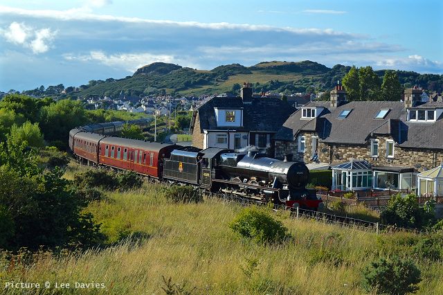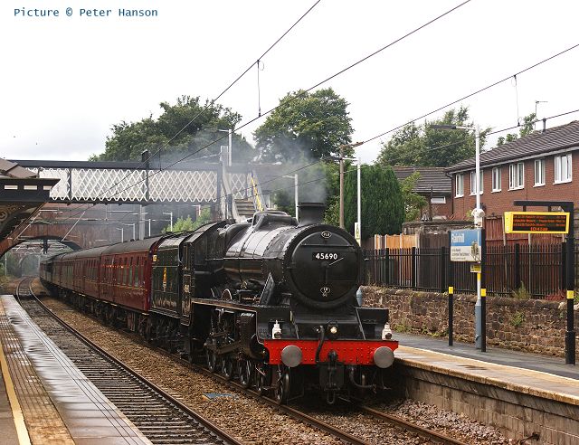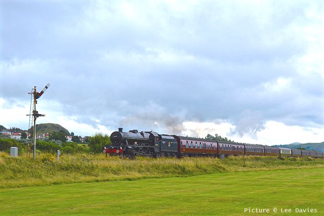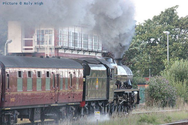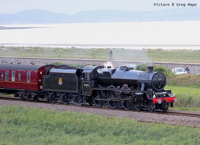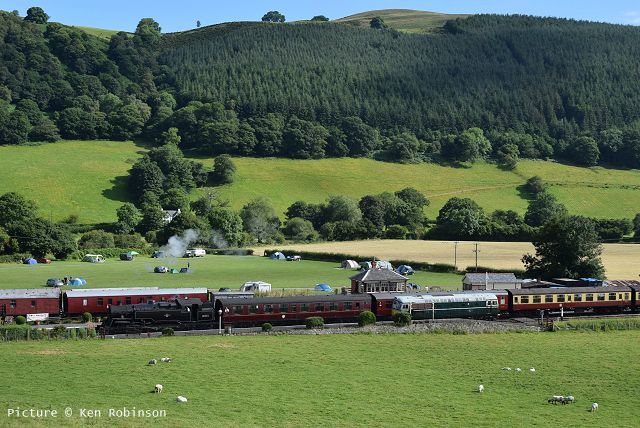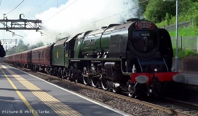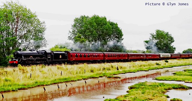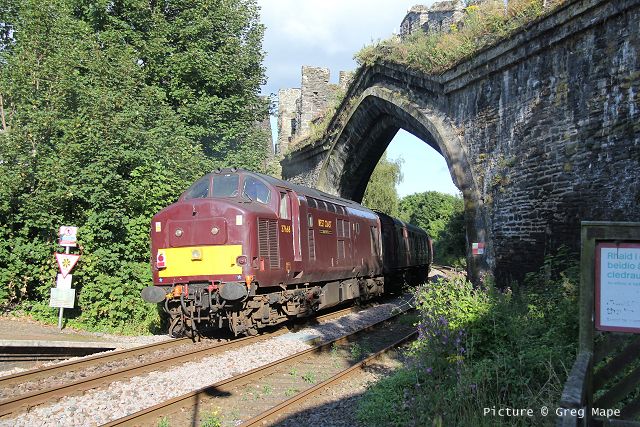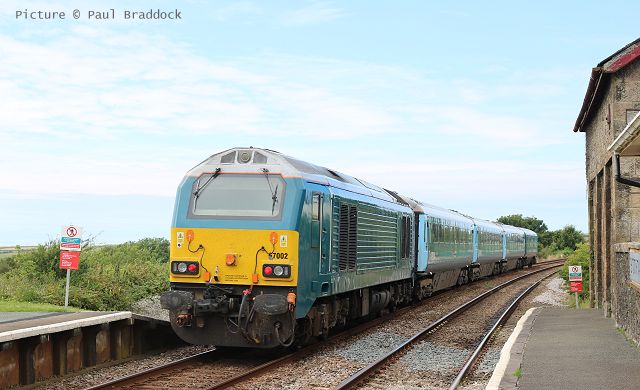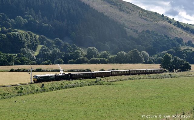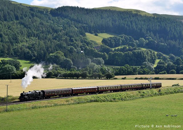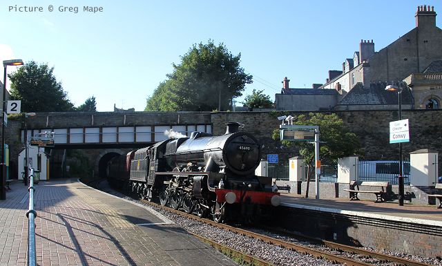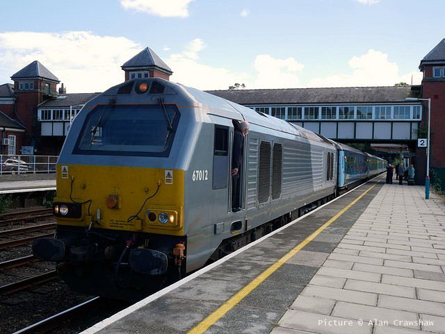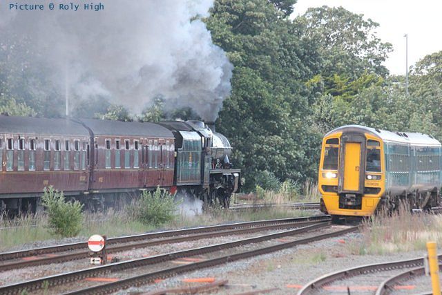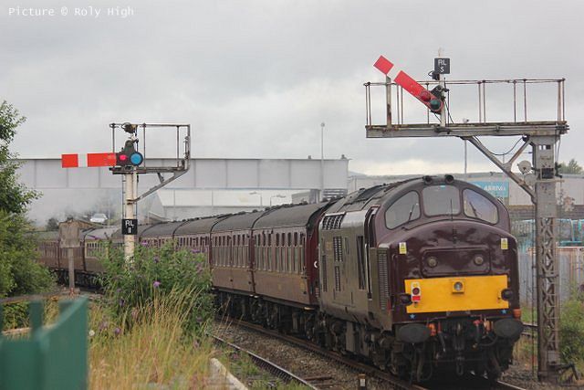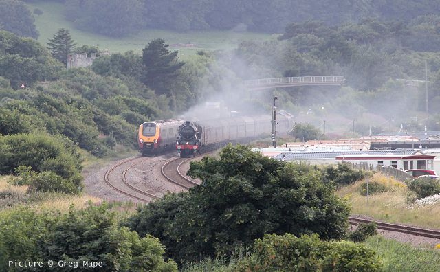 ![]() Silver and Gold as 67 012 pauses at Chester with the 19:34 Llandudno - Crewe train, 4 July. Picture by Eurwyn McMahon. 'Eisteddfod' to visit Eisteddfod![]() Following on from our item last issue about the nameplates of 37 429 Eisteddfod Genedlaethol, Dafydd Roberts, Keeper, of the National Slate Museum in Llanberis write to tell us that the nameplate acquired by Amgueddfa Cymru-National Museum Wales will be displayed on the Museum's stand in 'Y Lle Hanes' at this year's National Eisteddfod in Abergavenny, but on the final Saturday of the Eisteddfod - Saturday 6 August. Restoration work on it is almost complete, and Amgueddfa Cymru's Transport Curator, Dr David Jenkins, has prepared an accompanying panel looking at the history of the use of Class 37 locomotives in Wales. An excuse for another 37/4 picture: The view above, taken c. 1994 by the late Peter Hutchinson and now in the care of the Manchester Locomotive Society, shows 37 429 in its black-nameplate days arriving at Chester from North Wales. Behind the loco is one of the coaches transferred from the Waterloo - Exeter line, and still in Network SouthEast colours with the red lower stripe converted to blue. Does anyone know when the last of these received full Regional Railways colours? ![]() Dafydd also reminds us that railcar 175 003 was named Eisteddfod Genedlaethol Cymru by Bryn Terfel, at a ceremony held at Bangor station during the 2005 National Eisteddfod. Above is Eryl Crump's picture of the occasion from our archives. The name was applied to the unit whilst still in the colours of the First North Western company as a vinyl sticker, but does not appear to have survived the repainting into Arriva livery a few years later. Arriva seem to dismiss the idea naming of rolling stock, despite the publicity value of the naming ceremony; it will be a shame if their takeover of the Northern fleet results in the loss of the many interesting names worn by units in that fleet. It's probably best not to hold a public competition for a name though: that resulted in 175 103 being christened Mum. North Wales Coast Express![]() 24 July saw the commencement of this summer's series of Railway Touring Company 'North Wales Coast Express ' steam excursions with a run from Liverpool Lime Street to Llandudno and Holyhead. We pick up the train (1Z95. 10:04 from Liverpool) at Rainhill, with George Stephenson's famous skew bridge in the background. Picture by Peter Hanson. ![]() Frodsham (Phil Clarke). Although ultimately the names comes from classical mythology, like sister loco Galatea the loco was one of a series named after warships. In this case HMS Leander a light cruiser completed in 1933, as the fifth Royal Navy ship to carry the name, which was first used for a warship in 1780. The name passed to a frigate launched in 1961, which was eventually sunk while being used for target practice in 1989. ![]() Helsby (Phil Clarke). Train crews here have to be on the lookout for the signal which is on the fireman's side of the train for sighting purposes when rounding the curve, a vital part of their 'route knowledge.' ![]() Passing the flushing pools at Bagillt, the coaching stock reflecting in the water following a heavy shower. Note the two 'brake-end' coaches behind the loco; the first one is the support coach (Glyn Jones). ![]() Rhyl (Roly High). ![]() On the rear, in place of the more usual Class 47 or 57 used by West Coast Railways on tail-end Charlie duty, 37 668, which seems to have a rather squashed face (Roly High). This is one of the two West Coast locos, the other being 37 669, which are fitted with Hitachi ERTMS signalling equipment for use on the Cambrian lines. The Doppler radar and balise (transducer) antenna equipment has been fitted by re-designing one of the underfloor fuel tanks. 37 668 was tested on the Cambrian lines a few months ago, but we have hear of no revenue-earning work by either loco on ERTMS-fitted routes. Here is a link to an article by the people who carried out the work. ![]() Deganwy (Jim Ikin). ![]() Conwy (John Myers). ![]() Maesdu Golf Course, Llandudno, by Llandudno station's home signal (Lee Davies). ![]() Approaching Llanfair PG (Alan Crawshaw). The modern LED signal protecting the crossing contrasts with the signalbox which dates from around 1870, before the London and North Western Railway developed its familiar standard style. ![]() After arrival at Holyhead, Leander ran back to the triangle at Valley to turn (Lee Davies). The repaint in British Railways black helps to distinguish Leander from other preserved 'Jubilees' but on the other hand, creates a resemblance to the more common 'Black 5' type. The larger driving wheels with their 'splashers' are the most obvious identification point. ![]() The return train at Conwy (Greg Mape) ![]() 37 668 on the rear and Robert Stephenson's archway through Conwy walls (Greg Mape). ![]() Leaving the Conwy Tubular Bridge and approaching Llandudno Junction (Lee Davies). ![]() From Llandudno Junction, the train was 'dragged' by the Class 37 backwards down the Llandudno branch to collect the passengers who had alighted there (Lee Davies). The shunting moves at Holyhead on these occasions are more complex than one might think, as the Support Coach has been moved to the other end of the rake of coaches in order to stay with the loco. ![]() Passing one of the Jubilee's modern successors near Gwrych Castle (Greg Mape). ![]() Abergele, with precarious photographer in the background (Greg Mape) ![]() Rhyl, with smoke effects (Roly High). ![]() About to be 'photo-bombed' east of Rhyl by 158 826 with the ex 17.07 Birmingham International via Crewe to Holyhead (Roly High). Picture miscellany![]() The New Measurement Train at Prestatyn, 14 July, 43 014 The Railway Observer leading (Dave Sallery). ![]() 37 716 and 37 609 on 18 July on flasks westbound at 07:39 on Malltraeth viaduct (Paul Braddock) ![]() 67 012 at Bangor with the 09:50 from Manchester, 18 July (Alan Crawshaw). ![]()