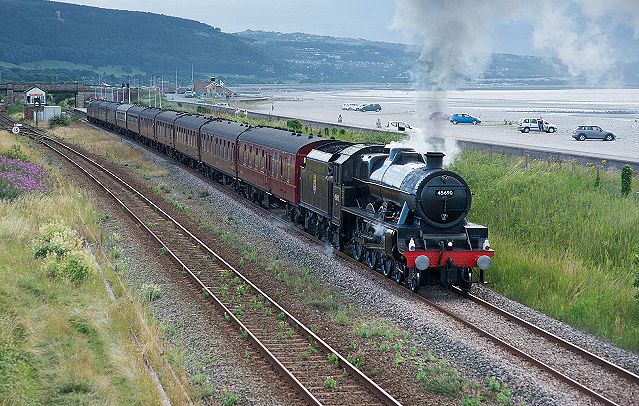![]() Silver and Gold as 67 012 pauses at Chester with the 19:34 Llandudno - Crewe train, 4 July. Picture by Eurwyn McMahon. 'Eisteddfod' to visit Eisteddfod![]() Following on from our item last issue about the nameplates of 37 429 Eisteddfod Genedlaethol, Dafydd Roberts, Keeper, of the National Slate Museum in Llanberis write to tell us that the nameplate acquired by Amgueddfa Cymru-National Museum Wales will be displayed on the Museum's stand in 'Y Lle Hanes' at this year's National Eisteddfod in Abergavenny, but on the final Saturday of the Eisteddfod - Saturday 6 August. Restoration work on it is almost complete, and Amgueddfa Cymru's Transport Curator, Dr David Jenkins, has prepared an accompanying panel looking at the history of the use of Class 37 locomotives in Wales. An excuse for another 37/4 picture: The view above, taken c. 1994 by the late Peter Hutchinson and now in the care of the Manchester Locomotive Society, shows 37 429 in its black-nameplate days arriving at Chester from North Wales. Behind the loco is one of the coaches transferred from the Waterloo - Exeter line, and still in Network SouthEast colours with the red lower stripe converted to blue. Does anyone know when the last of these received full Regional Railways colours? ![]() Dafydd also reminds us that railcar 175 003 was named Eisteddfod Genedlaethol Cymru by Bryn Terfel, at a ceremony held at Bangor station during the 2005 National Eisteddfod. Above is Eryl Crump's picture of the occasion from our archives. The name was applied to the unit whilst still in the colours of the First North Western company as a vinyl sticker, but does not appear to have survived the repainting into Arriva livery a few years later. Arriva seem to dismiss the idea naming of rolling stock, despite the publicity value of the naming ceremony; it will be a shame if their takeover of the Northern fleet results in the loss of the many interesting names worn by units in that fleet. It's probably best not to hold a public competition for a name though: that resulted in 175 103 being christened Mum. North Wales Coast Express![]() 24 July saw the commencement of this summer's series of Railway Touring Company 'North Wales Coast Express ' steam excursions with a run by 45690 Leander from Liverpool Lime Street to Llandudno and Holyhead. We pick up the train (1Z95. 10:04 from Liverpool) at Rainhill, with George Stephenson's famous skew bridge in the background. Picture by Peter Hanson. Although ultimately the name Leander comes from classical mythology, like sister loco Galatea the loco was one of a series named after warships. In this case HMS Leander a light cruiser completed in 1933, as the fifth Royal Navy ship to carry the name, which was first used for a warship in 1780. The name passed to a frigate launched in 1961, which was eventually sunk while being used for target practice in 1989. ![]() Helsby (Phil Clarke). Train crews here have to be on the lookout for the signal which is on the fireman's side of the train for sighting purposes when rounding the curve, a vital part of their 'route knowledge.' ![]() Passing the flushing pools at Bagillt, the coaching stock reflecting in the water following a heavy shower. Note the two 'brake-end' coaches behind the loco; the first one is the support coach (Glyn Jones). ![]() Rhyl (Roly High). ![]() On the rear, in place of the more usual Class 47 or 57 used by West Coast Railways on tail-end Charlie duty, 37 668, which seems to have a rather squashed face (Roly High). This is one of the two West Coast locos, the other being 37 669, which are fitted with Hitachi ERTMS signalling equipment for use on the Cambrian lines. The Doppler radar and balise (transducer) antenna equipment has been fitted by re-designing one of the underfloor fuel tanks. 37 668 was tested on the Cambrian lines a few months ago, but we have hear of no revenue-earning work by either loco on ERTMS-fitted routes. Here is a link to an article by the people who carried out the work. ![]() Deganwy (Jim Ikin). ![]() Conwy (John Myers). ![]() Maesdu Golf Course, Llandudno, by Llandudno station's home signal (Lee Davies). ![]() Approaching Llanfair PG (Alan Crawshaw). The modern LED signal protecting the crossing contrasts with the signalbox which dates from around 1870, before the London and North Western Railway developed its familiar standard style. ![]() After arrival at Holyhead, Leander ran back to the triangle at Valley to turn (Lee Davies). The repaint in British Railways black helps to distinguish Leander from other preserved 'Jubilees' but on the other hand, creates a resemblance to the more common 'Black 5' type. The larger driving wheels with their 'splashers' are the most obvious identification point. ![]() The return train at Conwy (Greg Mape) ![]() 37 668 on the rear and Robert Stephenson's archway through Conwy walls (Greg Mape). ![]() Leaving the Conwy Tubular Bridge and approaching Llandudno Junction (Lee Davies). ![]() From Llandudno Junction, the train was 'dragged' by the Class 37 backwards down the Llandudno branch to collect the passengers who had alighted there (Lee Davies). The shunting moves at Holyhead on these occasions are more complex than one might think, as the Support Coach has been moved to the other end of the rake of coaches in order to stay with the loco. ![]() Passing one of the Jubilee's modern successors near Gwrych Castle (Greg Mape). ![]() Abergele, with precarious photographer in the background (Greg Mape) ![]() Abergele (Tim Rogers). ![]() Rhyl, with smoke effects (Roly High). ![]() About to be 'photo-bombed' east of Rhyl by 158 826 with the ex 17.07 Birmingham International via Crewe to Holyhead (Roly High). Picture miscellany![]() The New Measurement Train at Prestatyn, 14 July, 43 014 The Railway Observer leading (Dave Sallery). ![]() 37 716 and 37 609 on 18 July on flasks westbound at 07:39 on Malltraeth viaduct (Paul Braddock) ![]() 67 012 at Bangor with the 09:50 from Manchester, 18 July