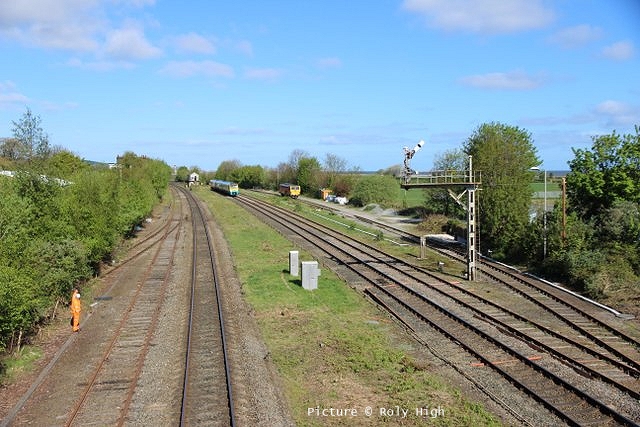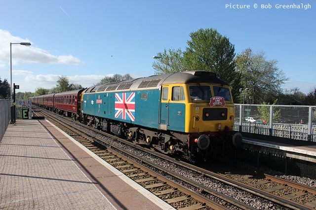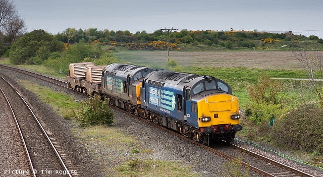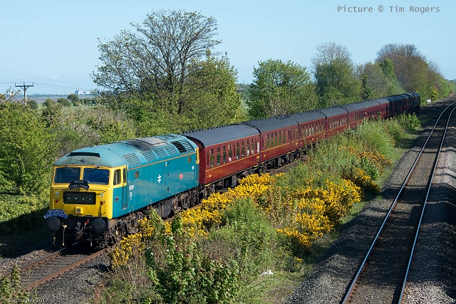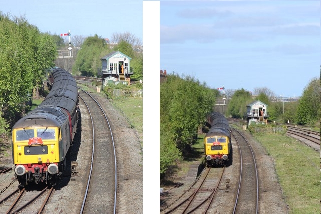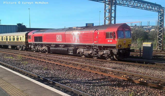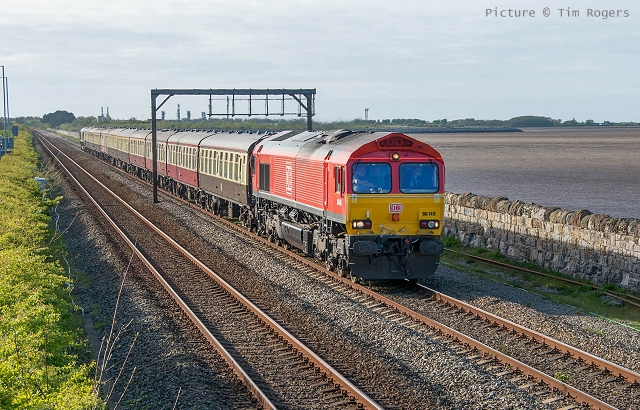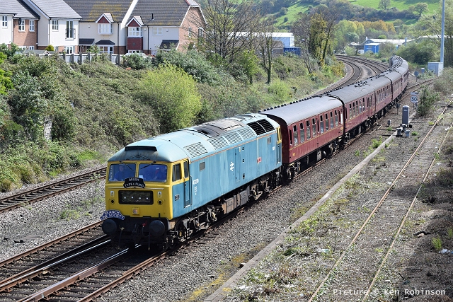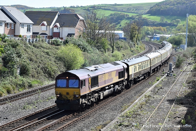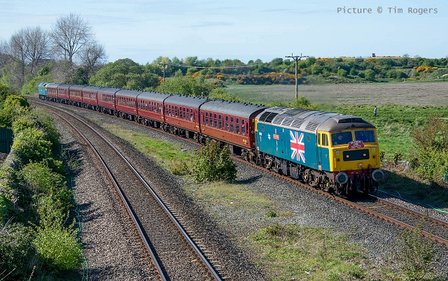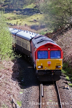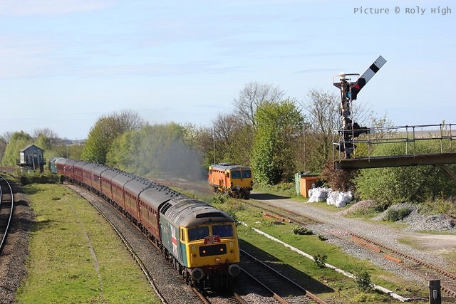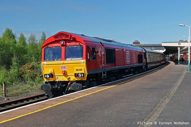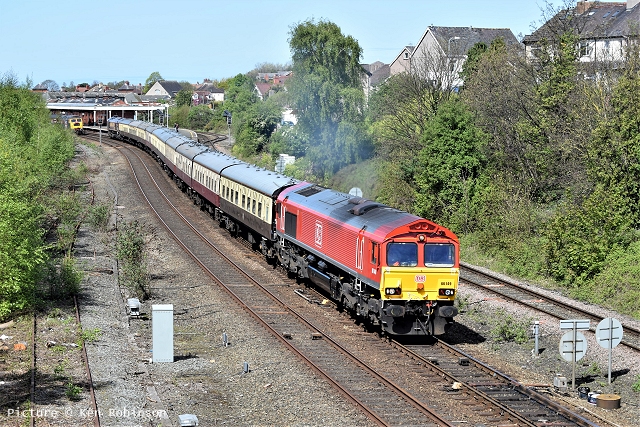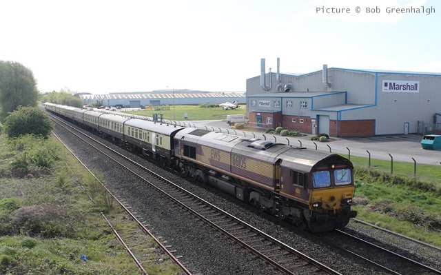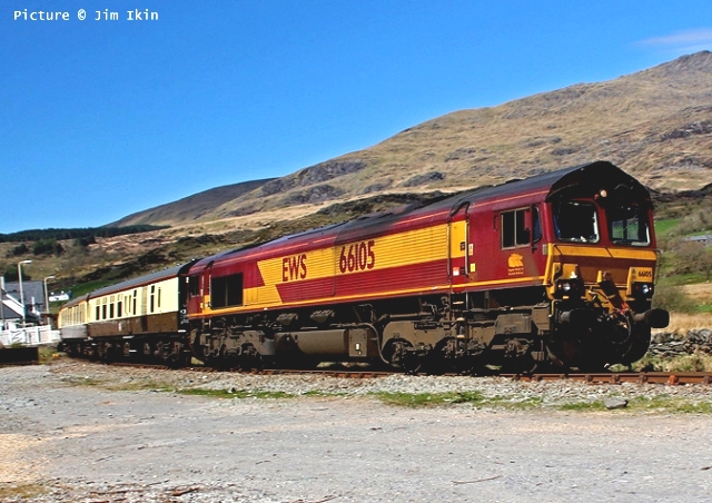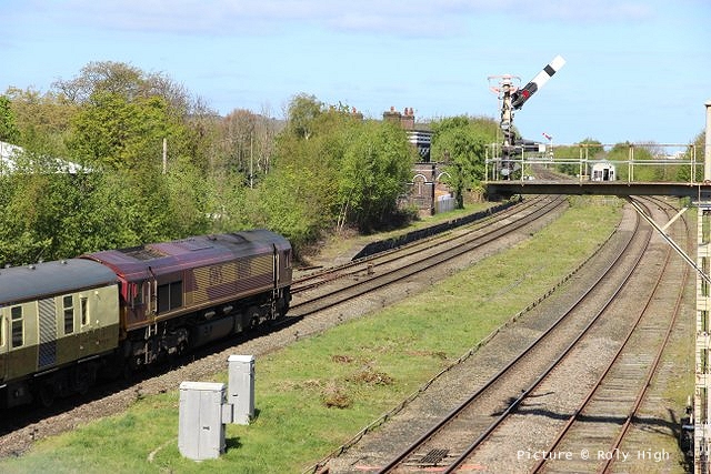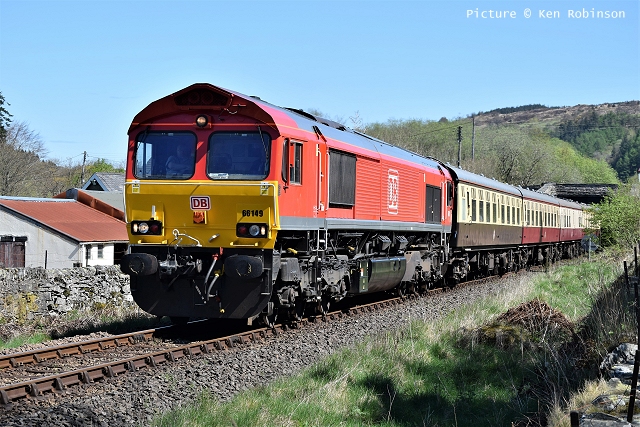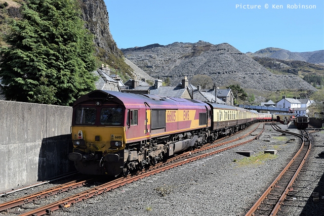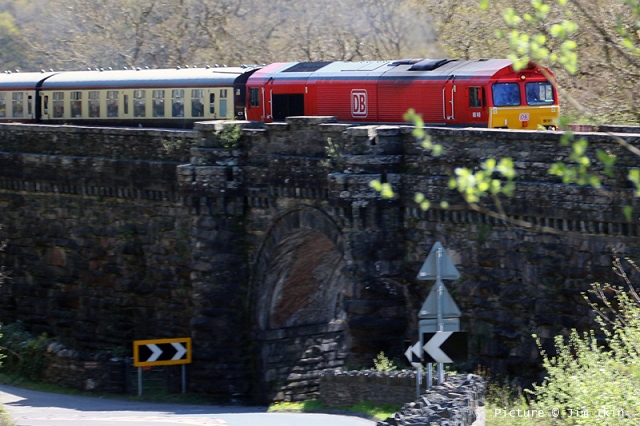 ![]() Llandudno Junction, 22 April. Picture by Jim Ikin. Specials Special22 April saw two railtours make their way along the coast: a Branch Line Society rare-track-hunting affair, dubbed 'Y Triongl Gogledd Cymru' and a more conventional excursion, 'The Conwy Explorer' from London by UK Railtours. ![]() Let's look first at the UK Railtours train, 1Z77 06:39 London Euston - Blaenau Ffestiniog (12:50 - 13:10) - Llandudno (arr 14:46) and 1Z78 17:15 Llandudno - London Euston (arr. 22:17). Passengers had the bookable option of leaving the train at Blaenau Ffestiniog, travelling by Ffestiniog train to Porthmadog, then by road coach to re-join the tour train at Llandudno. The train was hauled from London to Crewe by a Class 90 electric loco, where a top-and-tail pair of DB Cargo class 66s. Above, 66 105 takes the outbound train past Hawarden Airport and the premises of Marshall Aviation Services. Picture by Bob Greenhalgh. ![]() 66 105 approaches the remains of the former Holywell Junction station with its original Chester and Holyhead Railway station building (Roly High). ![]() Arrival at Llandudno Junction (Ken Robinson). ![]() Ready to start for the Conwy Valley (Jim Ikin). ![]() Departure for Blaenau Ffestiniog with 66 149 leading; the Branch Line tour is in the station (Ken Robinson). ![]() 66 149 crosses Pont Gethin Viaduct over the A470 (Jim Ikin). ![]() 66 149 passes Dolwyddelan on its way to Blaenau. Vegetation growth no longer permits one to take the 'traditional' shot from a bit further on (Ken Robinson). ![]() 66 105 on the rear at Blaenau Ffestiniog (Ken Robinson). This loco took the train pack down the valley after a short visit. ![]() 66 149 on the rear, leaving Blaenau Ffestiniog (Dave Sallery). ![]() Ffestiniog Railway Fairlie David Lloyd George arriving at Blaenau with the 11:25 from Porthmadog. Four coaches of the 13:40 return departure were reserved for railtour participants (Dave Sallery). ![]() Roman Bridge (Jim Ikin). ![]() The return with 66 149 leading passes Mostyn (Tim Rogers). ![]() Chester (Eurwyn McMahon). Y Triongl Gogledd Cymru![]() The Branch Line Society's tour, run in conjunction with the Brush Type 4 Fund, which is dedicated to preserving Class 47 locos, started at Carnforth and followed a complex itinerary including a visit to various rare loops and such like, including the un-numbered platform at Hooton. Above, 47 580 County of Essex leads the Branch Line Society charter through Bache station heading from Chester to Hooton. 47 270 Swift is on the tail (Bob Greenhalgh). ![]() Promised highlights of the trip included traversing the Up and Down Goods Loops at Holywell Junction, surviving fragments of the former quadruple track sections which were a feature of the Coast line. I was reported that they had been 'specially fettled' in time for this tour and for use by engineering trains for work in the near future which will involve their removal. A Network Rail Mobile Operations Manager was on hand on the day to keep an eye on things: He's seen in Roly High's picture acknowleging the passage of a Class 175. ![]() In the Down Loop, which is the former Down Slow line (Roly High). The tamper opposite is in the Up Siding. Once there were four platforms here, allowing trains on the buth the outer Slow lines and the central Fast lines to call. ![]() The turnout in these views by Roly High of 47 580 on the rear of the train was formerly the link to the branch line to Holywell Town (closed in 1954), although there was no direct link to the branch: passenger trains used a bay platform, and any trains to or from the main line had to make a double reversal, a wise precaution as the branch had one of the steepest gradients in the country. The right-hand view shows the train passing the platform; Roly writes: 'In all my years would I have thought I would ever see a passenger train at Holywell Junction station again.' ![]() Arrival at Llandudno Junction, 7 minutes late (Ken Robinson). At Holyhead, passengers were treated to various moves including a visit to the carriage washer. ![]() It had been planned to use the Up loop - the former Up Slow line at Holywell Junction on the return run, but in the even, the train stayed on the main line. According a a report on the always-useful wnxx forum, the Mobile Operations Manager 'did not have the right key.' ![]() Above, approaching Bagillt on the return run (Tim Rogers). ![]() Heading east through the gorse at Bagillt (Tim Rogers). The black headboard of the Branch Line Society and the 'Brush Type 4 Fund' one stayed on 47 270 when it was rear loco. Freight scenes![]() The eastbound flask train on 17 April, with 37 259 and 37 602 and FNA wagons 550034 and 550031 (Tim Rogers). DRS have now sold several of the 37/6 batch, but 602 remains in flask action. ![]() On 22 April 66 128 and 66 116 pass Shotton high level with train 6M76, 00:41 Margam to Dee Marsh steel train, 281 minutes late after 66 116 failed in the Wooferton area, south of Ludlow (Tim Rogers). North Wales Coast home page | Archive | Previous Notice Board |