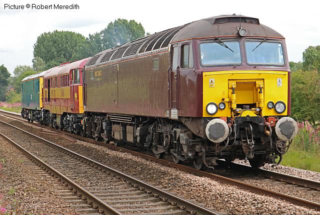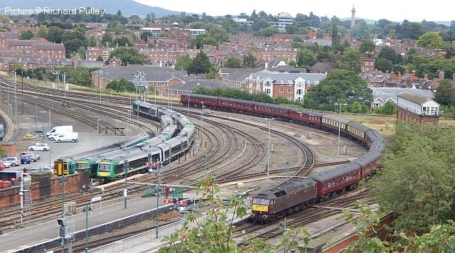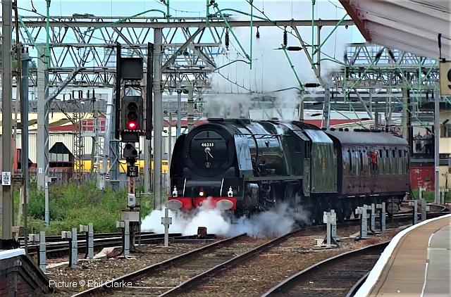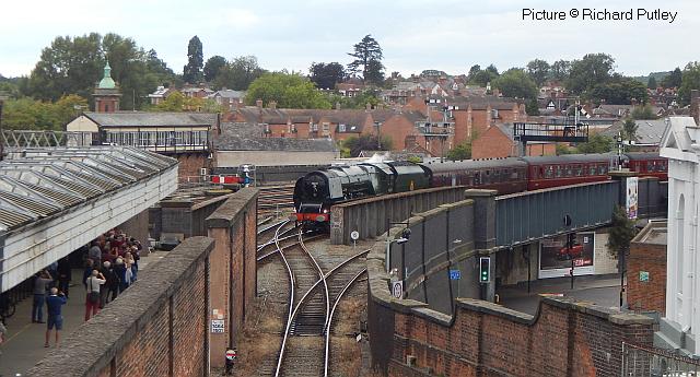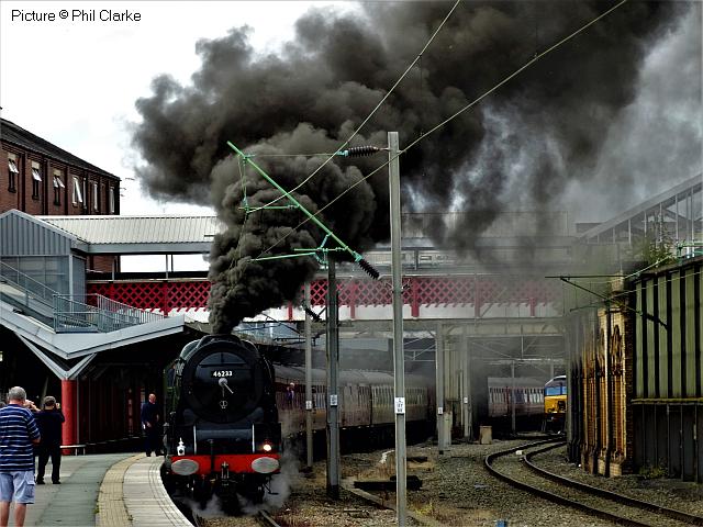 ![]() The view from Shrewsbury Castle as a Virgin Class 221 departs with the 15:24 to London Euston on 13 August. Picture by Richard Putley, Duchess in action![]() Steam Dreams - 'Cathedral Express' on Sunday 13 August was diesel hauled from London Paddington to Cosford (for the RAF Museum), Shrewsbury and Crewe where steam pacific 46233 Duchess of Sutherland was attached for the return run. One-way steam is becoming a trend in the operation of this kind of excursion. Above, West Coast Railways 47 746 Chris Fudge 29.7.70 - 22.6.10 brings the train into Shrewsbury, photographed from the castle by Richard Putley. ![]() 42633 emerged from Crewe Heritage Centre to take over the return train from Crewe (Phil Clarke). ![]() An impressive machine (Phil Clarke).... ![]() ... if rather smoky (Phil Clarke). ![]() Duchess of Sutherland is seen passing through Wrenbury heading towards Shrewsbury to pick up the passengers, with West Coast Railways 47 746 Chris Fudge 29.7.70 - 22.6.10 attached to the rear of the train (Robert Meredith). ![]() The return leg of the tour arrived with the Duchess on time at 17:30 and departed right time at 17:40 (Richard Putley). Malgorithms (as Private Eye might say)![]() Above is an extract from the departure sheet at Chester station. Note 'b' means 'change at Crewe' but where are all the Arriva Trains Wales direct trains which run from North Wales to Manchester Airport? The explanation must be that the computer thinks it is slightly quicker to go to Crewe and change to a Northern train, but who would choose to have to shift all their giant suitcases over from Platform 9 at Crewe to Platform 1 when they could go direct in a comfortable Class 175? Surely the passenger should be given the choice, especially since Arriva had to overcome objections to get their trains to the Airport in the first place? Welsh Highland Heritage Railway - with George Jones![]() A trip to Porthmadog allowed for a visit to the Welsh Highland Heritage Railway on Thursday 10 August to see how things were progressing at the site adjacent to the mainline station. The service train comprised three coaches and a guard's van hauled by Andrew Barclay 0-4-0ST "Gertrude" which was captured backing on to the 13:15 departure after the lunch time break (above). ![]() The loco's works plate gives the details of date: built 1918 and works number 1578. ![]() One of the coaches in use was original Welsh Highland Railway Buffet Car after it was recovered as a split-in-half garden shed and heavily rebuilt, along with No.9, in former North Wales Narrow Gauge Railway colours, making a colourful consist. ![]() Family groups find the short ride to Pen y Mount an attractive option in terms of time and cost, coupled with the opportunity to take in the museum and running shed with its hands on entertainment and historical summaries of the area. The Porthmadog bypass road intrudes on the journey and these days splits the line into two parts on the trip out to the Pen y Mount terminus. Above, Gertrude at the head shunt against the classic view of Cnicht in the Moelwynion background. This is the limit of the WHHR's line where there is a connection with the WHR's mainline. Housing the ground frame is the structure originally intended to guard the Welsh Highland Railway flat crossing with the main line. After watching the loco run round, the return train stops over at Fferm Gelert to allow half-an-hour for a look around and a ride on the miniature railway. ![]() Inside the museum the Pecket 0-4-2T Karen remains a static exhibit, with the frames of Lady Madcap demonstrating the basis of another Hunslet ex quarry loco restoration project as described in the notice. ![]() In the running shed the other operational steam engine, the surviving original Welsh Highland Ralway loco Russell (Hunslet 901 of 1906) was on display ... ![]() ... along with several of the large Romania-built ex-PKP diesels (Polish State Railways) of which only No.60 is operational on special events due to its high running costs. ![]() Modern day Hunslet diesel 'EMMA' was outside ready to provide an off-peak non-steam service. ![]() A line up of industrial Simplex rail motors illustrates aspects of narrow gauge workings and includes the ghostly Rushton & Hornsby type 48DLG restored in an all white scheme and named 'Berwyn' in recognition of its one time service at Gresford colliery, near Wrexham, from 1963 with a period at Point of Ayr 1968-1973. see pic. The current commemoration of aspects relating to the first World War is catered for by a display of equipment, including Simplex 264, as used in the area supplying the trenches and an imaginative recreation of the Easthock District Traffic Control Office, near Ypres, which shows how the War Department supply trains were organised. ![]() Back at the Porthmadog terminal the static tank wagon for Purple Moose Brewery is a colourful backdrop to the station scene and may offer a close encounter with a passing Arriva Trains Wales on the Cambrian line. A visit to the WHHR remains an entertaining interlude within its parameters, aided by the splendid bookshop with its many attractive new titles for sale. Miscellany![]() On 13 August, 150 236 departs from Shrewsbury as the 16:18 to Cardiff Central via the Heart of Wales line (Richard Putley). The semaphore signal was installed in 2010 when it was decided to bring Platform 3 in to more regular use, and allows passenger trains to depart to the south, a move which was previously controlled by a ground signal, meaning only trains without passengers were allowed to pass. In practice it sees little use, and appears not to lift by quite the standard angle. ![]() On 8 August a working from Bury (East Lancashire Railway) to Lydney is seen passing the foot crossing off Queens Drive Nantwich, with West Coast Railways 57 315 towing 31 466 and 73 001 returning the two Dean Forest Diesel Association engines from the East Lancashire Railway back to the Dean Forest Railway. ![]() 7