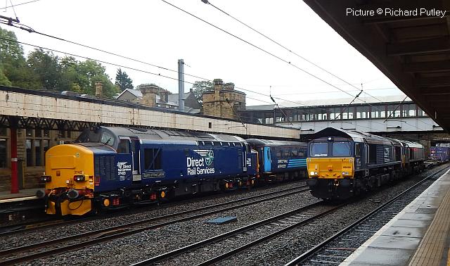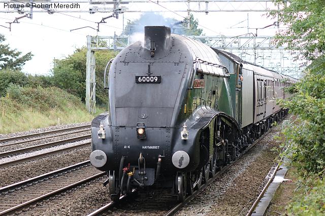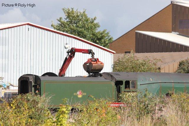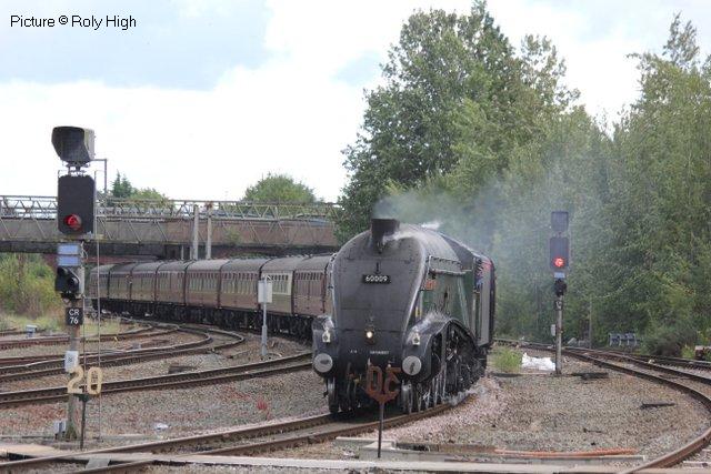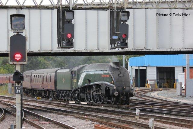 ![]() 2-6-4T 42647 at Birkenhead (Woodside) on 26 February 1967, awaiting departure with a Paddington train. Picture by John Hobbs, from our 20 March issue. John HobbsWe are saddened to hear of the death of John Hobbs, one of our more regular contributors, after a short illness. He was a stalwart member of the North Cheshire Rail Users' Group, playing an active role in their campaigns including the re-opening of the Halton curve; it's good that he lived to see work actually starting on that project, and to unveil a plaque recognising his support for the railway as a means of transport. Our sympathies are with his wife Kathleen and all the family. Tony Robinson writes: 'John served an engineering apprenticeship commencing in 1964 at Hawker Siddeley Aviation, Chester. We were apprentices together in the days when he was out 'photting' the last of the steam workings in his spare time. He was employed in later years as an insurance investigating engineer for British Engine and specialised in cranes and heavy lifting devices. Above, and below, are a very small selection of John's pictures, with his original captions, from our website archive. For many more, select 'archive' from the options in the left column and search the page for his name (Ctrl-F in Windows). ![]() At Chester on 29 February 'Grange' class 4-6-0 6839 Hewell Grange is also getting steam up, ready to leave with the 2.30 to Paddington the 'Inter City'. This train would inevitably pass the combined 12.50pm Bangor / 1.05pm Llandudno to Euston on the curve outside the station; this was due to arrive at 2.32pm, so there were two London-bound trains progressing in opposite directions, the former due in Paddington at 6.59pm and the latter in Euston at 6.27 pm. It looks like the 'rot set in' earlier on the ex-Western Region depots as the 'Grange' is quite scruffy though still with cab number plates and nameplates. A Western Region brown & cream liveried Mk 1 brake leads the formation while the iconic towers of the Italianate station building can be seen in the background with the tall chimney from the lead works looming in the distance. ![]() Collett 0-6-0 2236 at Morfa Mawddach waiting to work light engine to Barmouth to collect a failed BR Standard Class 4 4-6-0, which it then took to Machynlleth, on 21 November 1964. ![]() LMS-built Class 5 4-6-0 45395 at Prestatyn, on 29 June 1964. The old ground frame in the coal yard still existed at this time and the yard is in use for wagon storage; four tracks of main line were sustained by the summer traffic. ![]() Ivatt Class 2 2-6-0 46509 from Chester (6A) shed runs into Ruabon, past the large 'Running in Board', with the 8.45 am Chester to Pwllheli on 21 November 1964. It was a foul day and I do wish I had gone there again after this, in better weather, as the line was beached by flooding shortly after and my rumour mill said it was closed. Unbeknown to me there was a bus from Llangollen to Bala and a train from there to Barmouth until 16 January 1965. The Cheshireman![]() On Saturday 9 September Railway Touring Company excursion - The Cheshireman' worked from Norwich to Chester with A4 class steam locomotive no 60009 Union of South Africa. The journey to Chester took an interesting route, commencing at Norwich then via the Ely line to Wymondham, Attleborough, across the fens to Thetford,and Brandon, before bypassing Ely to March, Peterborough, cross country to Stamford, Oakham, Melton Mowbray, Leicester, and Nuneaton, joining the West Coast main line to Crewe and finally Chester. Above, 60009 passes through Chorlton towards Crewe. Picture by Robert Meredith. ![]() A sequence of views taken by Roly High at Chester. Above: the train arrives. ![]() Once the passengers had alighted the whole train (which had no assisting diesel loco) was reversed by means of the triangle west of the station before (above) running into one of the goods loops opposite platform 7. ![]() Close-up of the nameplate and the single-slide-bar motion. ![]() To move to the short siding where a coal lorry was waiting alongside, the locomotive had to be uncoupled, a tricky job for a crew member, with the steam-heating pipe needing some caution, especially when not wearing the recommended heavy-duty gloves. ![]() Setting back past Chester signalling centre, which is destined for oblivion under plans to control everything from a few remote centres. 60009 has the corridor tender devised by Sir Nigel Gresley to allow crew changes while a train is in motion during the long non-stop journeys which were in fashion in the 1930s. The tiny circular window provides some light to the corridor, in daytime at least. ![]() Coaling in process. On the return run the loco was to come off the train at Peterborough, where a diesel would take the train on to Lincoln. DRS action at Crewe, September - pictures by Martin Evans![]() An old favourite made an appearance at Crewe on 8 September, in the plain-blue shape of 37 422, once part of the 1990s North Wales passenger fleet as Robert F. Fairlie, and now in use by DRS. Along with 37 609, it worked from Crewe Gresty Bridge to Chester at 11:41 and returned at 13:08 08 from Chester to Gresty Bridge. Topping and tailing the locos were Network Rail 'Independent Snowplough' vehicles ADB965580 and ADB965581 on a test outing. ![]() These vehicles were creating using the bogies from Class 40 diesel locos. At the right-hand end the aperture for the original unpowered carrying axle, which was needed on the Class 40s to keep them within the permitted weight per axle. ![]() 37 605 with coach 6173 (one of the Cumbrian Coast fleet, for works attention) waits for the road at Crewe. ![]() 37409 Lord Hinton has just brought 68 024, 68 025 and 68 023 from Gresty Bridge into Platform 10 to await departure for Barrow Hill, where they are to be temporarily stored; there is a surfeit of 68s at present as the requirement for two on Greater Anglia services has ceased and the TransPennine Express operation, for which 