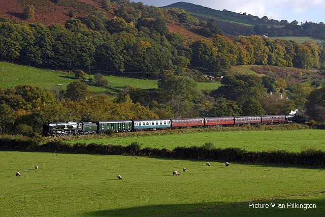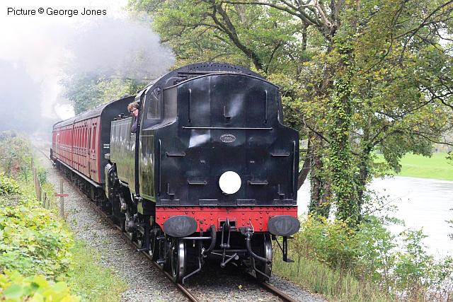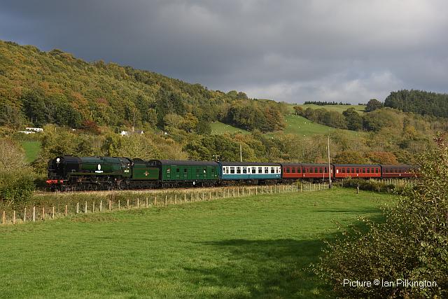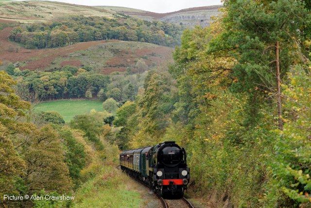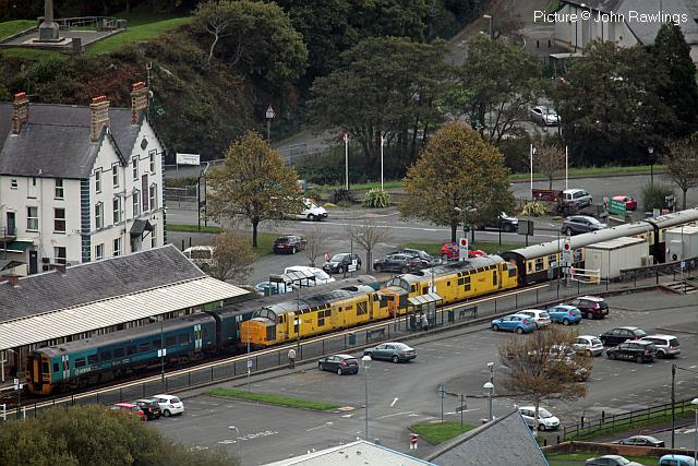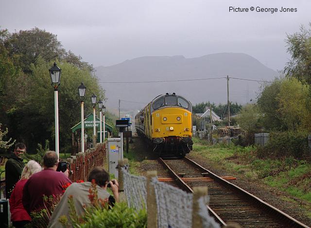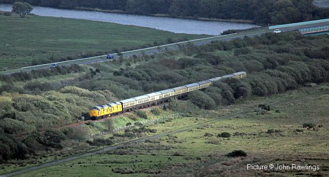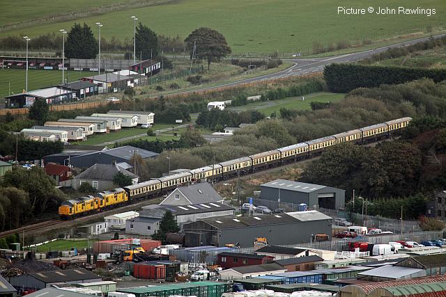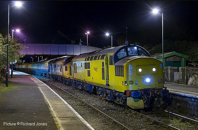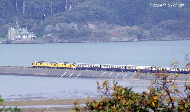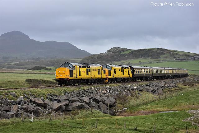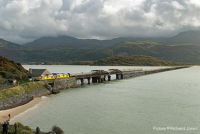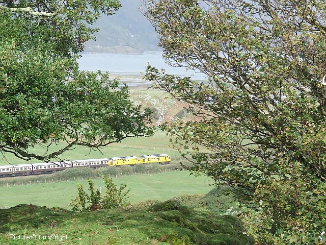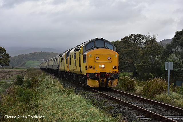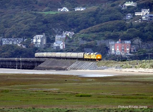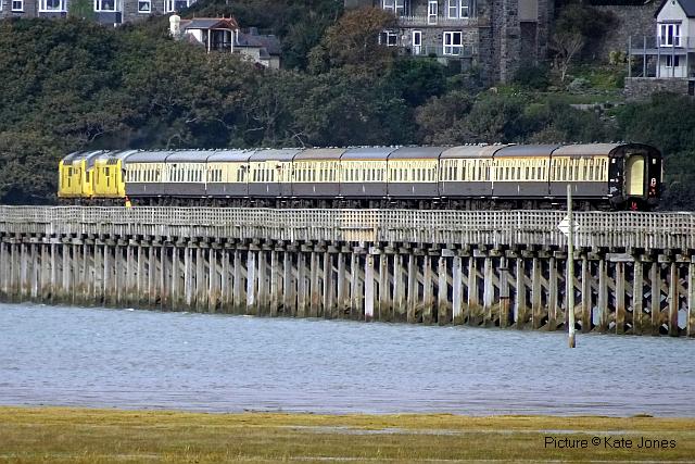 ![]() On Saturday 14 October 56 105, with 56 096 at the rear passing Conwy town walls and Castle with the return Holyhead to Shrewsbury Rail Head Treatment Train. Picture by Garry Stroud. Cambrian Corner Barmouth 150 special![]() 2017 marks the 150th anniversary of the opening of Barmouth Bridge, the longest wooden viaduct in the country. Pathfinder Tours celebrated this by organising a loco-hauled excursion with the traditional name 'The Cambrian Coast Express' from Bristol at Pwllheli and back on 10 October. 67 030 hauled the train to Shrewsbury where 97 304 John Tiley and 97 303 took over for the run over the ERTMS-signalled Cambrian line where only specially equipped traction is allowed. We pick up the train approaching Morfa Mawddach, as seen from Ian Wright's hillside workplace. ![]() On the causeway approaching Barmouth bridge (Ian Wright). ![]() Crossing the bridge (Kate Jones). ![]() The classic shot of the train leaving the bridge with the Cader Idris Massif behind (Richard Jones). ![]() John Rawlings scaled the heights of Moel y Gest to capture the train approaching Porthmadog, with the new by-pass road in view. ![]() Approaching Porthmadog (John Rawlings). ![]() The view from the Welsh Highland Heritage Railway car park. Picture by George Jones who writes: ' Reported in section from Harlech at 13:50 it could be seen stopped way down the line towards Minffordd whilst the Up service train worked by 158 820 ran into the station and was held in the loop. It came forward at 14:00, reported 2 minutes late on Real Time Trains. Overcast weather didn't do much for the pictures but at least the rain held off. The last coach just cleared the crossing and the length of the train caused a sizeable road traffic tail back.' ![]() Portrait of the locomotives (George Jones). Some might have expected the two West Coast Railway Class 37s that have been fitted for ERTMS to be in action, but Pathfinder Tours use DB Cargo as traction provider rather than West Coast, whose two locos have yet to work any revenue-earning trains over the Cambrian as far as we know. ![]() Porthmadog station (John Rawlings). ![]() The last coach, still carrying the roof-boards for the more usual working with this set of carriages, the Torbay Express. The chocolate-and cream coaches are quite authentic for the Cambrian, as the British Railways version of the 'CCE' from Paddington did sport this heritage livery for a while, although generally only a portion of the the 1950s version served the Pwllheli line, another portion running to Aberystwyth. ![]() Passing the site of the former Black Rock Halt (Ken Robinson). ![]() The return train, now with 97 303 leading, approaching Talsarnau station, having accelerated hard to around 50mph (Ken Robinson). ![]() Emerging from the short tunnel between Barmouth station and the bridge (Kate Jones). Above the locos can be seen the steep path which forms the link for pedestrians and cyclists to and from the pathway on the bridge. This emerges on to the busy road at a point where there is no pavement on that side, and very restricted view of approaching traffic, especially when approaching from Barmouth town centre. Since 2013 the Barmouth Viaduct Action Group has been campaigning for a new level, safe path which would cross under the railway using the existing bridge seen in the picture, and run around the foreshore to pass under the concrete viaduct opposite the 'Last Inn.' Anyone having watch the Group's video might wonder why this wasn't done years ago. ![]() Approaching Morfa Mawddach (Kate Jones). ![]() Newtown at 20:11 (Richard Jones). ![]() Back at Barmouth on Saturday 14 October, with pictures by Richard Jones, who writes 'For the anniversary weekend Network Rail had installed LEDs on the inside of the two arched spans. It didn't show the outline of the bridge; It would've been better if they'd have been run across the top of both, to show the arched nature of those structures. Instead, it just looked like fairy lights on the inside of it. It was also spotlit from the headland, but that light was very dim, barely brighter than torchlight. 'It's a pity it wasn't lit from Penrhyn Point. I'm sure the Fairbourne Railway would have obliged. They ran shuttle trains to the point, and had two locos in steam. When the 158 crossed on the 2J23 16:09 Birmingham International to Pwllheli, its driver gave the horn plenty of use, and was answered back by one of the Fairbourne steam locos. It must have been a spectacle for that unit's passengers. 'A laser was projecting scrolling text and graphics on a rock face above the harbour, with details about the bridge, and in both Welsh and English. It also projected outline images of a steam locos, 158s, an EMU with pantograph up, the Network Rail logo, and the Arriva Trains Wales logo. That was particularly well-designed. Later in the evening it displayed an animated journey as it filmed from the front of a train as it ran down the tracks, including entering and exiting a tunnel. I imagine that these are standard sequences that can be downloaded and run on any projecting laser display.' ![]() The Firework Display. Many more of Richard's pictures on his Flickr site. Peter Basterfield's view![]() 9 October's 6D43 Crewe - Valley flasks at LLanfairfechan with 68 032 and 68 017 Hornet. ![]() The Rail Head Treatment Train in action at Glan-y-Mor Elias crossing on 9 October - with temporary sign warning to drivers. ![]() Wednesday 11 October, and flasks in the rain at Bangor with 68001 and 68 017. Llangollen's 'Along SW Lines' GalaFriday 13 October ![]() Bulleid Light Pacific 34053 Sir Keith Park waits to depart Llangollen with the 9.30am service to Corwen (Martin Evans). ![]() GW 2-8-0 2807 departs from Llangollen with the 1.15pm service for Corwen (Martin Evans). ![]() Pannier tank 6430 arriving at Glyndyfrdwy with the auto coach (Martin Evans). ![]() The two visiting locomotives 34053 and 2807 are captured at Carrog (Martin Evans). ![]() 6430 & auto tra