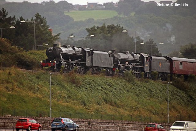 ![]() 48151 and 45690 near Roman Bridge with the 'Conwy Quest', 3 August. Picture by Greg Mape. Conwy QuestThe 'Conwy Quest' was a steam special sponsored by Transport for Wales and Network Rail to mark bother the start of the National Eisteddfod in Llanrwst and the complete of repair work on the Conwy Valley line following the activities of 'Storm Gareth'. ![]() The nine-coach train, provided by West Coast Railways, ran from Chester to Blaenau Ffestiniog and back, necessitating a reversal at Llandudno Junction tender-first operation from Chester to the Junction and from Blaenau to the Junction on return. Above, the special seen at Ffynnongroyw (Jeff Albiston). ![]() At Flint, under attack from a buzzard (?). Picture by Glyn Jones. Motive power, in LMS style, was 'Jubilee' class 45690 Leander and 2-8-0 freight loco 48151, both based at Carnforth. ![]() Approaching what has become the jungle at the eastern end of Llandudno Junction (Jim Ikin). ![]() Liz Saville-Roberts (Plaid Cymru MP for Dwyfor Meirionydd) on the footplate of Leander shortly before departing Llandudno Junction (Geraint Rowlands). ![]() Approaching Glan Conwy, the first station on the Conwy Valley branch, with a good head of steam (Garry Stroud). ![]() Climbing up the 1-in-47 gradient at Dolwyddelan (Jeff Albiston). ![]() Leaving Llanrwst for Blaenau over the repaired section just outside Llanrwst (Brian Jones). ![]() Nhadog Isaf, approaching Ffestiniog tunnel (Lee Davies). ![]() 1Z67's arrival at Blaenau Ffestiniog - almost on time (Ken Robinson). ![]() 48151 running round its train at the rusty headshunt (Ken Robinson). ![]() Then it was 45690's turn (Ken Robinson). ![]() 48151 and one of the Ffestiniog Railway's double engines (Ken Robinson).. ![]() The empty stock being taken out of the platform road as train 5Z67 before being propelled into the loop (Ken Robinson). ![]() Hunslet quarry loco Hugh Napier pauses between giving footplate rides (Lee Davies). ![]() De Winton Chaloner, diesel Moelwyn and Hugh Napier on their way back from operating footplate rides at Blaenau Ffestiniog, seen approaching Minffordd (Lee Davies). ![]() Soon after departure from Blaenau (Michael Baker). ![]() Coasting downhill to Roman Bridge (Jeff Albiston). ![]() Leaving Llandudno Junction in the rain by Pabo Lane (Brian Jones). ![]() Colwyn Bay (Greg Mape). ![]() Colwyn Bay (Jim Ikin). ![]() Passing Holywell Junction on the final leg to Chester (Jeff Albiston). Conwy Valley diesel extras - notes by Geraint Rowlands![]() In addition to Saturday's steam special and the usual six services to Blaenau Ffestiniog, TfW put on a further six services operating as far as North Llanrwst (whence shuttle buses ran to the Eisteddfod's Maes). This increase to six plus eight services from Monday onward. The picture by Greg Mape shows 150 281 at Tal-y-Cafn on 3 August. From a look at the historic timetables on Dave Plimmer's fine site 2D53.co.uk, the last time the Conwy Valley had such a frequent service was in 1961, when the Summer timetable had fourteen services a day (Sundays excluded), with most operating through to Blaenau Ffestiniog. This required the use of four passing places (Tal-y-Cafn & Eglwysbach, Llanrwst & Trefriw, Betws-y-Coed and Dolwyddelen), as opposed to the one that survives today. The best historical Sunday service also appears in 1961, with five return services (but only to Betws-y-Coed). Last weekend's Sunday service, with three trains to Blaenau and eight to North Llanrwst (less one cancelled due to a train fault) is surely a record. ![]() 150 257 was working the normal service on 3 August, seen amid the slate waste at the portal of Ffestiniog tunnel (Greg Mape). Conway Crusader, top-and-tail and other memoriesBarrie Hughes's piece about the 'Conway Crusader' railtour in the 26 July update has generated some very interesting feedback. From Tony Flusk: ![]() Chris Jones-Bridger (30 July issue) is indeed correct in his notes on the 'Conwy Crusader' Tour of Saturday 10 March 1984 in that 40 047 being used to assist with the shunting of the over-length railtour on its arrival. However, as a participant on said tour, it was with some surprise that we found 40 047 standing on the run round line at Blaenau Ffestiniog on our arrival, it having been sent light engine from Llandudno Junction, ahead of the tour, for that purpose. Above is the hand-drawn map of the tour itinerary provided to passengers. We later found that 40 047 was only in the area, due to it working the 07:44 Manchester Victoria – Bangor service from Earlestown to Llandudno Junction that morning, due the failure of the original locomotive. ![]() Picture: 40 029 while running round at Wrexham Croes Newydd. To my mind, the re run of the tour (Conwy Crusader II of Saturday 21 April) was slightly inferior to the first, due to the working in tandem of 50 007 and 40 192 over the steeply graded Conwy Valley line in the down direction, rather than the single 50 018 and load 10 on the first.This gave a highly notable performance, not only on that leg, but also on the non-stop run between Llandudno Junction and Chester. From Stuart Cawthray, Signaller at Llandudno Junction: My first ever 'Top-and-Tail' as a Signalman was a sand train that ran to the newly laid Sand Siding on Conwy Morfa. This would’ve been around 1985/6 and the train ran from Penmaenmawr Yard to Conwy Morfa, I seem to remember ringing my old Block Inspector (Alan Bullimore) to get permission. Around the same time Penmaenmawr signalbox was also turning back an empty-stock for the newly opened Conwy Station, about half a dozen (a day) extra passenger trains (locally known as ‘Ivor Specials’) would arrive from Llandudno Junction. Then they would work empty to Conwy to form the Conwy shuttle to the Junction. As Penmaenmawr only had a trailing crossover at the time it wasn’t possible to run as a passenger train from the down platform at Penmaenmawr. Speaking of Conwy Station, when we had the High Output Track Layin