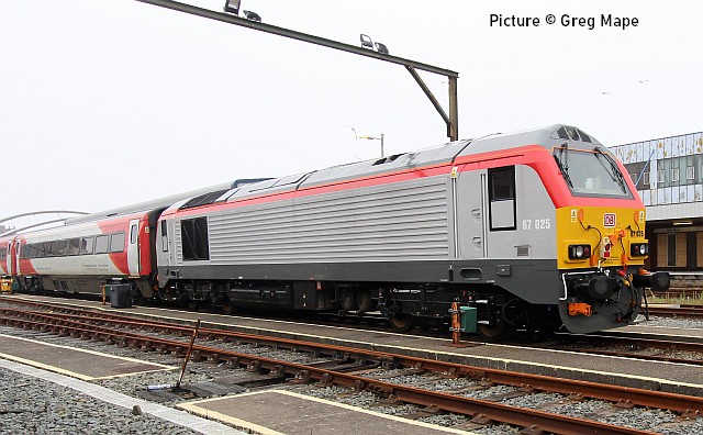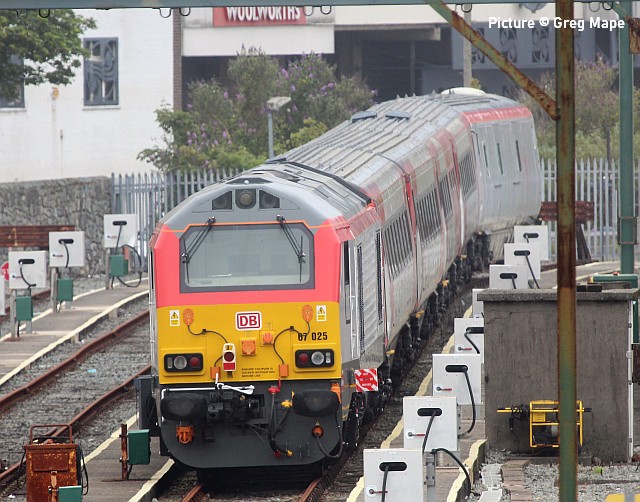 67 025 and Mk4 coaches stabled at Holyhead. Picture
