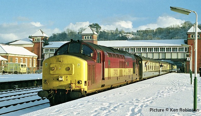 ![]() Not North Wales, but a classic steam shot: 34046 Braunton near New Mills Central, 12 December (Jim Ikin). 20 Years ago - recalled by Ken Robinson![]() As many readers will recall, the end of the year 2000 saw the end of regular class 37 passenger haulage on the North Wales Coast line. The 'final working' was on 30 December 2000, although a few workings took place into January 2001. Following snowfall in North Wales at the end of December, I ventured to Bangor on a sunny 29 December to photograph one of the final trains - this one being the 12:07 Birmingham New Street - Holyhead, hauled by 37421 - one of seven 37/4's allocated to the work (WKCD pool) in 2000. ![]() Here are two images which I took that day, which turned out to be the last photographs I took of the 37/4 workings. 37 421 was transferred to Scotland a couple of weeks afterwards, working mostly the Fort William portion of the Caledonian Sleeper. Withdrawn in 2009, it was acquired by the Pontypool and Blaenavon heritage line, where it re-gained Regional railways colours and worked a few trains before being 'head-hunted' by Colas. In recent times it returned for a few months (along with 37 418) to passenger traffic on the Rhymney line, but today is more likely to be seen on Network Rail's trains. Events at Gobowen (and Bidston)![]() Route learning runs using a GBRf loco have been talking place between Bescot and Bidston in relation to forthcoming engineering work on the Merseyrail network. Above, waiting in Gobowen on 23 December; in the background is a 175 heading south. The class 144 Pacers earmarked for the Cambrian Heritage Railways are still in the sidings (Jim Scott). ![]() At Bidston, preparing to head back to Wrexham. The loco is 66 730 Whitemoor. ![]() The filthy state of the loco suggests it has been in use during the autumn for the Rail Head Treatment trains, whose high pressure jets throw up mud from the track (Jim Scott.) ![]() Chris Scott was at Gobowen station to see the return working. First to pass was 175 001 on the 13:00 hrs to Shrewsbury. ![]() In what seemed to be a short space of time because of the speed limit having been being raised to 90mph, allowing the 175 to clear the section quicker, 66 730 appeared heading towards Shrewsbury (Chris Scott). Signs of the times: a new concrete base has been installed for a new ticket machine and as can be seen in the picture, a new sign marking the stopping point for the Class 67 and Driving Van Trailer operation which will work some Holyhead - Cardiff services.. ![]() The barriers stayed down and almost immediately 66 781 appeared on the Penyffordd cement (Chris Scott). A busy half hour. From Dave Sallery's archive![]() Standard 4-6-0 75010 near Chester station in December 1965. This was a North Wales loco for most of its life, being delivered new to Llandudno Junction in 1953, and later working from Bangor. Chester and Croes Newydd depots. It went on to be one of the last of its type in service, being withdrawn from Carnforth shed at the end of steam in August 1968. ![]() 47 007 passing Shotton Low Level, 20 March 1990. ![]() 33 205 leaving Prestatyn on an up service to Crewe, 28 May 1986. This one of the batch of Class 33s built with narrower bodies to fit the structure gauge of tunnels on the London - Hastings line. The Yo-Ho-Ho Railtour, 29 December 2006 - pictures by Tim Rogers![]() Above, 37 194 and 37 229 Jonty Jarvis arrive at Hooton on 28 December 2006 with the Pathfinder Tours 'Yo-Ho-Ho' railtour, the outward leg being train 1Z20, 05:37 Swindon to Preston via Bristol Parkway, Cheltenham Spa, Bescot Up Yard with 66 210, then the two DRS 37s to Hooton via Wolverhampton, Wrexham General, Chester to Hooton Long Siding where the train reversed. ![]() Freightliner loco 66 551 arrived to take the train onward to the Kirkby branch. ![]() Departure. ![]() The two 37s remained coupled at the other end, to pilot the train on return from Kirby and on to Preston. Returning from Preston, the tourists were treated to haulage by 60 030, 86 614 and 66 120. ![]() While at Hooton, Tim captured some of the Merseyrail electric units, which as 2021 dawns are due for replacement. Here's 507 005, built by British Rail Engineering York works in 1978. ![]() This is 508 134. The 508s are more or less identical to the 507s, but were built as 4-car sets for use on Southern Region services. Being very different from the existing Southern trains, they were not popular with staff and were eventually transferred to Merseyrail, with one coach removed. The extracted trailer cars were then converted to work in some of the Class 455 sets which replaced the 508s on the the Southern. The 507 and 508 units are among the oldest trains still in National Rail traffic, although after a couple of refurbishments they still seem modern. The replacement Stadler-built units have improvements such as air conditioning, and level boarding at stations; it will be interesting to see how they perform, especially in the harsh conditions of the sharp curves and damp atmosphere of the Liverpool Loop tunnel. Looking back: Welsh Highland in the 90s - with David Pool![]() The new Welsh Highland Railway is open for business! On 26 October 1997, a few weeks after the official opening, Beyer Peacock Garratt No.138 is leaving Caernarfon, bound for Dinas. Of course this was originally the route of the standard gauge line between Caernarfon and Afon Wen, which had been closed in 1964. The facilities at the WHR station were somewhat basic, and a far cry from the impressive WHR station we see today. ![]() Later at Dinas, No.138 is running round its train. On this occasion the train has taken the left hand platform when arriving, which is contrary to the normal practice on the Ffestiniog Railway, but the platforms on the WHR are generally bidirectional. On the left of the image is the Lon Eifion, the cycling and walking trail which follows the trackbed of the line from Caernarfon to Bryncir. ![]() On display at Dinas, 
