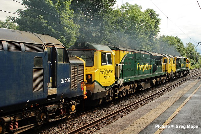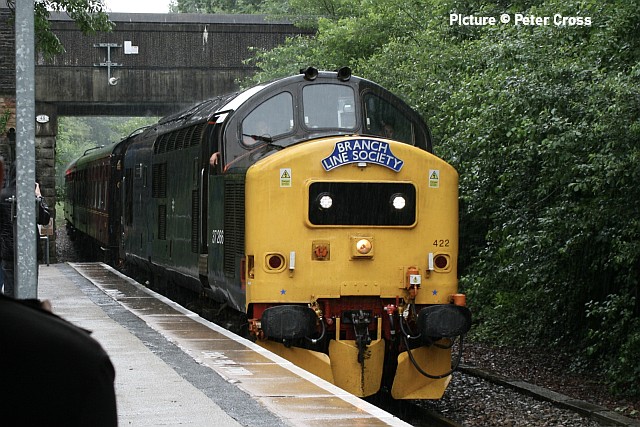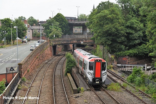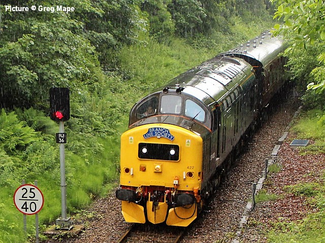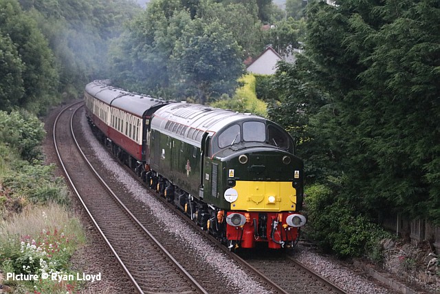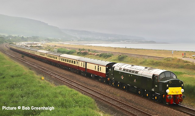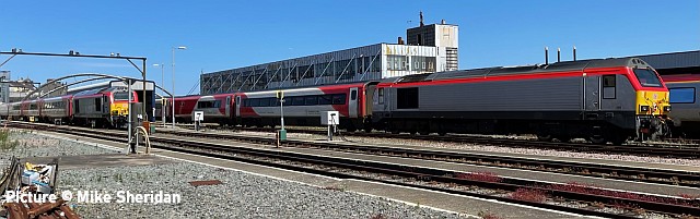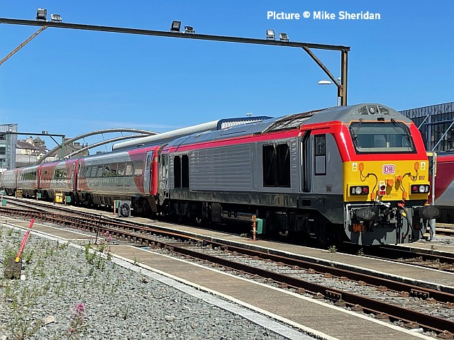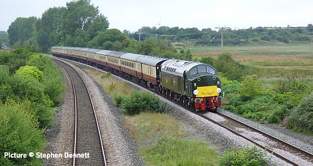 ![]() This week's highlight is the appearance on 1 July of 'The Bristol Forty' excursion from Bangor to Bristol, hauled by 40 013 / D213. The train ran empty from Crewe in the morning, photographed near Conwy by Ryan Lloyd. Llangollen Railway re-opening on 9 July: see below The Bristol Forty![]() Approaching Llandudno Junction on the way to Bristol (Ryan Lloyd). Sadly, on this day weather conditions were not ideal for photography. Back in the 70s and early 80s the Class 40s (English Electric Type 4 in pre-computer days) worked many of the Coast trains and gained an enthusiast following. These early high-power diesels were very heavy, and to spread the load on the track the 40, like its Derby-built Class 45/46 class, has eight axles, six of which are powered. ![]() Pensarn Beach, Abergele (Gary Thomas). D213 at English Electric Vulcan Foundry Works, Newton-le-Willows in 1959, and withdrawn from normal British Railways service in January 1985, but was retained as the London Midland Region's 'Exhibition Loco' to visit open days and publicity events, including the one at Shrewsbury which featured in a recent Notice Board. The London Midland Region named a batch of the locos after ocean liners; at the period, 'boat trains' ran to a private station at Liverpool Riverside. RMS Andania was a Cunard liner dating from 1921 and sunk in 1940 by a German U-boat while acting as an armed merchant cruiser. ![]() Bagillt (Stephen Dennett). In 1988 the loco was purchased by a pricare owner, and returned to traffic with the help of a group of enthusiasts. ![]() Beeches Farm (Bob Greenhalgh). Currently the loco is on a three-year hire to Locomotive Services Limited, who ran this excursion under the Saphos brand. The train was, subject to social distancing, fully booked. Seen at Chester - report by Geoff Morris![]() 197 002 now appears to be seeing fairly regular test runs along the North Wales Coast. On 2 July I went to photograph it on the 08:49 Crewe C.S. to Llandudno Junction crossing the Shropshire Union Canal at Chester Locks. The tree that has been growing between the Up and Down lines at the end of the bridge shows clear effects of being “manicured” by passing services ... ![]() ... as exemplified by the photo that I took of 158 830 a couple of minutes earlier on the 07:06 Birmingham International - Chester. I returned to the area for the return of the class 197 and had noted that a Very Short Term path had appeared on RTT for something to run from Chester sidings to Birkenhead North depot. I assumed this would be a class 230 and the timings on RTT suggested that it might pass the class 197 around here. Well I was correct about the class 230 trip which turned out to be a pair (230 008/006) and they did pass the class 197. ![]() Unfortunately this happened just out of my sight behind the trees on the right hand side of the line before the viaduct ! The class 197 had run a little early and was already waiting at the signal there, presumably because the 230s had crossed over to the main line in Northgate cutting, so blocking its path. My camera shows that less than 40 seconds elapsed between the photo of the 230s and the appearance of the 197 but the class 230s were already out of sight in Curzon Park cutting by then. So near but yet so far. [In other news: A 'small fire' involving a Class 230 was attend by the Fire Service at Wrexham on 1 July.] 67s at Holyhead - pictures by Mike Sheridan![]() A visit to Holyhead on 5 July saw two of the three TfW class 67 sets stabled in the sidings: 67 017 (above) and 67 008. ![]() Class 37/4 corner![]() The Branch Line Society has been running a series of charity railtours featuring Class 37/4 locos in conjunction with DRS . On Sunday 4 July, 37 423 and former Coast Line favourite 37 422 Victorious were in charge visited some unusual locations, including the short branch from Romiley to Rose Hill. Picture above by Greg Mape. ![]() Arriving at Rose Hill station in heavy rain (Peter Cross). This line originally continued to Macclesfield; the route is now popular with walkers and cyclists as The Middlewood Way. ![]() Glossop (photographed by Greg Mape from the adjacent street) has always been a terminus; the branch from the Woodhead main line was paid for by the landowner, the Duke of Norfolk. ![]() Later, two Class 70s 70 011 and 70 019 were added on the front of the train, seen at Handforth on the Stockport - Crewe route. 37 422's previous number before rebuilding with electric train heating provision in 1986 , 37 266, has been applied to the cab side for some reason. From Dave Sallery's Archive![]() Warrington on 7 April 1989: 20 021 and 20 121 are on a Point of Ayr to Fiddlers Ferry Merry-go-Round coal train; they have just reversed in Latchford sidings. Arpley stabling point is on the right. ![]() 25 035 at Prestatyn on Sunday morning 3 August 1986, engaged in Permanent-way duties. We have had two new footbridges since that one! Miscellany![]() 197 002 near Flint, 1 July (Stephen Dennett). ![]() 'Celebrity' loco 66 779 Evening Star - the last-built Class 66 = passes Penyffordd with a cement train on2 July (Stephen Dennett). ![]() Still on the cement duty, 66 779 passing Rhosymedre on 5 July's Avonmouth to Penyffordd empties (Martin Evans). ![]() D1501 makes a smoky arrival at Heywood, East Lancashire Railway, 2 July (Greg Mape). ![]() A busy moment at Peak Forest, 2 July (Greg Mape). ![]() Work is well under way at the Barmouth viaduct ready for closure on 12t# September until 12 December (Kate Jones). Looking back: Steam and Diesels in the 80s part 2 - by David Pool![]() The Kemira (previously UKF) Fertiliser Plant at Ince despatched trains to a variety of locations in the South and South West of England. These freights used the line from Helsby Junction to Mouldsworth, and on Monday 3 May 1982 the afternoon train with 47 306 was passing the site of the long closed Helsby and Alvanley ststion. I would be interested if anyone could tell me the likely destinati
