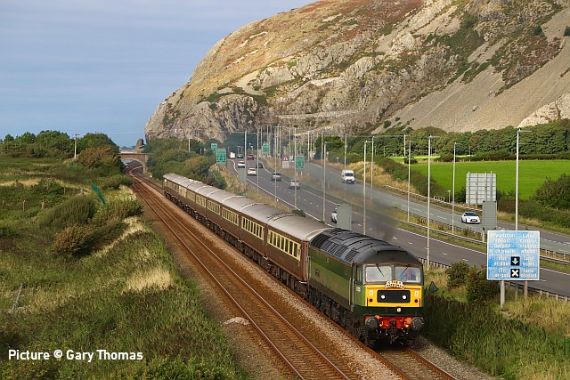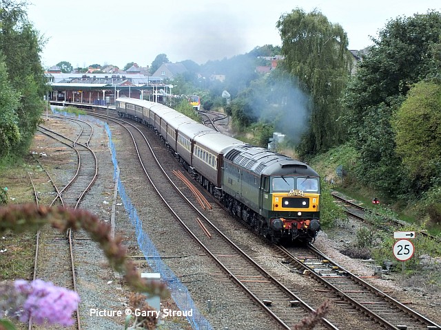 ![]() On 30 August, D1935 (a.k.a. 47 805) departing Llandudno Junction with the 08-30 Bangor to Carlisle Statesman tour. Note the vegetation clearance now being carried out in the formerly vegetation-covered sidings. Statesman Settle and Carlisle Circular![]() Excursions seem to be coming 'thick and fast' now that restrictions have been relaxed. The 'S &C Circular' on 30 August run under the Statesman brand of Locomotive Services Ltd started from Bangor at 08:35 and travelled to Appleby for a break, then continued on to Carlisle and then the 'Shap' route through Lancaster, Preston and Warrington, Chester and Bangor. Interestingly, the commonly-seen 'Top-andTail' formation was eschewed in favour of haulage by a single locomotive, 47 805, Roger Hosking MA, seen above heading past Abergele in the morning (Greg Mape). ![]() Picture by Gary Thomas. ![]() On its return at Dwygyfylchi a couple of minutes early. Picture by Gary Thomas, who notes: 'Freezing cold this morning, a lot better this evening!' ![]() Passing the newly-cleared sidings ... ![]() ... and into Llandudno Junction (Greg Mape). Looking back: Diesels 1993-4 - with David Pool![]() The Merry-go-round coal trains from Gladstone Dock in the early 1990s had generally been worked by Class 20s, often with four locomotives for the climb up to Bootle Junction. The advent of the Class 60s ended these workings, and a single locomotive was possible. On 2 October 1993 60 032 William Booth was bringing a train of empty wagons back to the Docks, with Bootle Town Hall in the background. ![]() The Pathfinder railtour 1Z44 from Bristol on 30 October 1993 has featured in several NWCR webpages, usually showing 50 033 and 50 007. The third locomotive used was 56 096, and after the train reversed at Eccles it is heading down the gradient towards Weaste. Later it would visit Runcorn Folly Lane and Seaforth Docks. ![]() The line between Dolwyddelan and Roman Bridge is particularly attractive, but the curvature makes it difficult to photograph more than a few coaches. The three car Metro-Cammell unit 101 683 has left Blaenau at 12:05 for Llandudno on 16 July 1994. ![]() Another Class 60 in Railfreight Coal livery, 60 060 James Watt, was approaching Runcorn East in the early afternoon of 30 July 1994 with logs, probably to Chirk. I think this train would have started from Warrington, and I assume the logs would have been originally loaded at Carlisle. Any clarification would be appreciated. ![]() Railtours in 1994 provided an interesting selection of locomotives. The “Slim Jim” Class 33/2s were not at that time generally seen away from the South East, having been built for use on the Hastings line with its restricted gauge, so when 33 208 and the more familiar 33 116 were paired on “The Cheshire Kitten” on 21 August 1994 it was not to be missed! Hertfordshire Rail Tours had arranged for this “add on” to their “Cheshire Cat” railtour from Euston to Crewe Rail Fair. The pair of 33s had worked from Crewe to Chester, then across to Northwich and back down to Crewe, here passing through Middlewich. Both locomotives are now preserved, 33 116 (D6535) at the Great Central Railway and 33 208 (D6593) at the Battlefield Line. ![]() The celebrity green Class 101 was seen regularly in North Wales. On 27 August 1994 101 685 was arriving at Blaenau Ffestiniog with the 10:40 from Llandudno. ![]() The Trawsfynydd Trekker railtour 1Z46 from York followed the unit, top and tailed with 31 490 and 31 327. I waited for it at Maentwrog Road as it slowly made its way to the Trawsfynydd railhead. Apparently it was advertised as the Trawsfynydd Trekker II, but the original railtour Trekker I had been cancelled a couple of months earlier. ![]() One of my favourite photographic locations on the line was Teiliau, between Llan Ffestiniog and Manod. The “Red Stripe Railfreight” liveried 31 327 was now leading the returning train. RCTS meetings restartThe Railway Correspondence and Travel Society, Merseyside, Cheshire and North Wales Branch are restarting their meetings programme, starting from 8 September in Liverpool. However, they are also retaining a series of 'Zoom' meetings in parallel. For full details see our Calendar page. Organiser John Cashen writes: 'Because of the uncertainty of any possible future Covid restrictions, plus the facts that Zoom meetings have proven to be very successful and, as we get older, a larger number of people are more reluctant to want to venture out during evenings, especially when the weather is not very good, the Committee has decided to do an equal number of Chester, Liverpool and Zoom meetings for the 2021/22 indoor meeting season.' News from the line![]() Trains are now calling again at some of the stations with short platforms, which have been closed since the start of the Pandemic because if only one train door is to be opened, as is the usual procedure, the conductor would come too close to the alighting and boarding passengers. Stations re-opening in our area are Valley, Llanfair PG, Llanbedr, Abererch, Prees and Yorton. The picture above shows the 15:38 Holyhead - Birmingham calling at Valley on 27 August formed of 153 361 and 158 838 (Stuart Broome) Conwy apparently remains open for two-coach trains only until 12 September (how does a passenger know that in advance?), while for some reason Tygwyn, Llanaber and Llandanwg remain closed. The list given in Modern Railways magazine lists Llanaber instead of Llanbedr. Real Time Trains describes the closed stations as 'Service stops for staffing reasons .' Another snippet from the railway press is that when the dining service re-starts on the Holyhead - Cardiff loco-hauled trains there will be provision for breakfast, lunch and dinner for 41 'covers' - all of the first class coach - and that seven chefs and 14 'Premium Hosts' have been recruited. We look forward to taking a ride! Corris and Talyllyn GalasOn 4 and 5 September Talyllyn loco no. 4, which originally worked on the