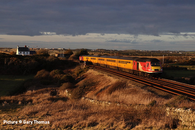 ![]() 68 001 and 68 002 head for Llandudno Junction, 27 January. Picture by Gary Jones. Flask train 2022![]() DRS run a (very) occasional trip to and from Valley to maintain familiarity with the line even though the power station has had all its fuel rods; the final loaded train ran in September 2019. The previous train ran on 2 April 2021. On 27 January 2022 68 001 Evolution and and 68 002 Intrepid did the honours, pictured travelling west at Pensarn (Gary Thomas). ![]() Returning past Rhosneigr (Gary Thomas). ![]() Close-up of 68 001 at Bagillt (Tim Rogers). DRS certainly keep their locos in clean condition. ![]() 11 70 9229 029-7 is one of batch of ten FNA flask carriers built in 2014. Ready for the snow![]() Geoff Morris writes: 'On Tuesday 25 January my wife and I were out for a walk and while we were crossing Hoole Lane bridge a very unusual sight coincidentally (and unexpectedly) appeared. A pair of Independent snowploughs were leaving on the Crewe line with 66 434 & 66427 sandwiched between them. Notice the curved bats on the top of the ploughs to clear any icicles inside tunnels. ![]() The ploughs appeared to be in ex-works condition and I assume that they were on a 'shakedown' run following an overhaul. A perusal of Real Time Trains showed that this was a return trip between the DRS depot at Gresty Bridge and Chester, running over 2 hours late. ![]() A different version on 27 January was a test run of a pair of the smaller type of indepdent snowploughs from DRS Crewe Depot to Chester and back featuring one-time Coast favourite 37 425 Concrete Bob ... ![]() ... and 37 716, photographed in difficult lighting conditions outside Chester by Bob Greenhalgh (Note the HST-worked measurement train on the other line). These ploughs are, we believe, built on bogies from withdrawn Class 40 or 45 locos. These units are only suitable for smaller snowdrifts, and have no icicle breakers, but the train crew have a better view than the large version. Use of these on the Stockport-Buxton line in 2018 resulted in a broken front window on the loco. HST measurement train![]() Yet more interest on 27 January was the HST-based measurement train working along the Coast. Gary Thomas captured it in the gloaming at Rhosneigr heading back to England. ![]() The working was 1Q30 10:55 Derby R.T.C.(Network Rail) to Crewe C.S. (L&NWR Site) via Stoke-on-Trent, Chester, Crewe and Liverpool Lime Street. Chester and Holyhead. The pictures were taken at Flint station at 17:22 (Tim Rogers). ![]() Tim Rogers records for us the consist of the train. All the coaches are the mark 3 type previously used in passenger HSTs, except 975814 which as 11000 was part of the prototype HST. Class 43, 43 290; 975984 Network Rail High Speed Track Recording Train coach, Formerly Laboratory 15 Argus and later Test Car 4.(Ex 40000); 975814 Network Rail High Speed Track Recording Train coach. Formerly Test Car 10 (Ex 11000); 977993 Network Rail High Speed Track Recording Train coach (Ex 44053); 977994 Network Rail High Speed Track Recording Train coach (Ex 44087); 977984 Network Rail High Speed Track Recording Train coach (Ex 40501); Class 43, 43 299. Making connections![]() 67 017 passes Rhosneigr propelling the 11:22 Cardiff - Holyhead on 27 January (Gary Thomas). Recent magazine articles have discussed the changes needed to make the 67s able to be controlled by the driving trailer. The Mk4 carriages, like their Mk3 predecessors, were fitted with 'time-division multiplex' which can send a number of control signals along a limited number of wires running through the train; the early versions of this used the trains' existing lighting circuit, but this was abandoned due to interference. The 67s for TfW are fitted with the American AAR wiring system, noticeable by an extra socket on the front of the cab which connects a cable with many wires. All the Mk4 coaches and Driving trailers have had to be converted to this system, and the same work will be needed on the additional vehicles acquired from Grand Central. In addition it has been decided to equip the coaches with selective door operation so that trains can safely call at stations with short platforms. Editorial slip ![]() Last week's heading picture caption (above) should have read '67 017 propelling 1V96 11:33 Holyhead - Cardiff Central.' From Dave Sallery's archive![]() 37 080 with a heavy load of Penmaenmawr's finest ballast passes Holywell Junction, 4 October 1994. 37 080 was cut up at Cardiff Canton in May 1997. ![]() 37 077, in Mainline livery, with empties for Penmaenmawr on 19 March 1998 again passing Holywell Jct. This loco met its end at CF Booth in Rotherham. A visit to Acton Bridge - with Greg Mape![]() A trip to Acton Bridge on the West Coast Main Line on 26 January to see 87 002 Royal Sovereign, on a charter from to Euston - Glasgow. It got stuck for 45 minutes at the signal outside Acton Bridge station with a technical problem, luckily it was repaired and carried on. ![]() I managed to get an LNWR unit, 350 251 and a Cement train Clitheroe-Avonmouth with 66 773 at the front, all all next to 87002 at the signal. ![]() 88 008 Ariadne passed with a Tesco train Daventry - Mossend. ![]() 57 307 Lady Penelope, the only Class 57 still retaining Virgin's 'Thunderbird' theme, Crewe to Crewe via Liverpool Lime Street. Something different: the BP and GV line, Part 1 - By David Pool![]() The North Wales Coast Railway Notebook on 27 August 2018 contained an item by Barrie Hughes on the Burry Port and Gwendraeth Valley line in South Wales, which he visited in 1983. I first visited the line in 1975, and my starting point was the Yard at Burry Port, where loaded trains arrived from Cwmmawr and departed to Coed Bach Washery. On 9 September 1975 03 145 was picking up a brake van prior to going onto the rear of a train to Coed Bach. ![]() Two more 03s, 03 120 and 03 144, were stabled in the Yard, and illustrated the cut down cabs which were necessary due to low bridges on the line, part 