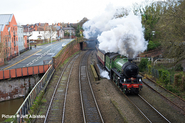 ![]() New and old at Chester, 12 January (Geoff Morris). Manchester - Cardiff newsHaving achieved three days of operation, the loco-worked diagram began as advertised and operated as planned, with three different locos in the three days, things went wrong on Thursday and Friday, when a single two-car substituted. Saturday saw a pair of 153s. However, loco working resumed on Monday the 16th with 67 013 (with set HD05) starting five minutes late from Cardiff. The return run started on time and arrived at Cardiff 20 minutes late. We note that Real Time Trains have altered the indication of train length from five (which presumably included the driving trailer?) to four cars. The train returns to Manchester as the 18:55 from Cardiff, then empty stock to Crewe. Stop press: Tuesday's offering is 150 270. TfW ticket offerTransport for Wales are offering, for a limited period, reduced fares for Advance tickets: details are on their website. An unusual condition of the offer is that your journey has be longer than 50 miles, harking back to British Rail's 'Saver' tickets of yore. How we are expected to know such a distance is not given. Manchester Airport to Chester is 51 miles, for example, and Chester to Bangor 60 miles, Manchester Piccadilly to Shrewsbury 63 Miles. Triple 197 - by Geoff Morris![]() Testing of the 197s continues with two or three sets being run in multiple. On 11 January I noted a 197/1+197/0 combination, while on 14 January I noted a rake of three 2-car units was working between Chester & Llandudno Junction, pictyred above: 197 012/02/019. I believe that a 197/0+197/1 combination may be used on future services between South Wales and Manchester but I wonder how often we’ll see a triple set in public use. Editor note: We have added a 197 page to our 'Trains' section. Is anyone keeping records of which units are working so that we can mark them on our list? Any help welcome. Freight scenes![]() 66 734 Platinum Jubilee reverses in Llandudno Junction yard, after bringing in the 6Z58 limestone empties from Doncaster, 9 January (Garry Stroud). ![]() 66 780 The Cemex Express during loading at Penmaenmawr, with the return 6F22 stone to Tuebrook sidings, 9 January. ![]() The Doncaster Down Decoy to Peak Forest empty stone wagons with 66 752 The Hoosier State passes Reddish South on Sunday 15 January. Mayflower in steam![]() Star of the steam show this week is LNER B1 class 61306 Mayflower, fresh from overhaul. Martin Evans was at Ruabon to see it on a training run from Crewe to Shrewsbury. 37 688 was on the rear as insurance. (Note: these pictures might not be in chronlogical order.) ![]() Balderton Crossing (Bob Greenhalgh). ![]() Chester locks (Geoff Morris). Geoff notes: 'The B1s weren’t entirely strangers to North Wales as they appeared regularly on summer Saturdays with holiday trains from the Sheffield area to Llandudno. I saw my only Eastern Region steam loco in everyday use - 61315 - at Llandudno Junction on such a service when we holidayed in Llandudno in 1964.'.. ![]() ... and here is such a train: On 4 August 1962, 61166 (B1 class) with the 11:15 Llandudno - Sheffield Midland (Load 10 coaches) between Shotton & Connah's Quay. Picture by Bevan Price from our 2 August 2021 issue. ![]() Chester Locks, 12 January (Jeff Albiston) ![]() Seen at Rossett before climbing Gresford bank (Jeff Albiston). Chester 175Local Guide John Whittingham is looking to organise an event on Chester station to commemorate the 175th anniversary of the Official Opening of Chester Station which occurs on Tuesday 1 August. Some ideas might be: Cutting of the Ribbon ceremony; Stalls in the station Concourse of the various Companies/Societies connected with the station; Possible steam train from Crewe to Chester with normal rail tickets valid, as as per Settle and Carlisle steam train event which attracted thousands of people; Chester City Brass Band to play at the Opening Ceremony, Transport for Wales maybe the Sponsor ? Any other ideas are welcome apparently. A freight loco stabled in a bay platform for footplate visits, perhaps? Write to WHITTINGHAM50@hotmail.com. Looking back: end of a era - By Barrie Hughes![]() Here is a set of photos I took on 12 June 1999 in the final year of Class 37 haulage on the North Wales coast. I was lucky enough to catch photogenic Transrail liveried 37675 working on the North Wales coast on a bright summer Saturday. Above, awaiting departure from Birmingham New Street. After transfer to Toton at the end of 1998 this loco occasionally appeared on the North Wales Coast and on 9 June and 12 June 1999 hauled the diagram that started 1D99 with the 23:30 Birmingham New Street-Holyhead, coming on at Chester. The train then returned to Birmingham as 1G91 the 04:15 departure and back to Bangor as 1D62 the 08:07 departure from Birmingham. Next duty was 1G16 the 11:07 Bangor to Birmingham where I intercepted it as the 14:23 Birmingham - Holyhead and photographed it. ![]() It was a great ride to Holyhead with some excellent 'thrash' from the front end. A prompt turn round at Holyhead (The pictures capture the run-round operation) saw me take a ride back on 1G79 the 18:22 Holyhead-Stafford. ![]() Pausing among the weeds ... ![]() ... and ready for departure. The loco also worked the Coast the following day but then was transferred to other duties including charter services from July. After Rail Head Treatment duties the loco ended up stored at Margam where it was withdrawn on 8 August 2010 and cut up at EMR Kingsbury two months later. I am grateful to the Class 37.co.uk website for the details. From Dave Sallery's archive![]() 37 427 Bont Y Bermo on Shrewsbury stabling point, 2 August 1986. In 1985-6, 31 Class 37 locos received a makeover at Crewe works to extend their life and provide power for regional passenger service. The majority went initially to the Scottish Highlands, while 37 426 - 37 431 were stationed at Cardiff. All received BR 'large logo' livery. ![]() 37 428 David Llo
