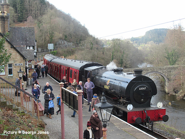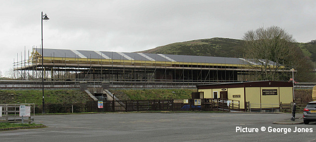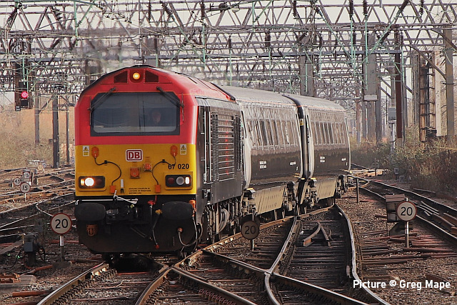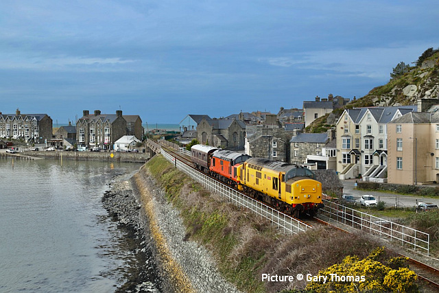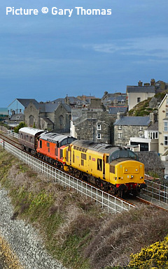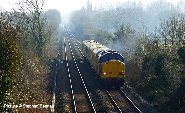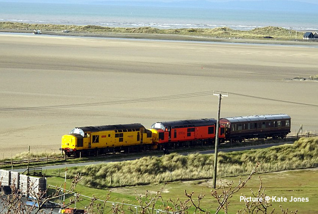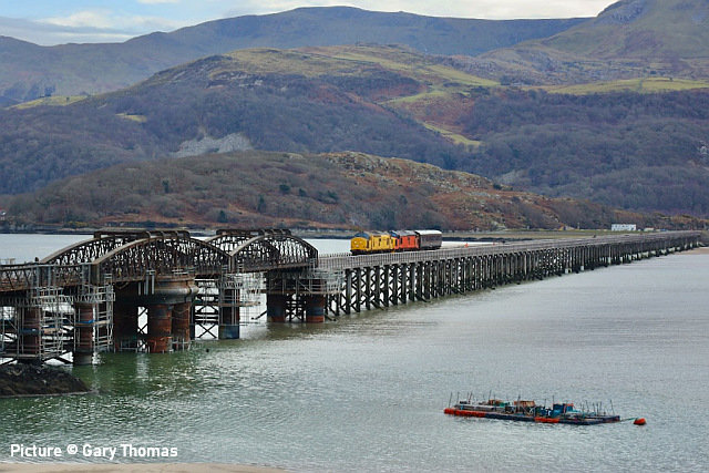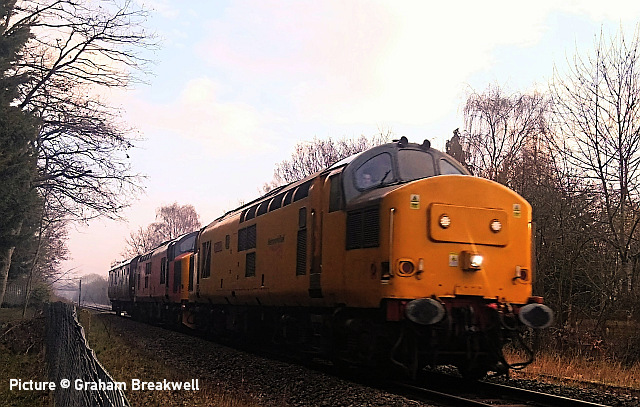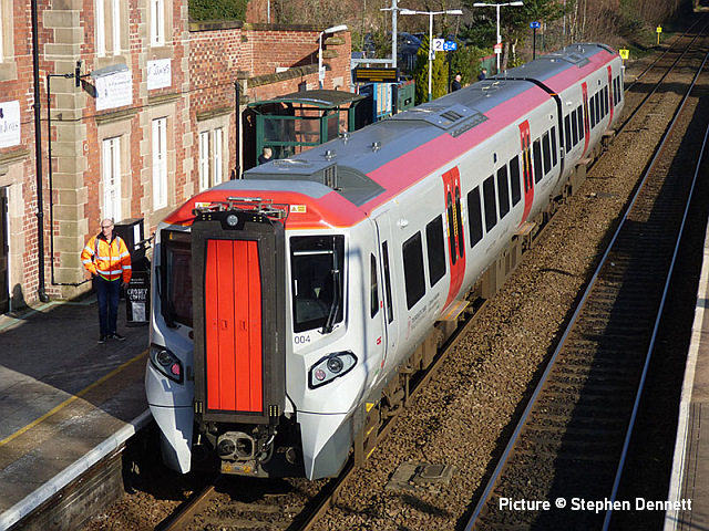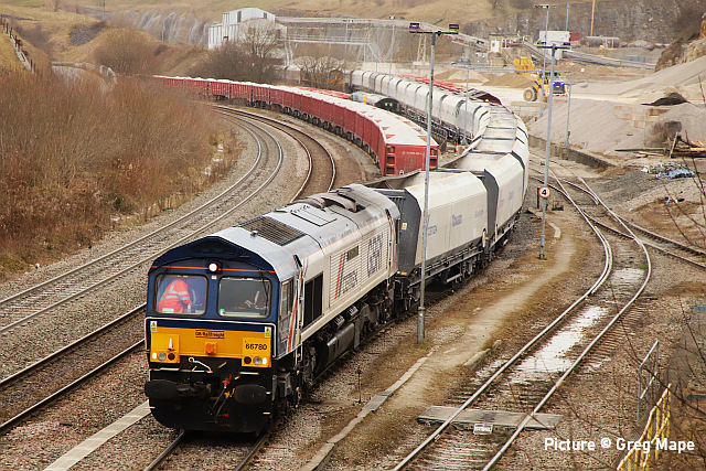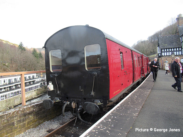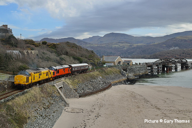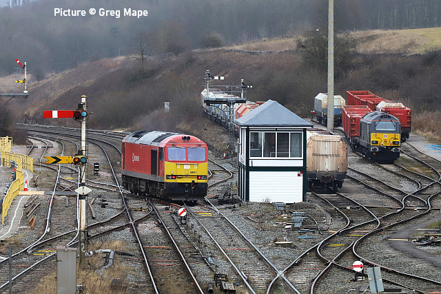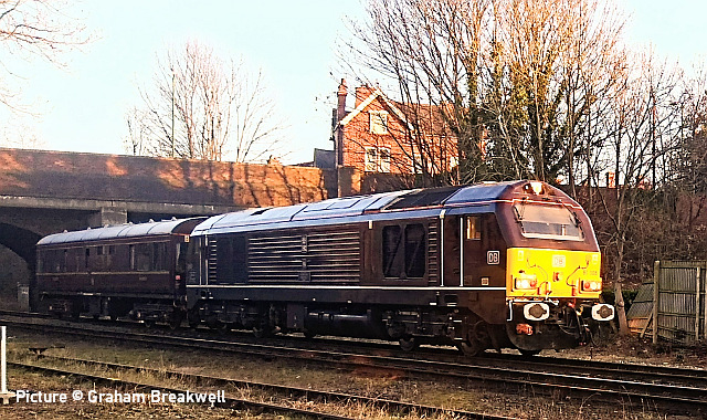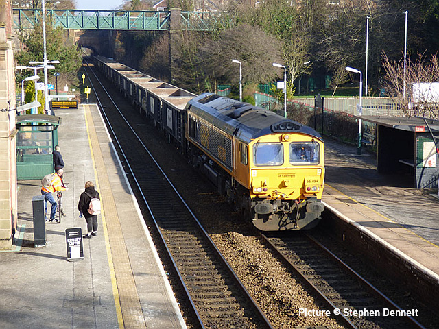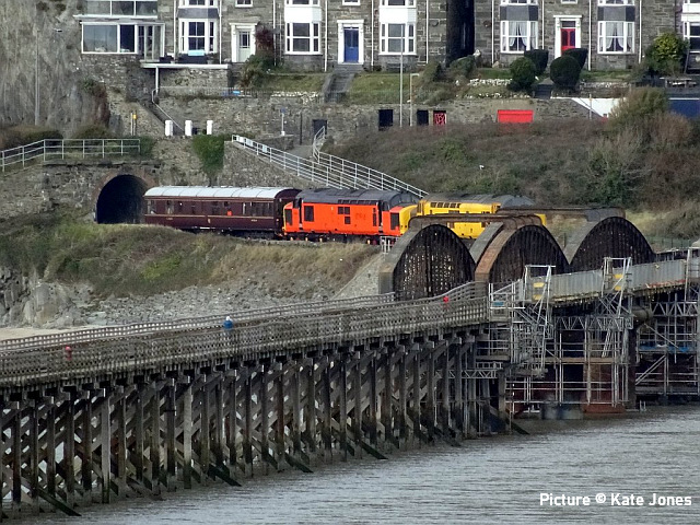 ![]() 67 020 arrives at Manchester Piccadilly on 14 February with the 10:52 from Cardiff. Picture by Greg Mape. News pictures![]() 66 784 Keighley & Worth Valley Railway 50th Anniversary 1968-2018 comes through Frodsham with 6Z58 Doncaster Down Decoy to Llandudno Junction empty wagons on 13 February. This loco was formerly 66 081 in the DB cargo fleet. ![]() Frodsham station is a good place to see the new 197s in action. On 13 February, 197 004 calls at 16:42 with 1F97 Chester to Liverpool South Parkway ... ![]() ... and 197 012 arrives at 16:43 with 1D37, the Manchester Airport to Llandudno service (Stephen Dennett). ![]() It's always good to see a Class 37 on the Borderlands: Colas Class 37/6, 37 607 nears Buckley station on 14 February with 3Q01 Shrewsbury to Taff Vale Sidings ultrasonic test test train. This loco has just celebrated its 50th anniversary, having entered service as D6803 in January 1963.Sine then it has been 37 103, 37 511 and finally 37 607 - the number showing that it was one of the 37s allocated for Eurostar duties (Stephen Dennett). Loco-worked doingsSaturday 18 February saw the introduction of Saturday locomotive traction on the Manchester -South Wales, and loco working beyond Cardiff to Swansea. The plan was for two diagrams: 04:35 Cardiff - Manchester 08:30 Manchester - Cardiff 12:52 Cardiff - Manchester 16:30 Manchester - Swansea 04:54 Crewe - Cardiff 08:49 Cardiff - Manchester 12: 30 Manchester - Cardiff 16: 50 Cardiff - Manchester However, things did not go to plan. No train was available for the 12:52 from Cardiff - trouble with brakes apparently - and the train was started from Crewe, half an hour late, only to be terminated at Wilmslow, and started from there to Swansea. We understand that this is the policy if a northbound train would be late departing back from Manchester. (Thanks to the wnxx Forum members for help with this item). Logs delay at Chester - report by Roger Smith![]() I passed through Chester Station on the night of Thursday 16 February. When I arrived by train just after 20:00 a Colas Class 56 log train was idling on the 'Down and Up Main' line opposite Platform 3. When I returned to catch my train at 22:15 the log train was still there. The Realtime Trains web site indicated that the Carlisle-Chirk logs had not been activated that day, so it was not that which was running late. This left the Baglan Bay-Chirk logs which was running considerably early. It was at least two-hours' ahead of its schedule when I first saw it. I cannot be more specific than this because the Realtime Trains record shows "No report" for the train's entire journey from Baglan Bay to Chester, including when it had arrived at Chester. It appeared at Chester as if by magic! - the answer is that the train left Baglan Bay on the previous day before as the 16:02 to Chirk. That departed 68 minutes late at 17:10, and was delayed at Sutton Bridge Junction for over and hour and again at Saltney Junction, finally reaching Chester at 01:16 on 26 February. It was decided to stable the train at Chester, probably to relieve the driver; it was finally re-started at 22:39 arriving at 23:45 almost a day late. ![]() 56 049's cab and bogie details at its No. 2 end, its nameplate readily apparent. Background: Robin Gould began his career in 1955 at Templecombe Shed on the Somerset and Dorset Joint Railway, the crest of which is above the nameplate. He was the last ex-Templecombe employee to be driving on the main line when he retired in 2008, and he was called upon to name a locomotive in his honour, albeit a different locomotive, Class 47 No. 47 739. Mr Gould passed away in 2013. ![]() Bogie bulkhead stanchioned flat wagon No. 83 84 3523 011-8, full with timber. The '84' in the second position of the European Vehicle Number (EVN) indicates its country of registration to be the Netherlands and the 'Vehicle Keeper Marking' reveals that the owner is wagon leasing firm Touax. [These 3523 wagons were converted from 'Cargowaggon' vans, retaining the original ends]. Some other wagons had "70" indicating British-registered stock. Mystery message at Chester![]() Ell Jones writes: 'While I had some time to kill at Chester I decided to go and investigate a sign i'd seen a few weeks ago located in the old Mold bays, which is now the car park adjacent to Platform 2 and wondered if anyone would be able to read it better than I could?' From the editor: This defeated me at first, but while editing the picture for the page I leaned back in my chair and suddenly realised the answer. See bottom of this page. Bala Lake new season - report by Martin Evans![]() On 14 February I journeyed to Llanuwchllyn for the start of the 2023 services, Quarry Hunslet George B was the engine in service, seem above waiting to connect to the 11.30am service to Bala. ![]() George B waiting to depart from Llanuwchllyn with the 13:30 service to Bala. ![]() A view of the shed at Llanuwchllyn with the boilers of Holy War and Alice undergoing overhaul. Timetables on the railway website. A Cambrian day trip ![]() 67 005 Queen's Messenger passing Abbey Foregate on 13 February with ex-London Region General Manager's saloon 6320, running as 5Z67, 15:15 from Tyseley Steam Trust to Coton Hill sidings, Shrewsbury... ![]() ... the saloon then transferred to become to 2Z68, the 08:11 from Shrewsbury, 97 304 double-headed with 37 405 seen passing through Meole Village on the way to the Cambrian lines as 08:11 Shrewsbury to Barmouth (Graham Breakwell). The purpose of this trip is likely to be to show to Network Rail managers and guests to see the delights of the Cambrian; the inspection saloon used for a previous trip was NR's own 'Caroline' -perhaps it was not available. ![]() Crossing Barmouth viaduct ... ![]() ... and approaching Barmouth (Gary Thomas). 37 405 was presumably there to provide a heating, etc. supply to the coach, for which the 97/3s are not fitted. ![]() The return working, 2Z69 11:57 Barmouth to Machynlleth (Gary Thomas).